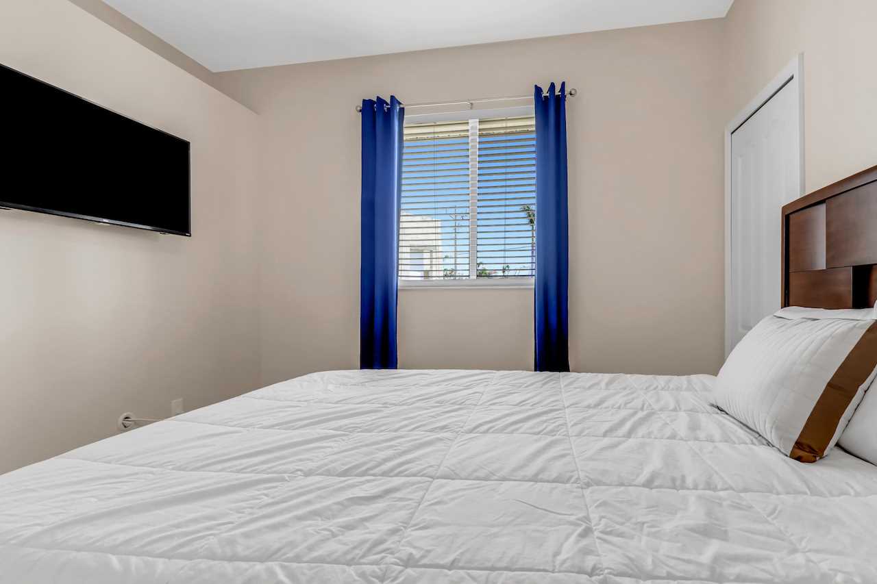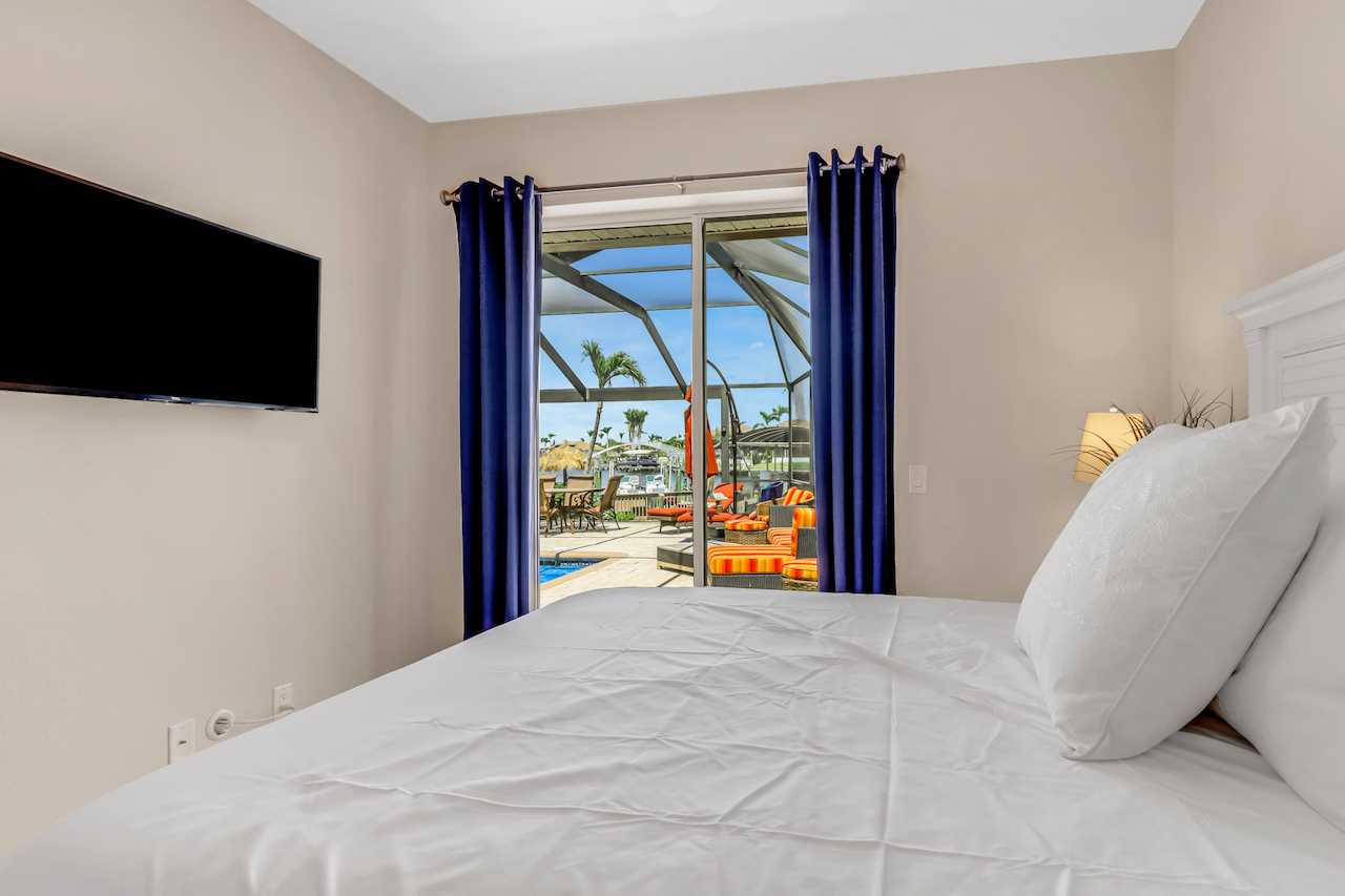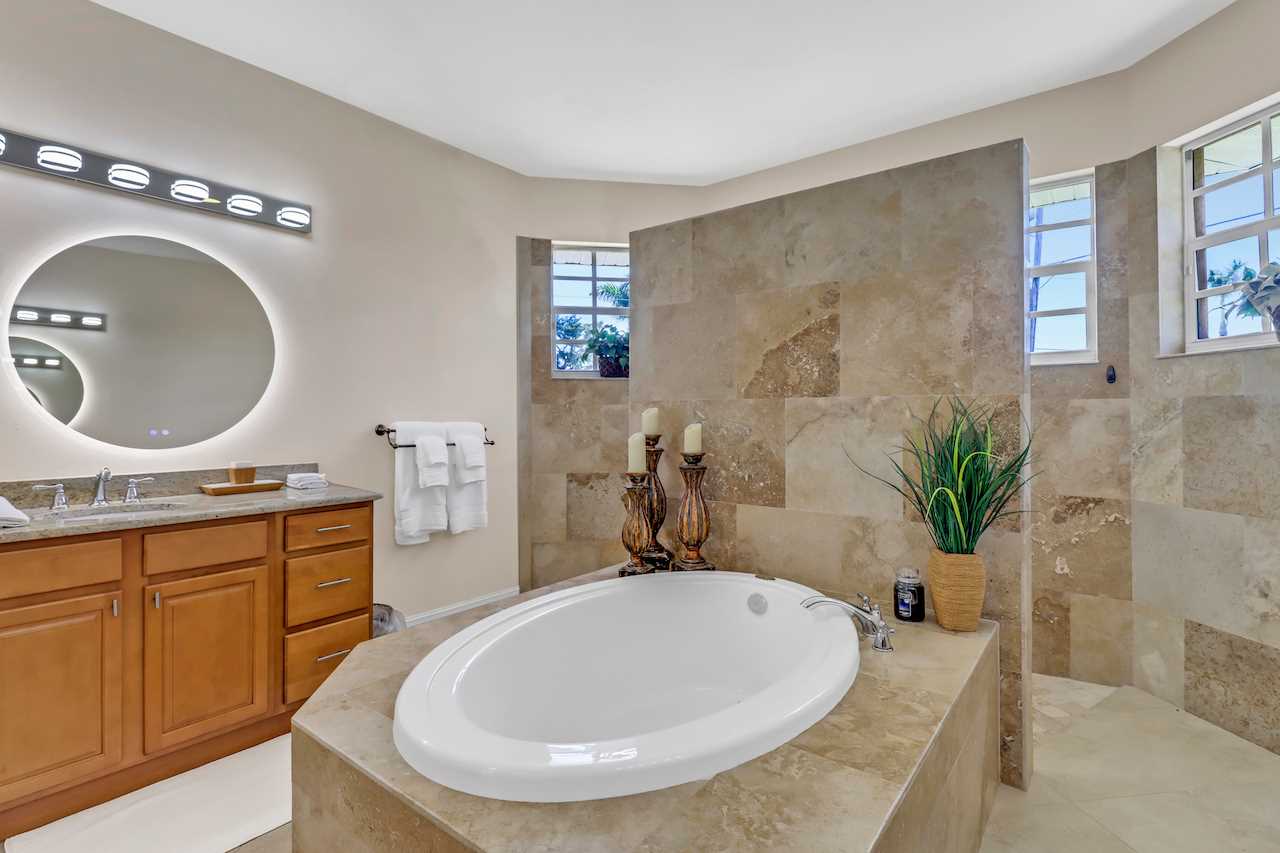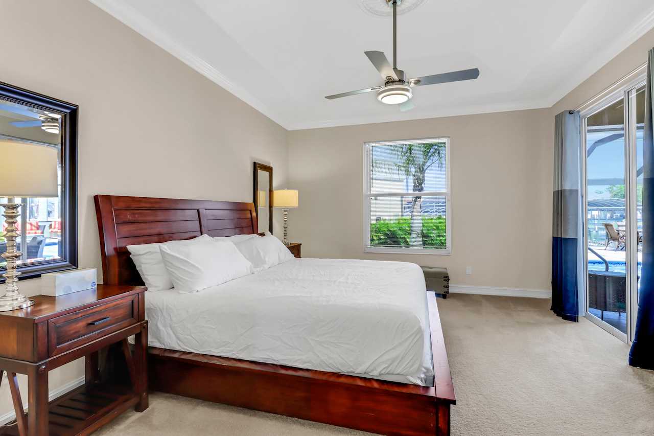 A luxurious 3 bedroom and 2 bathroom home with split floorpan putting the master suite on the northern side of the house. The Master Suite with King sized bed has direct access to the pool area, wall mounted ROKU TV and its own Master Bathroom with walk around shower and large tub. BOSE sound system to connect your phone to and enjoy your tunes is also provided in the Master Bathroom and can be moved.