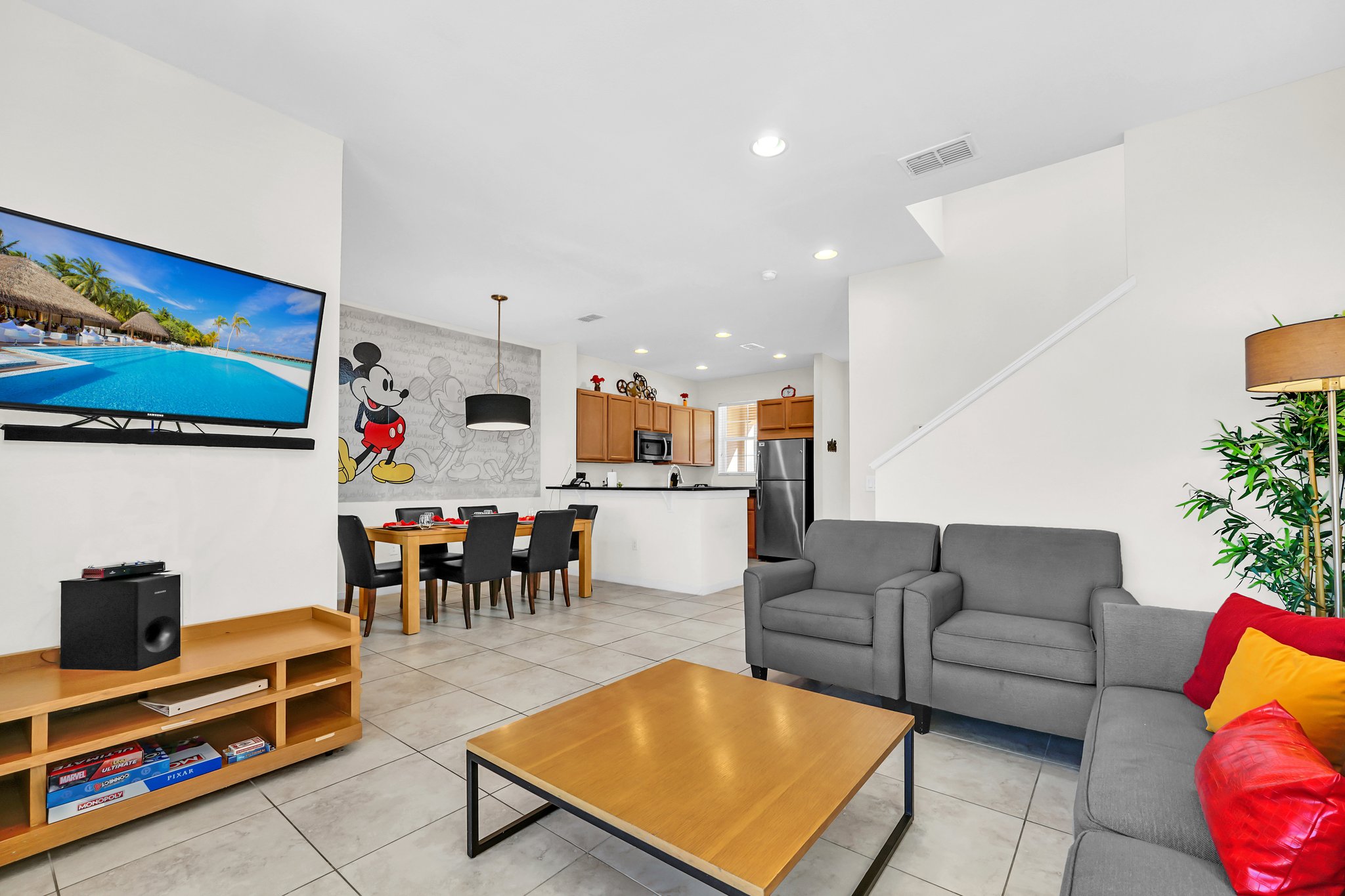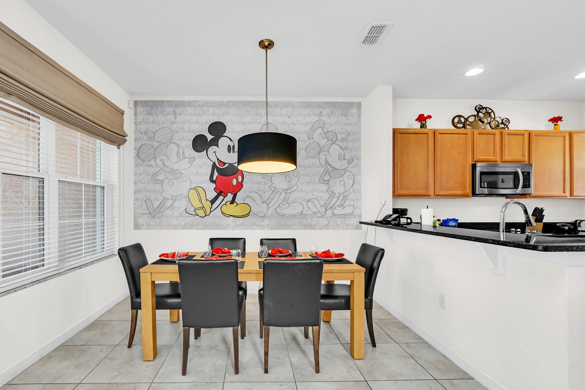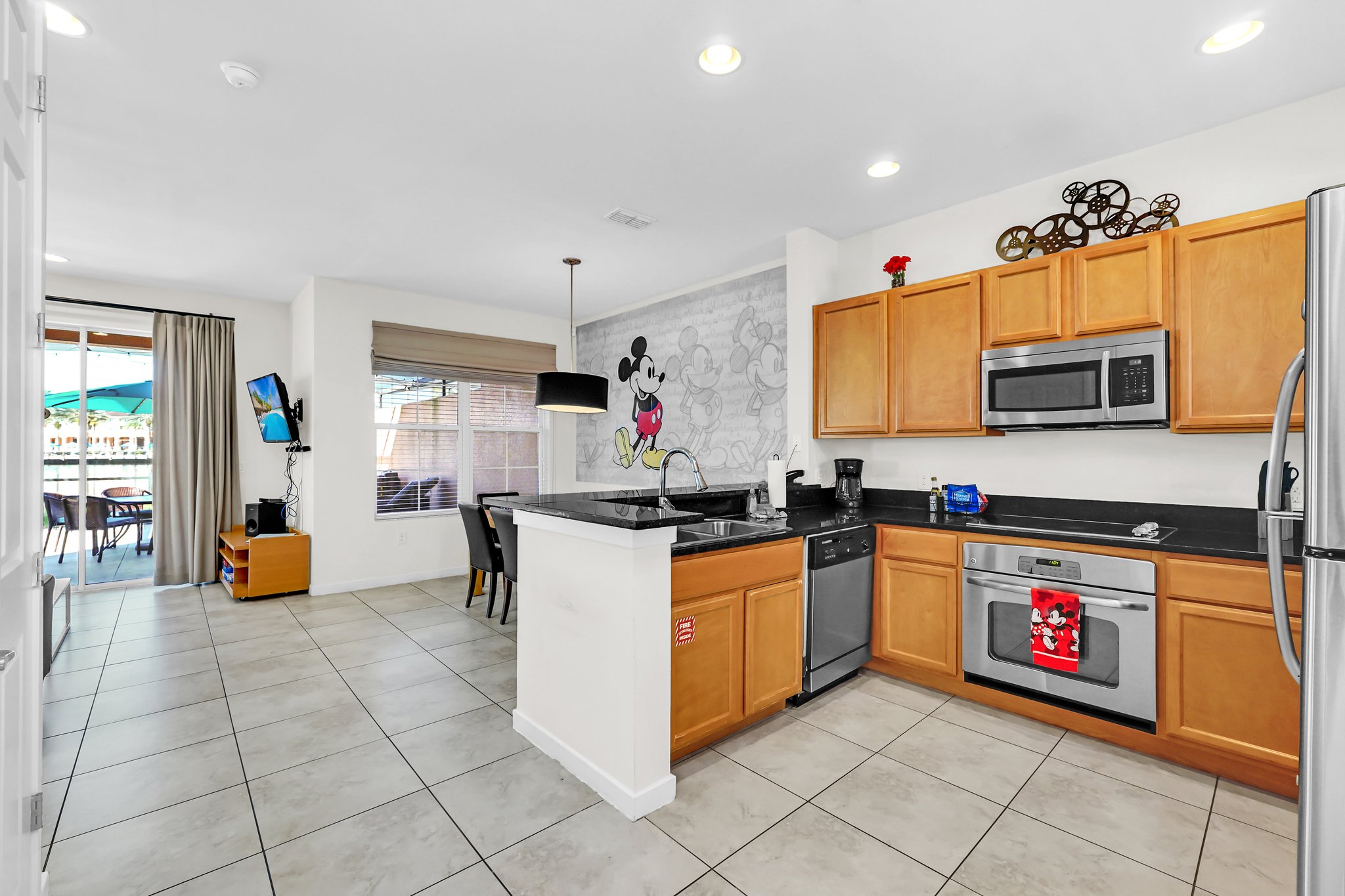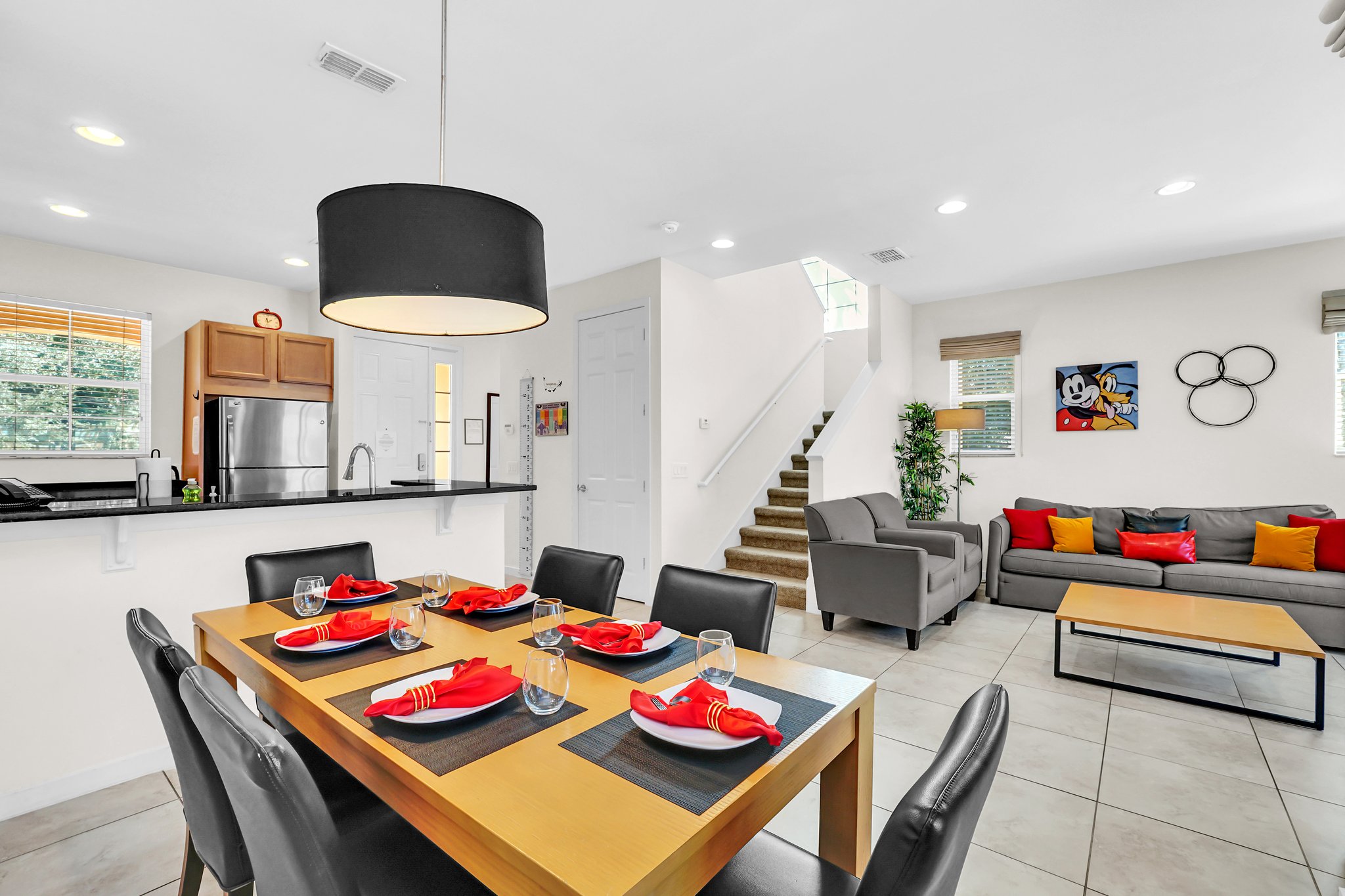 Nestled within the exclusive gated community, Regal Oaks in Kissimmee, FL lies a charming and spacious 3-bedroom, 2.5-bathroom townhome that provides the perfect blend of comfort and convenience for your magical getaway. As you step through the front door, you'll be greeted by a light, airy, inviting open-concept living space. On the main level, the living room offers a cozy retreat with ample seating that is perfect for unwinding after an exciting day at the nearby parks & attractions. The fully equipped kitchen features expansive granite countertops, stainless steel appliances, and all the necessary utensils to prepare delicious meals. The adjacent dining area seats 8 and is ideal for enjoying your culinary creations together or planning your next day's adventures.