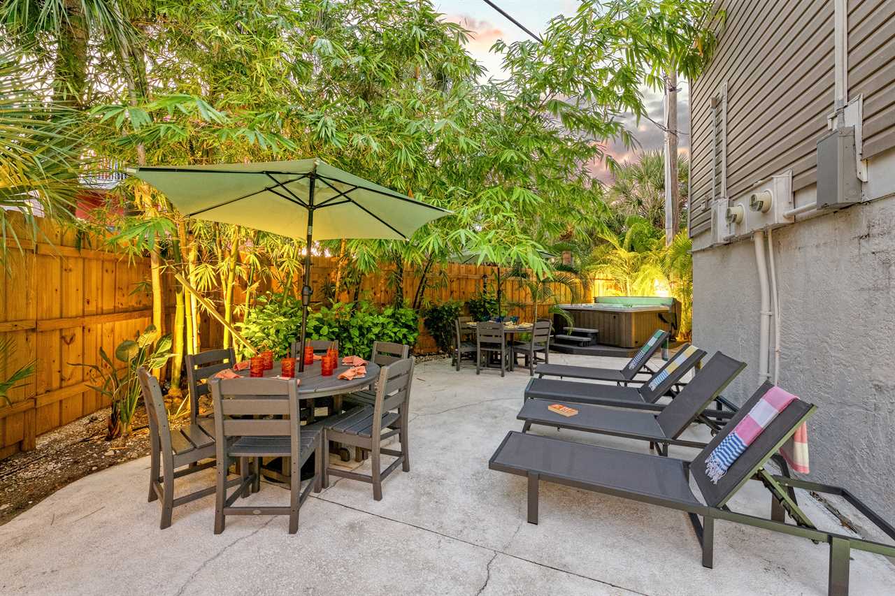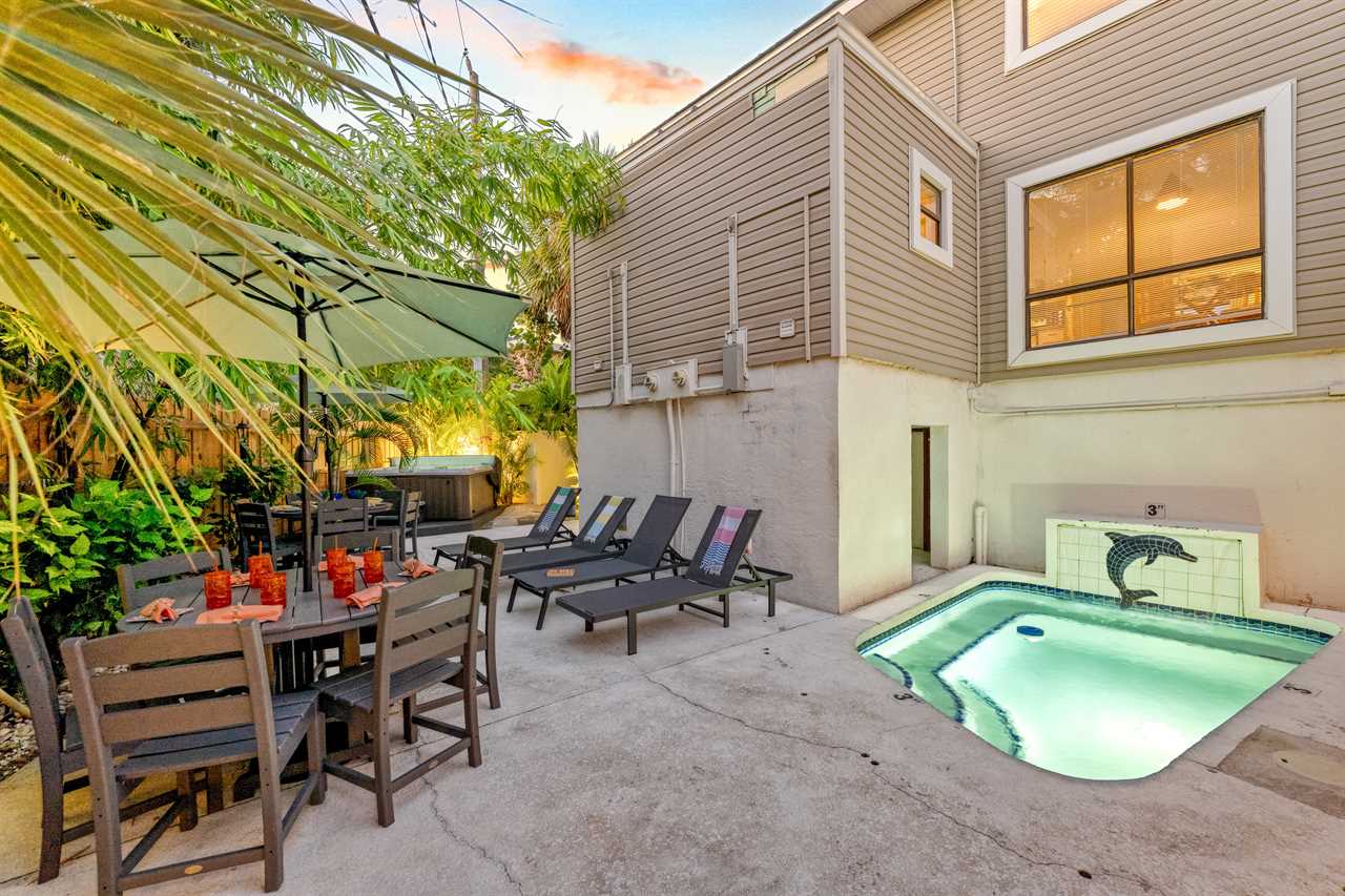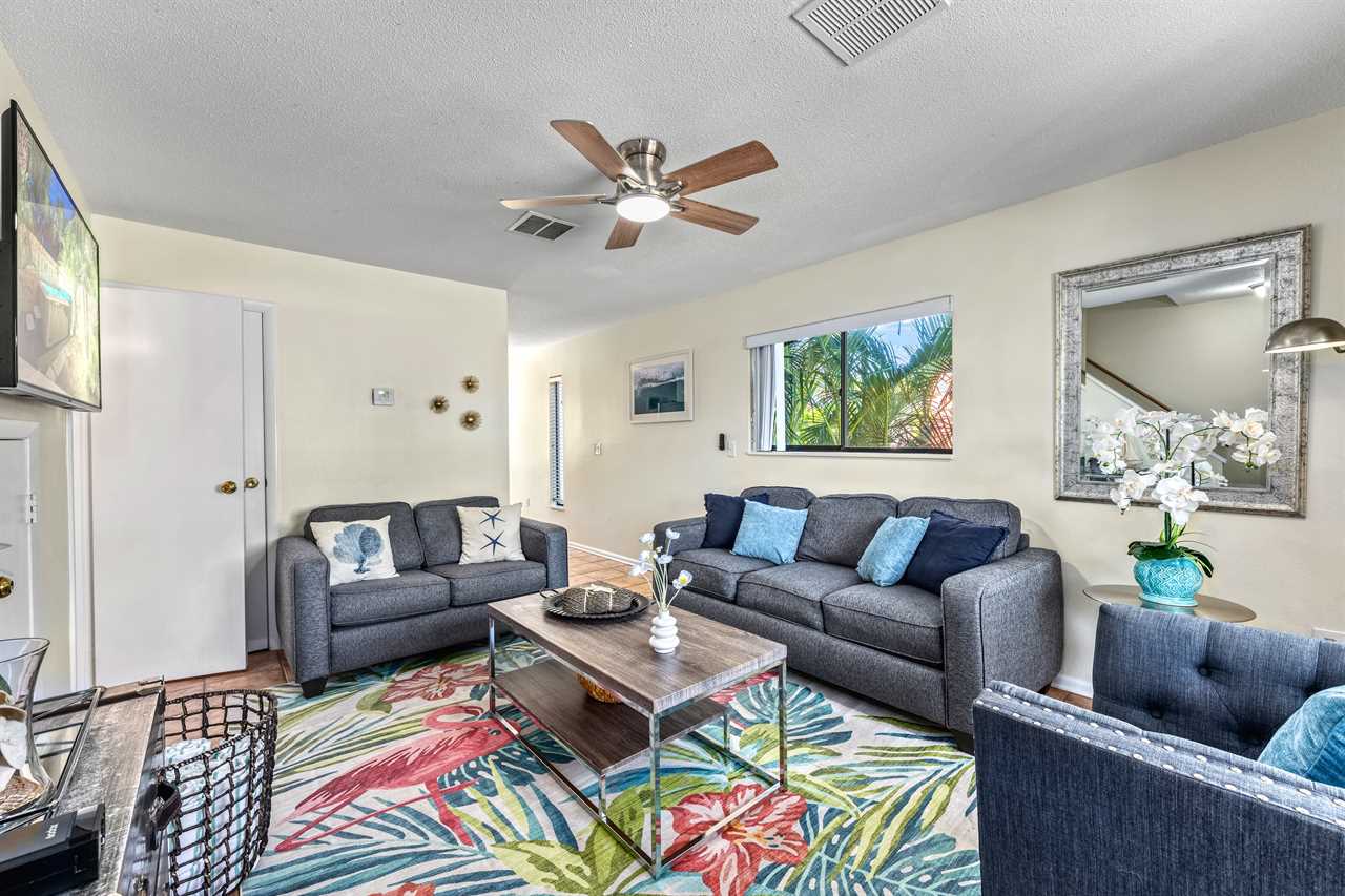 The village is alive with energy as you arrive—bike bells, café chatter, and the scent of coconut sunscreen in the air. You step inside Villa Fiesta and instantly feel at ease. The coastal-inspired living room invites you to kick off your flip-flops and stretch out on the sofa. Upstairs, sun-drenched bedrooms await, each designed for rest and recharge. After a lazy afternoon on Siesta Key's powder-white beach—just 0.3 miles away—you return to the shared backyard oasis. The grill sizzles, the hot tub bubbles, and laughter echoes as the sun dips below the palms. Every moment here feels light, bright, and unforgettable.
