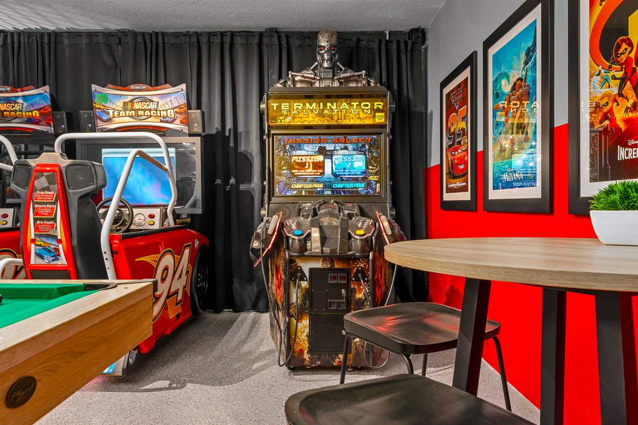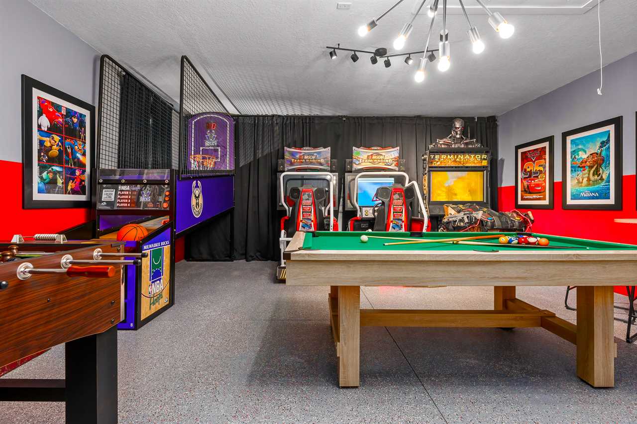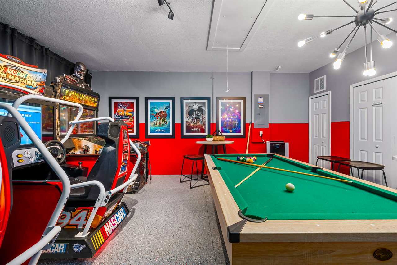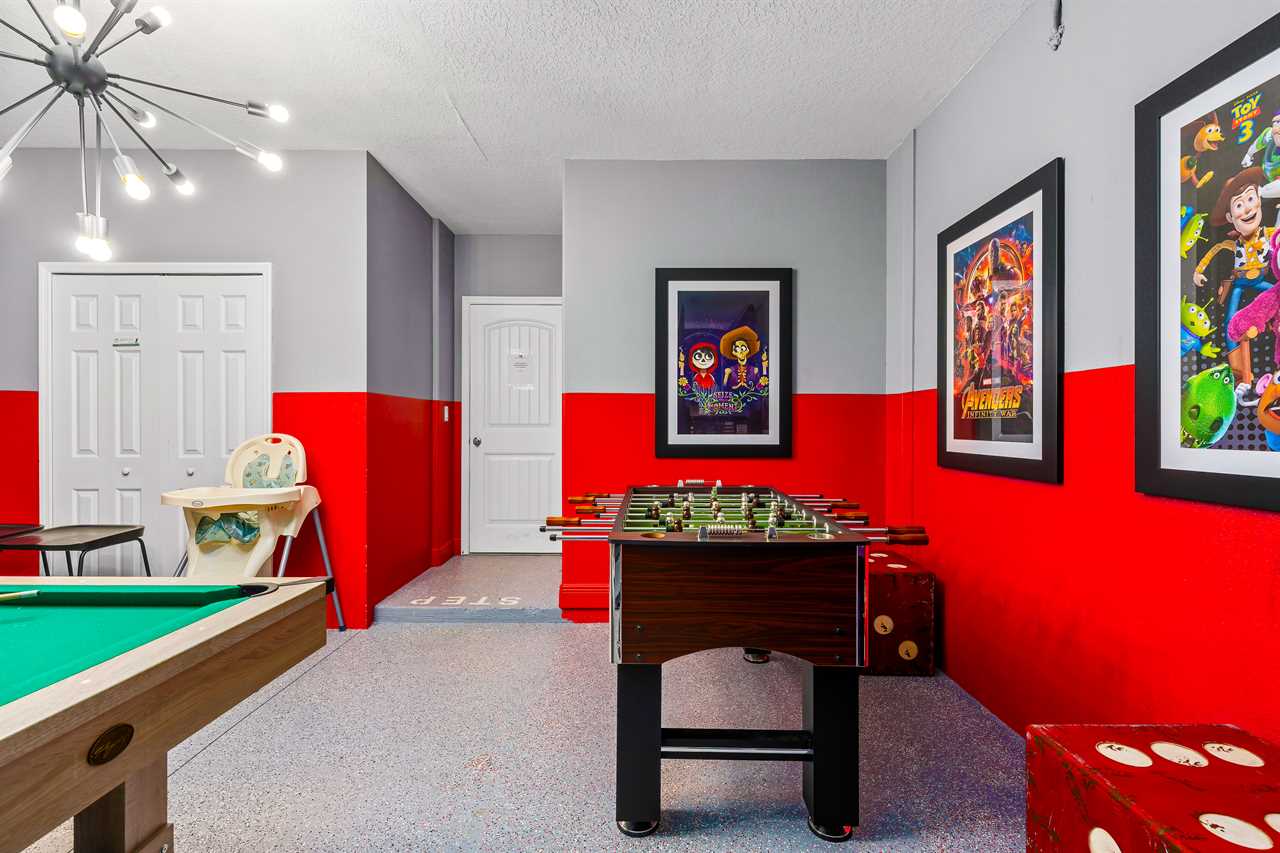 This home presents many exciting options for entertainment. There are two game rooms, one in the upstairs loft with an Xbox, two controllers, a large screen TV, and 3 large reclining chairs. This area also is perfect for watching movies in oversized recliners. The second game room on the lower level contains a pool table and a foosball table to keep the kids or adults occupied in the evenings.