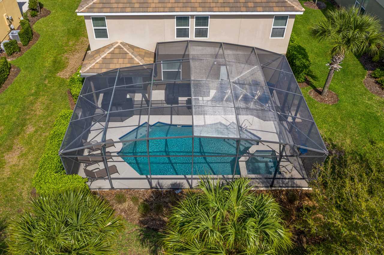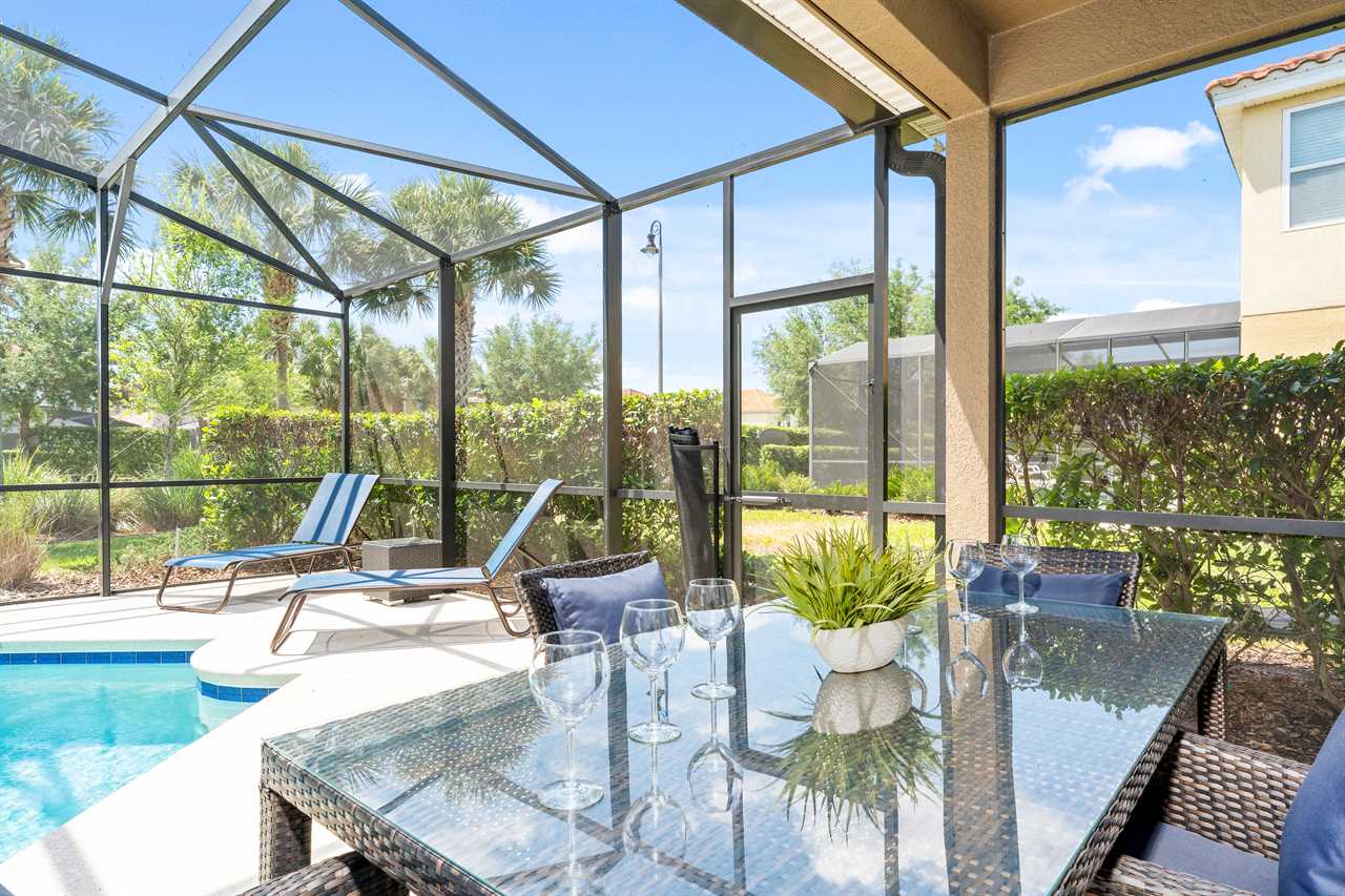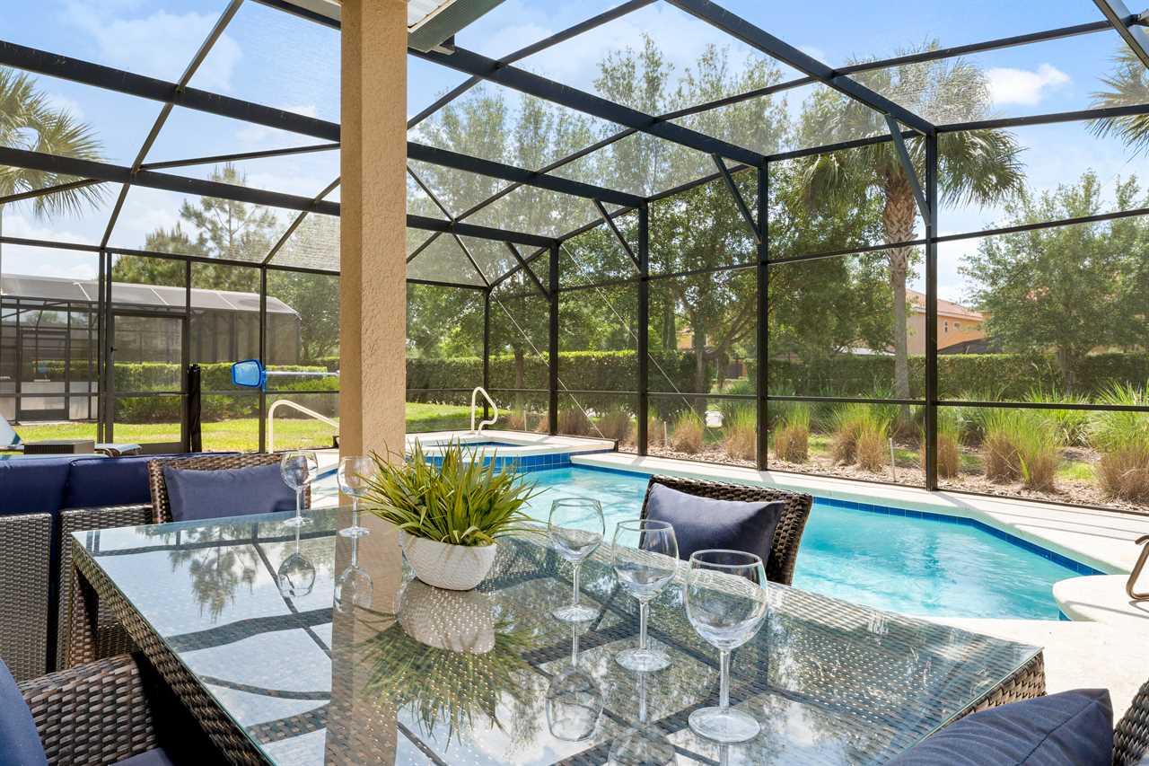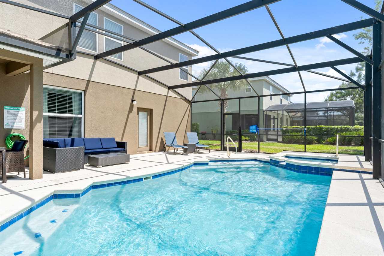The kitchen is fully equipped with stainless steel appliances and beautiful granite counters. The kitchen island seats 4 and the dining table has seating for 8. Open the sliding doors and extend the living area to the lanai and pool deck which is fully screened-in and includes sun loungers and patio furniture where you can enjoy Florida's sun. The pool and spillover spa are lighted for night swimming.