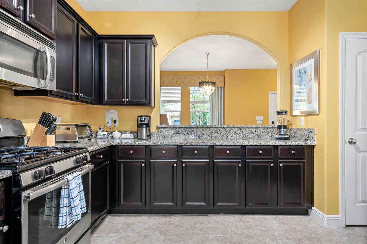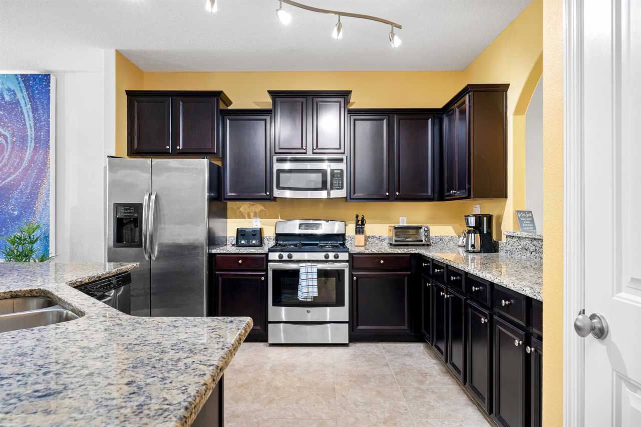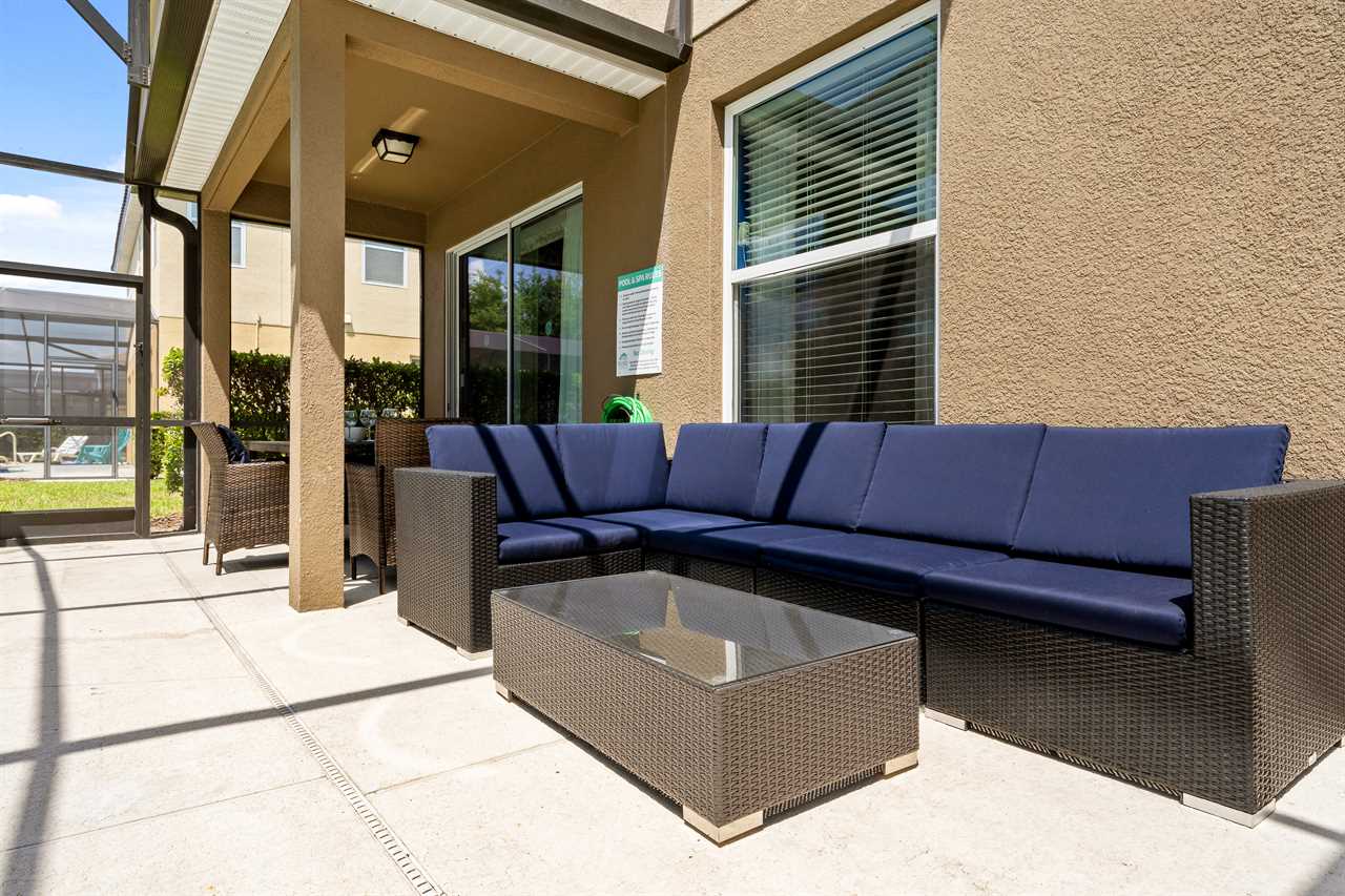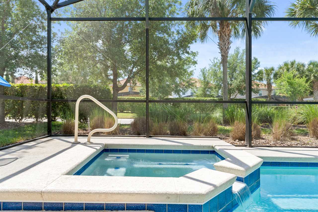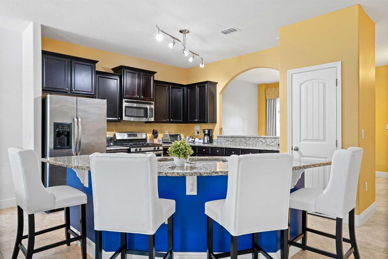The kitchen is fully equipped with stainless steel appliances and beautiful granite counters. The kitchen island seats 4 and the dining table has seating for 8. Open the sliding doors and extend the living area to the lanai and pool deck which is fully screened-in and includes sun loungers and patio furniture where you can enjoy Florida's sun. The pool and spillover spa are lighted for night swimming.