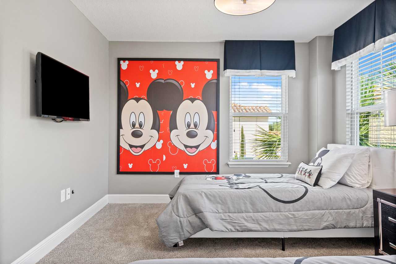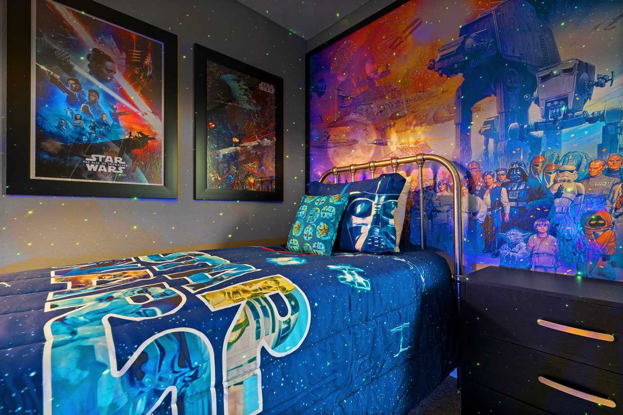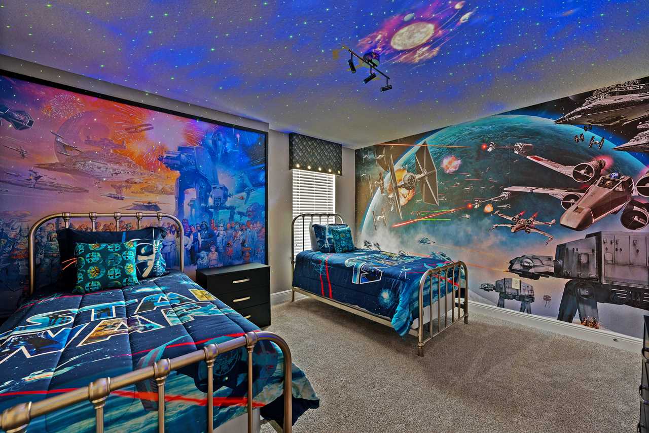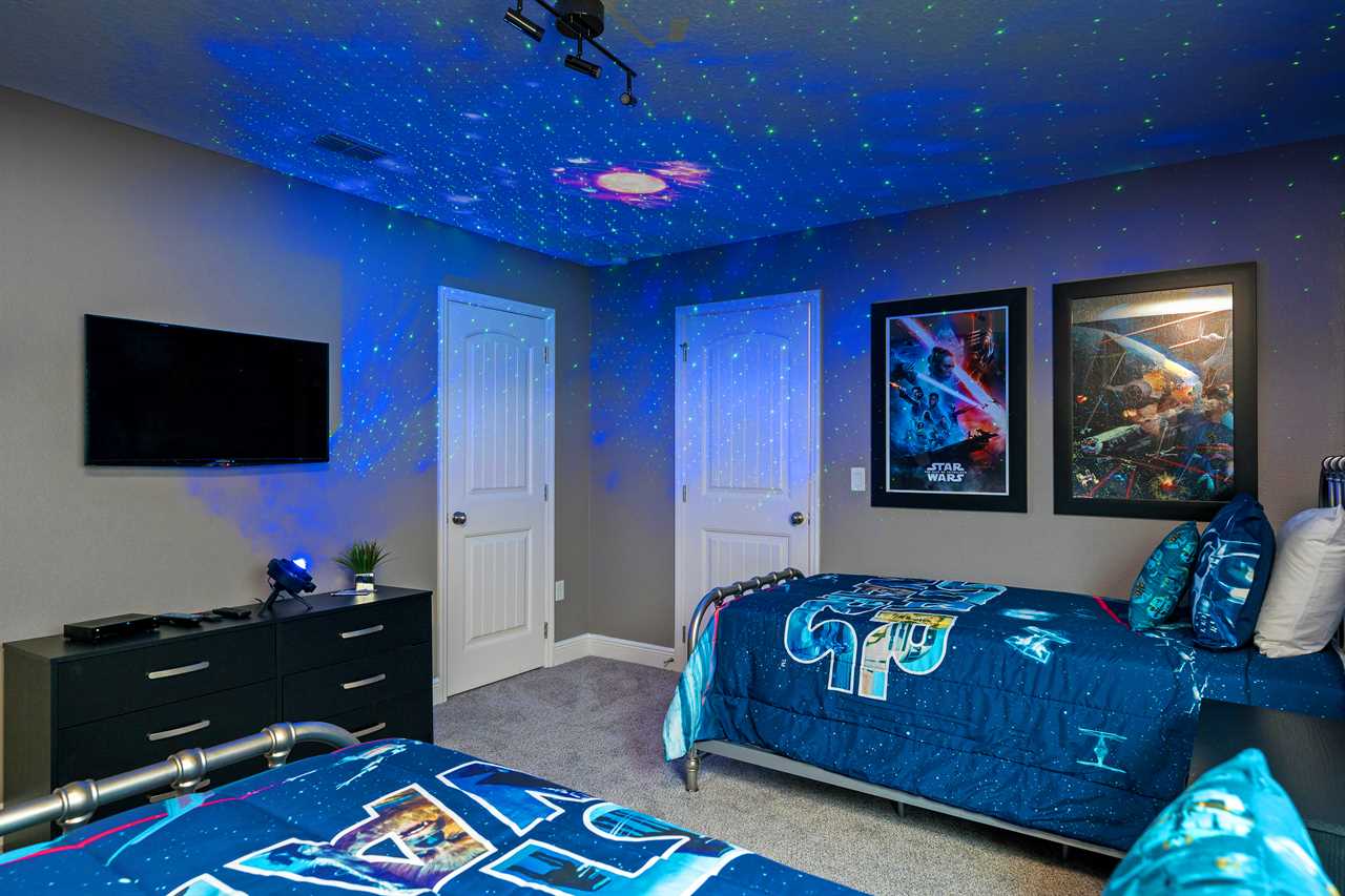 Every bedroom has its own TV so you can retire to your own favorite movie at the end of the day. The kids will love the themed bedrooms, each with two twin-sized beds. One bedroom has a space décor and the other is themed with a couple of our favorite cartoon characters. Special lighting in the space room projects the stars and constellations on the ceiling for an intergalactic effect.