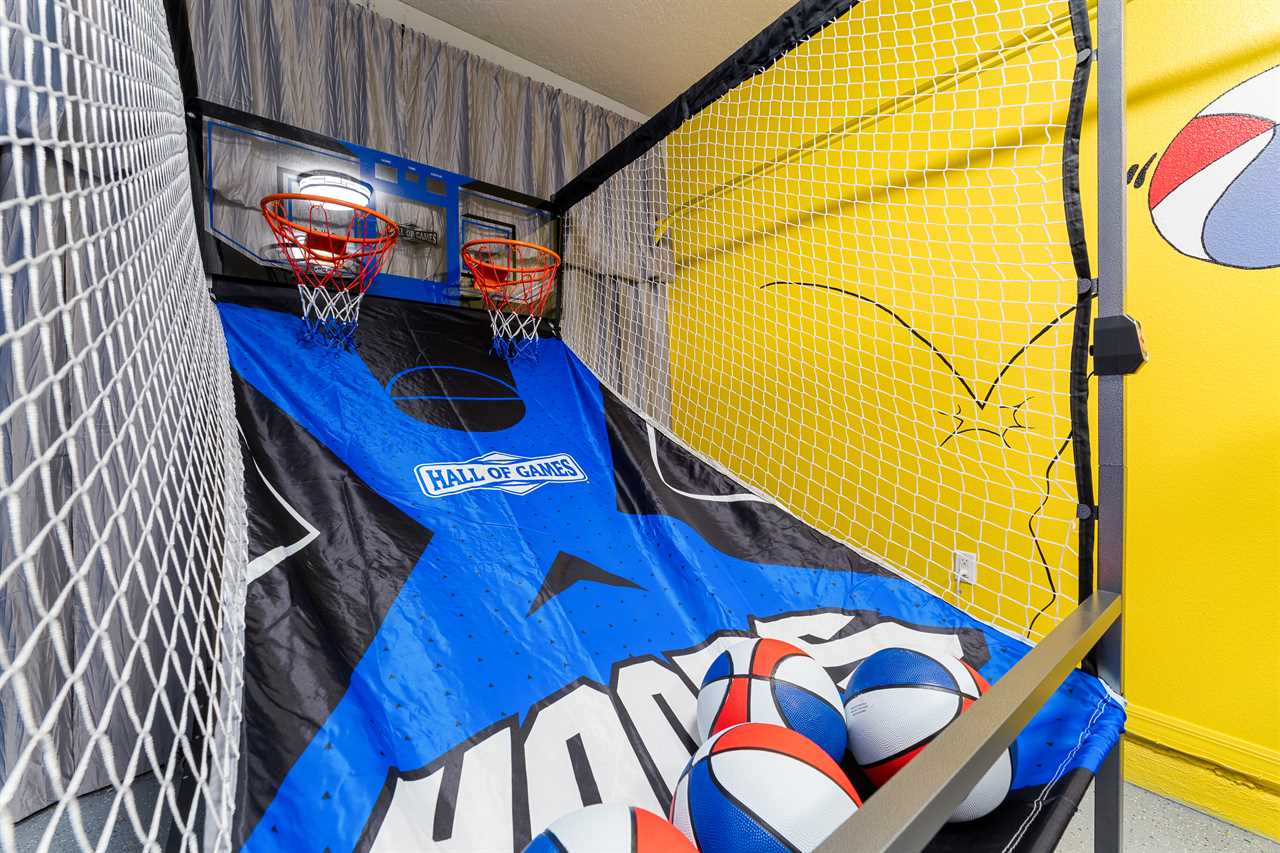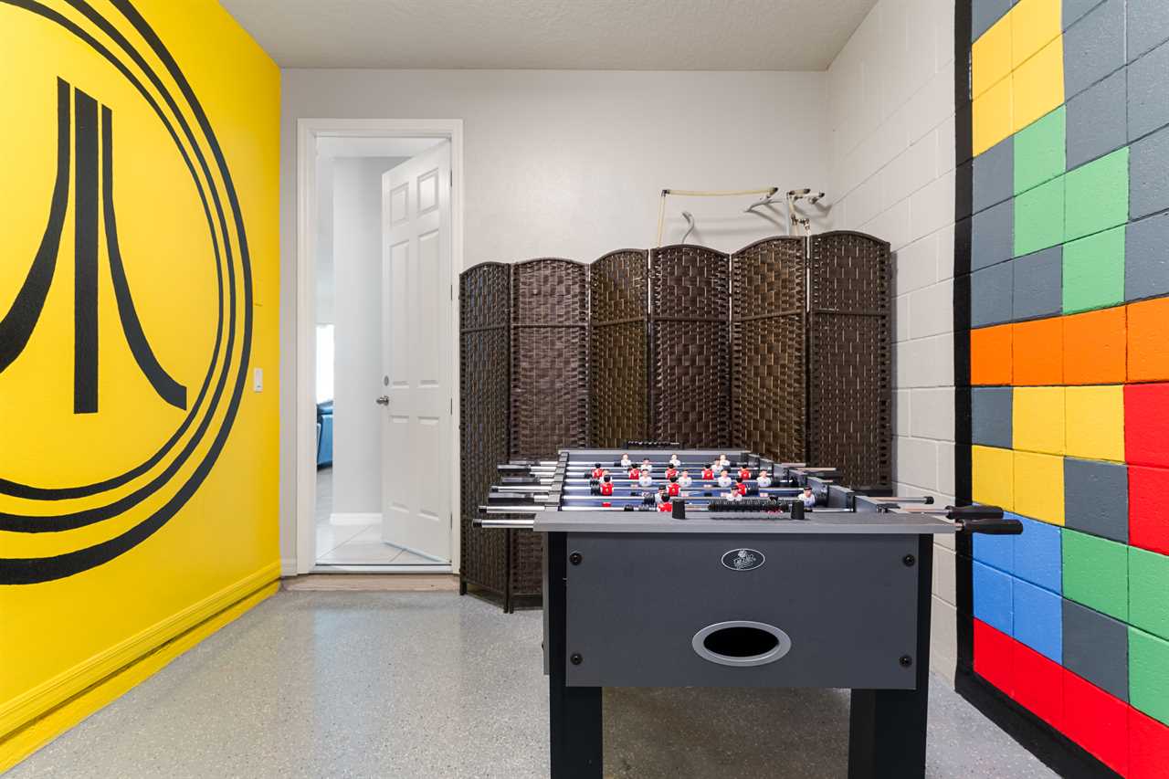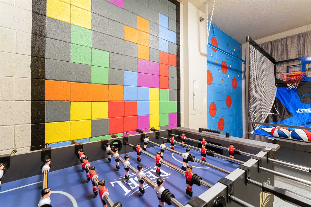 The garage has been converted into a game room with a foosball table, an arcade Atari game, and a pop-a-shot basketball. If you wish to relax before a favorite movie away from it all, there is a comfy wrap-around couch on the second-floor landing with a large wall-mounted TV.