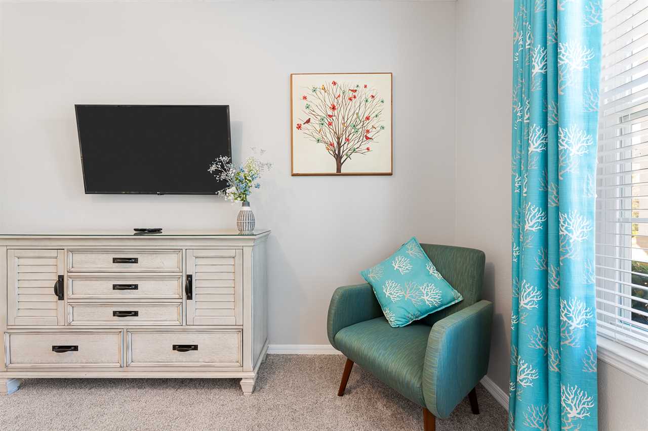 The great room includes a living area with comfy seating before a wall-mounted TV. A formal dining table seats 8, while there is additional bar stool seating for 4 by the kitchen counter. The kitchen itself comes with all stainless steel appliances and is fully equipped so you can enjoy home-cooked meals or reheat and store take-out.