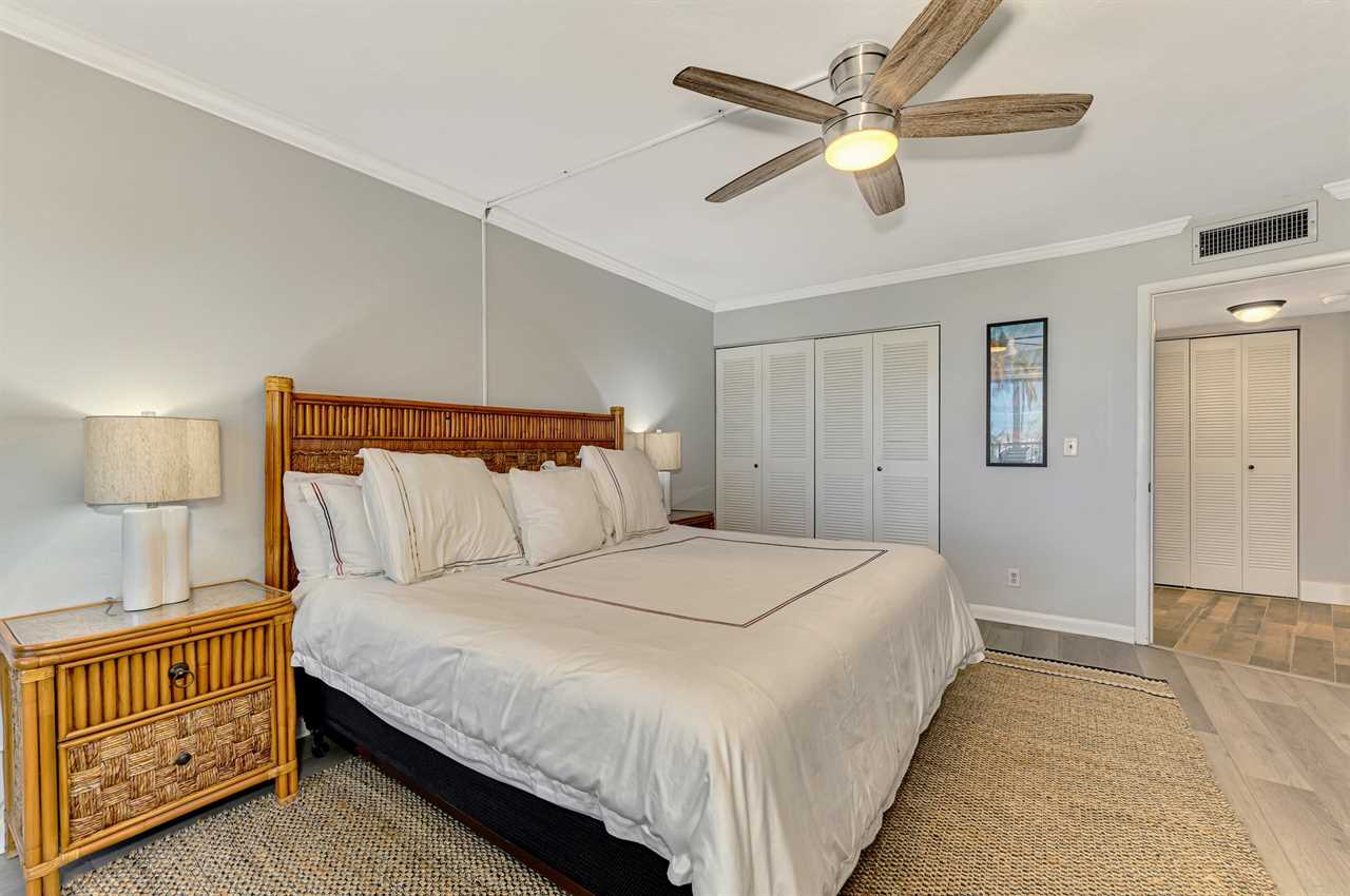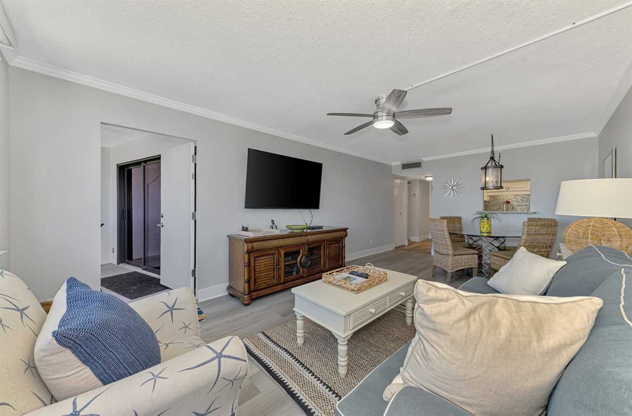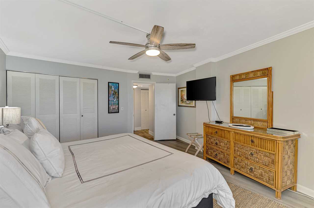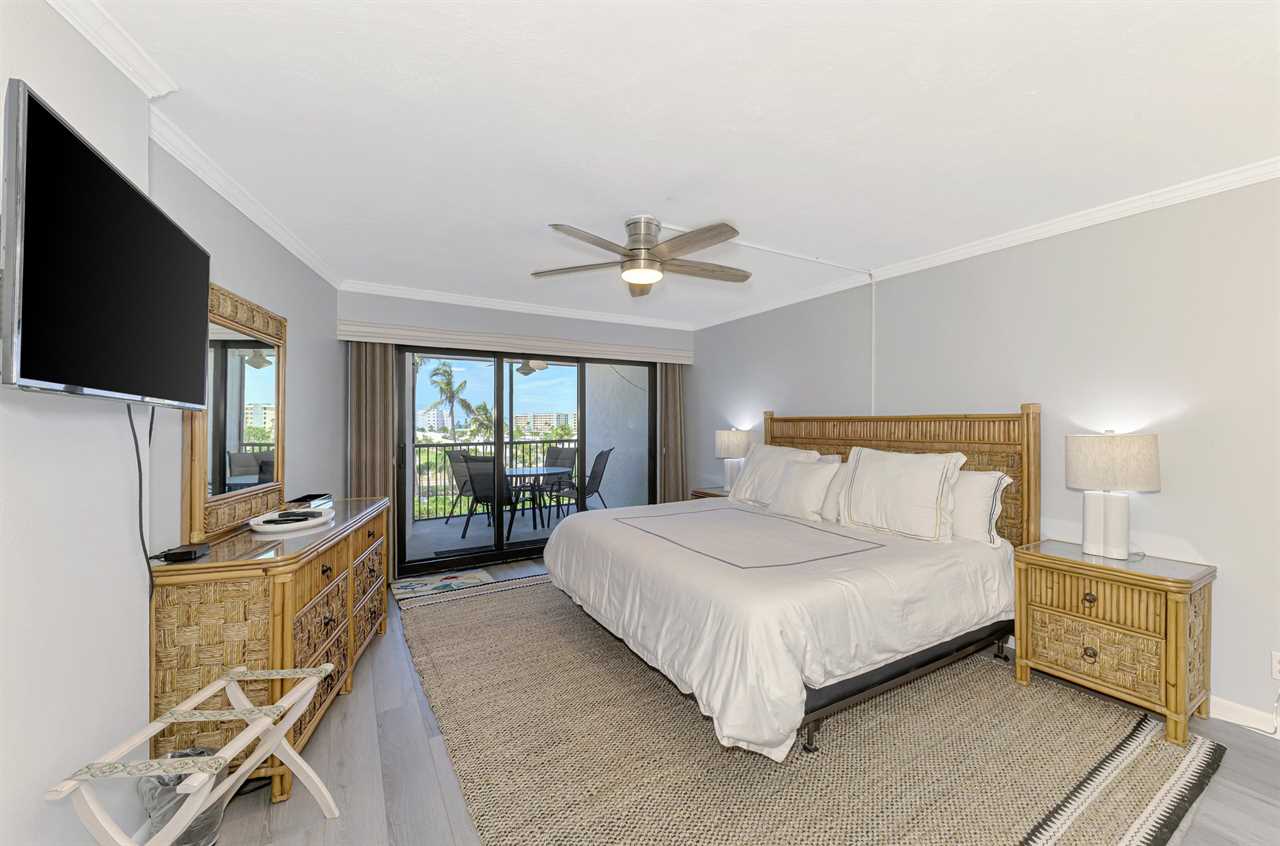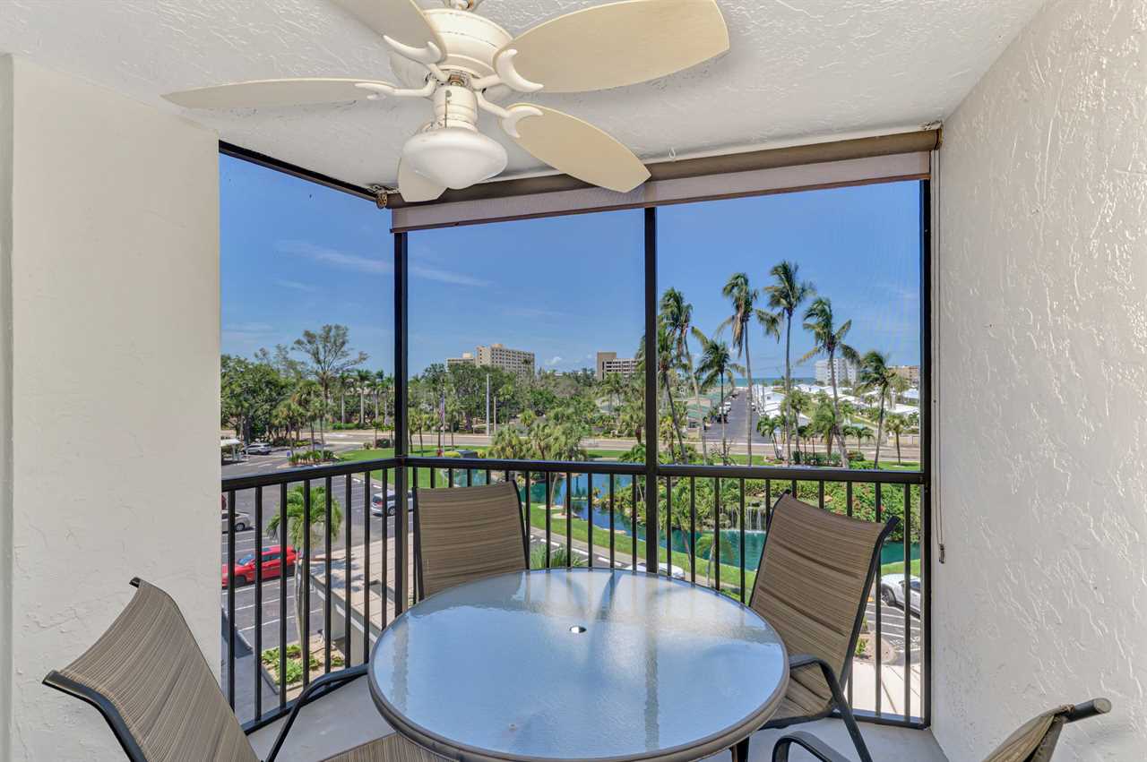 Condo #424 is located on the 4th floor at Harbor Towers Yacht & Racquet Club with a gulf view! This unit is a completely renovated, upgraded kitchen that is well-equipped. There is a new walk-in shower and fully renovated bathroom. The unit has new flooring, ceiling fans and fresh paint, all recently done. The condo comes fully stocked with all your towel needs. In the bedroom, you will find a king-size bed with new linens. Outdoor balcony off the living room and bedroom where you can enjoy an afternoon cocktail while watching the sunset. Lovely view of the lush landscape and waterfall, partial view of the gulf. Cable and hi-speed WIFI included. The unit has a pull-out sofa in the living room. We supply Beach Chairs, Umbrella, and rolling cooler for beach use.