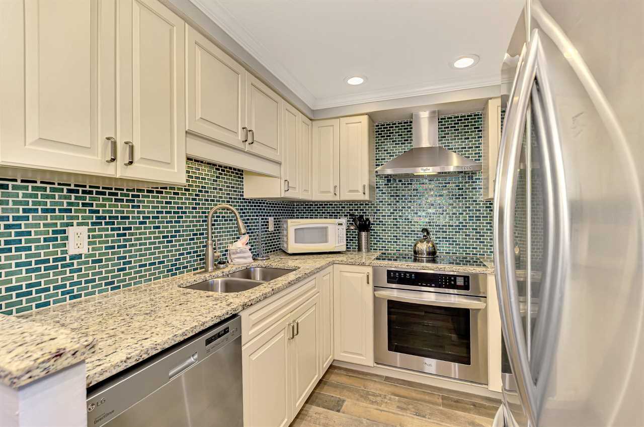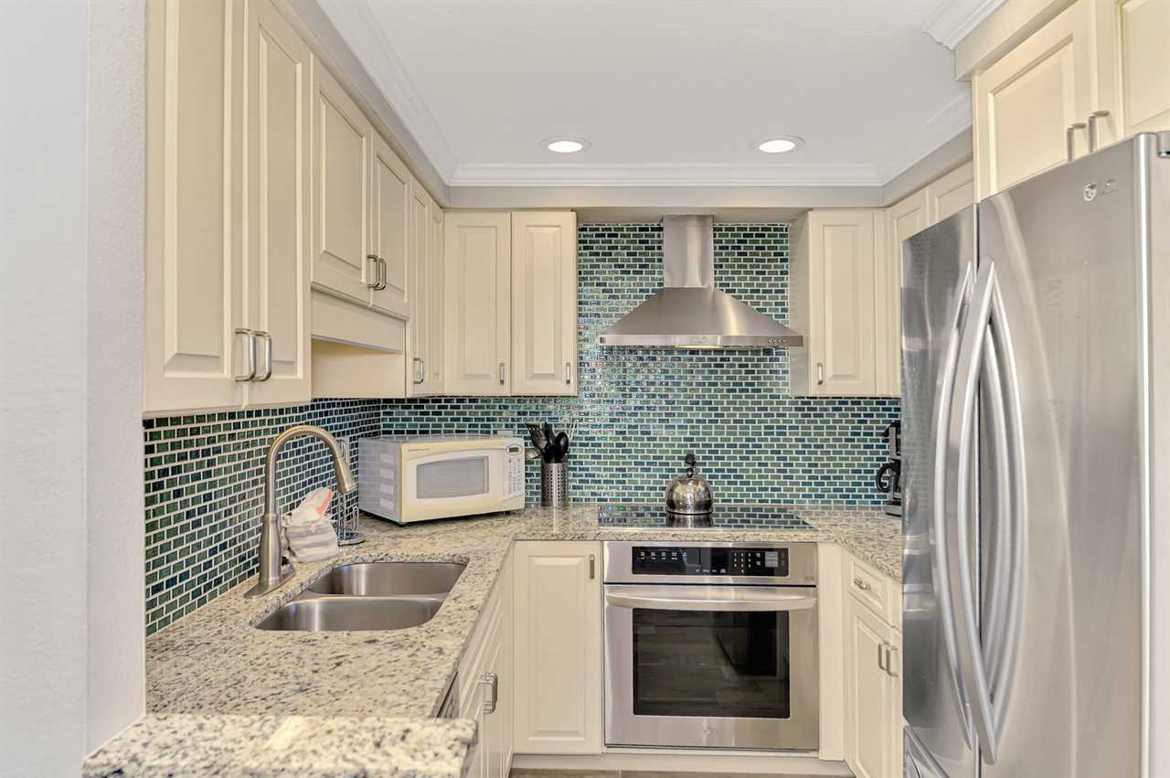 Fully equipped kitchen with dishes, silverware, cooking utensils, microwave, refrigerator, coffee maker, and stove.