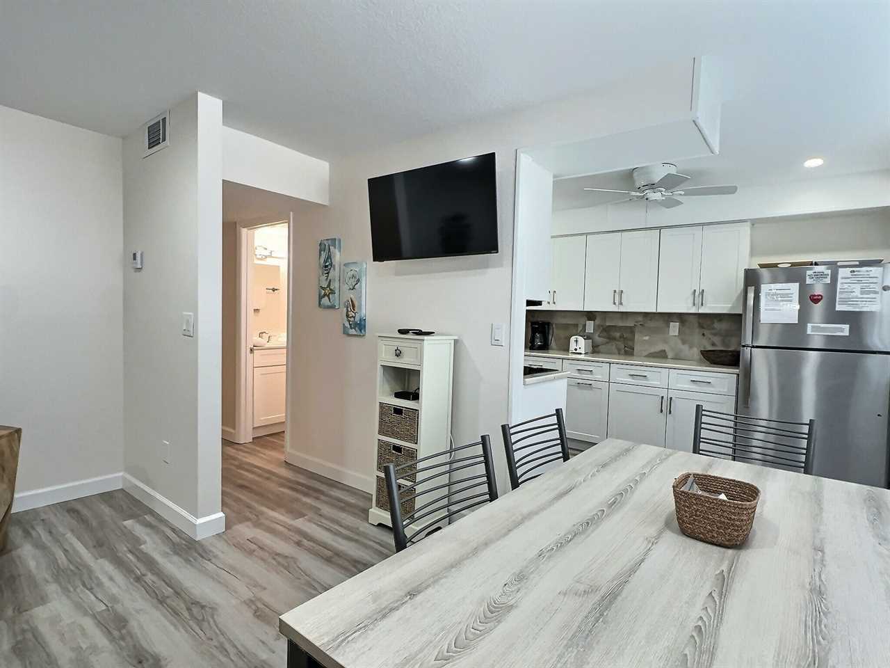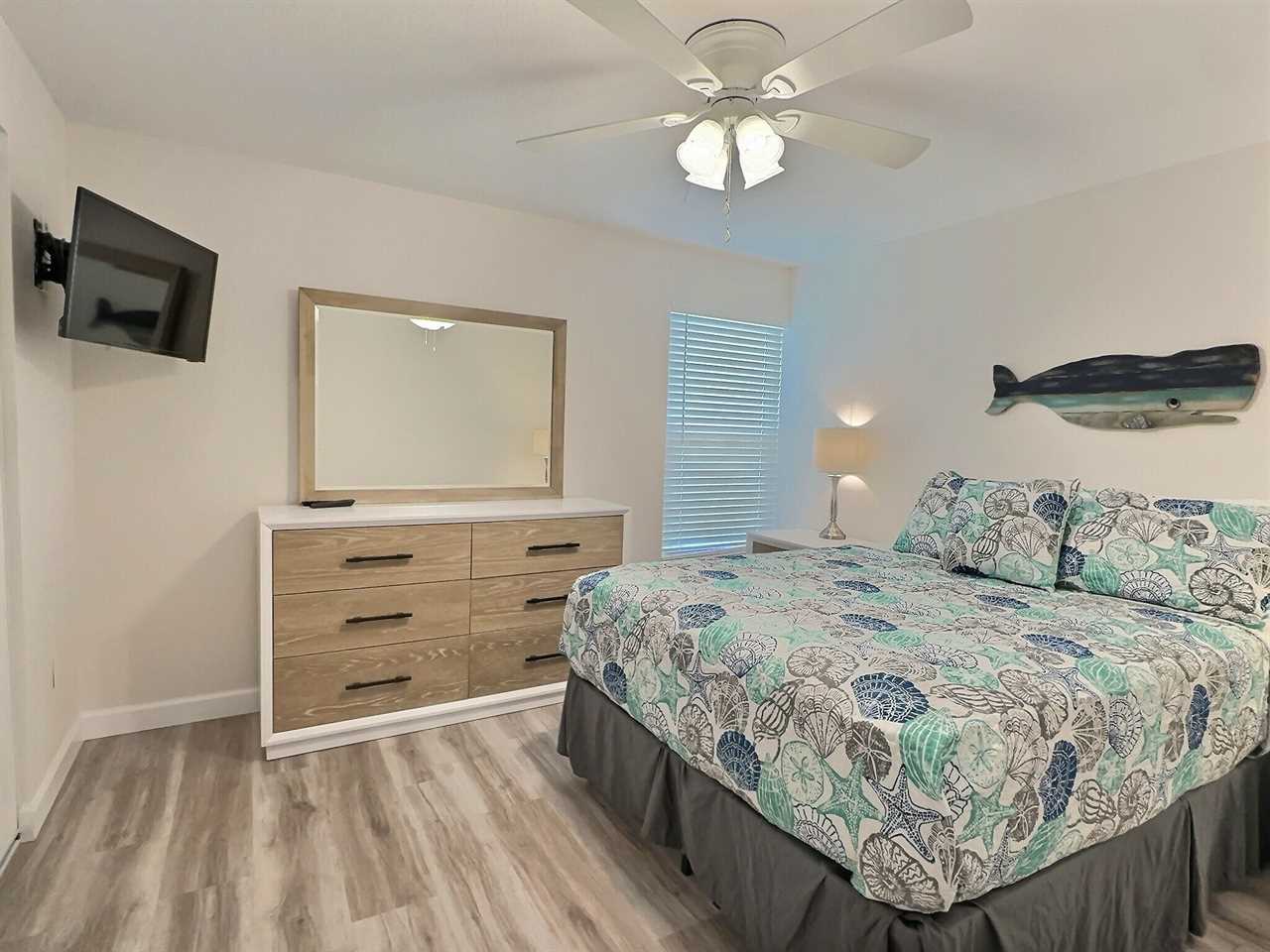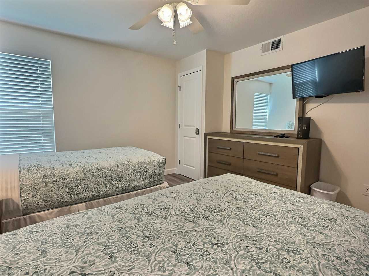 srepping into the unit you enter into the living room furnished with sofa, two reclining chairs, and a flat screen TV. The dining area offers seating for 6 overlooking the front gardens via large panel windows. Adjacent to the dining area you will find the small but clean and functional kitchen equipped with 4-piece appliance set among other small kitchen appliances. The kitchen is stocked for light to medium cooking needs, perfect for staying out of the busy restaurants a meal or two. Towards the rear of the unit you will come across two bedrooms, one of which is furnished with a queen-size bedroom set and the other with two twin-size beds. Both bedrooms offer ample closet space and twin bedroom is equipped with flatscreen TV. The two bedrooms share a central bathroom offering a tub/shower combo.