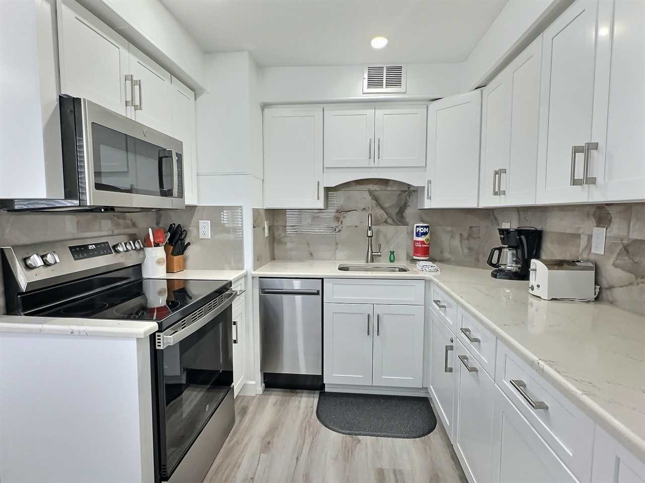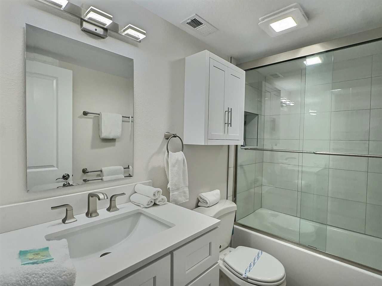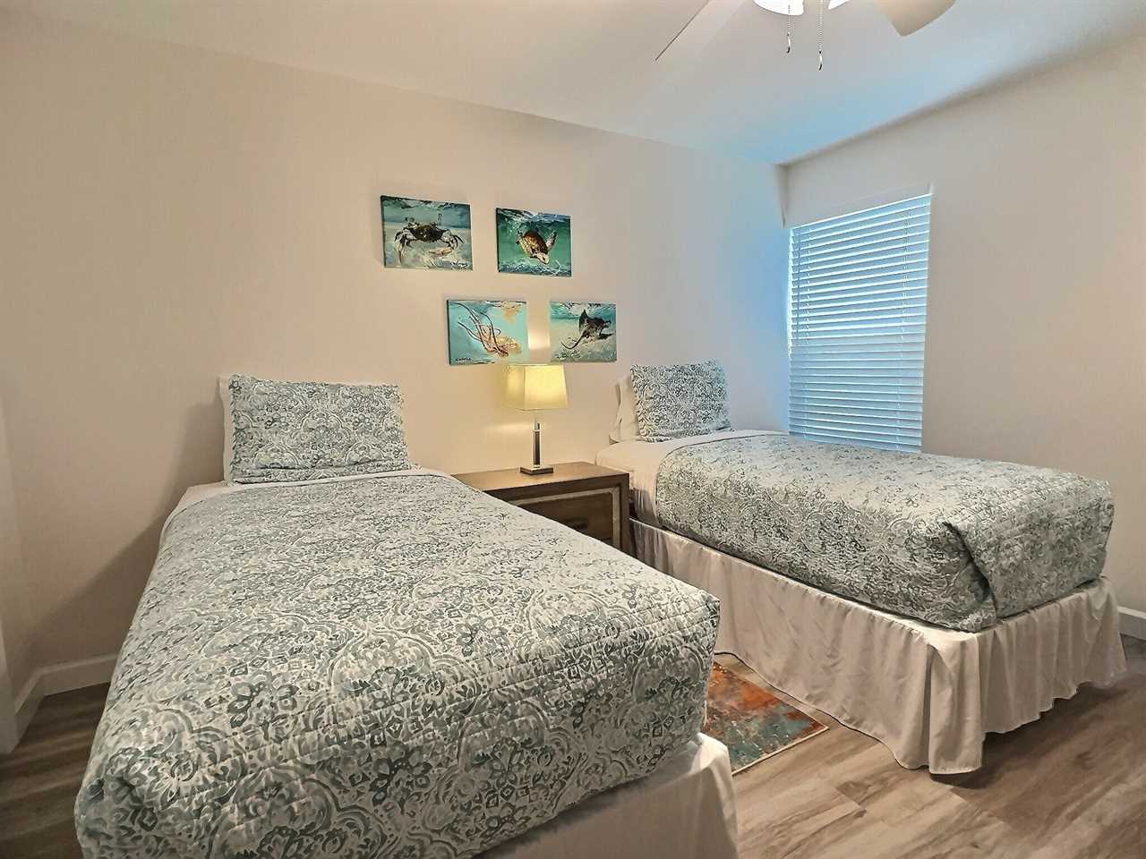 srepping into the unit you enter into the living room furnished with sofa, two reclining chairs, and a flat screen TV. The dining area offers seating for 6 overlooking the front gardens via large panel windows. Adjacent to the dining area you will find the small but clean and functional kitchen equipped with 4-piece appliance set among other small kitchen appliances. The kitchen is stocked for light to medium cooking needs, perfect for staying out of the busy restaurants a meal or two. Towards the rear of the unit you will come across two bedrooms, one of which is furnished with a queen-size bedroom set and the other with two twin-size beds. Both bedrooms offer ample closet space and twin bedroom is equipped with flatscreen TV. The two bedrooms share a central bathroom offering a tub/shower combo.