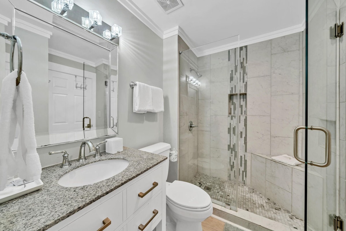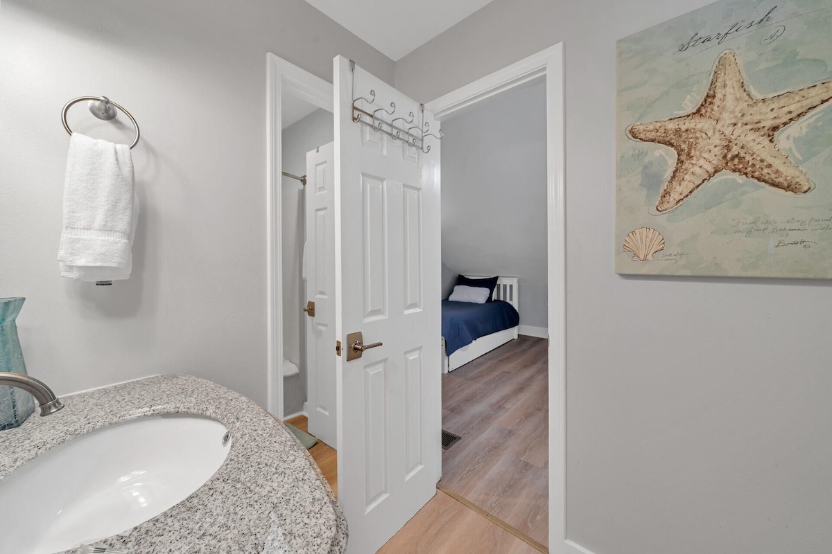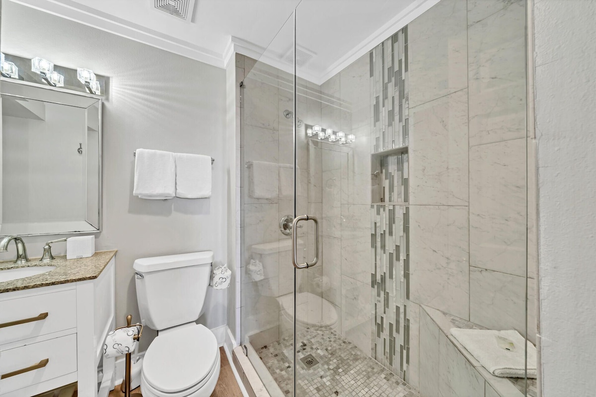 The updated kitchen has stone countertops, a beautiful white backsplash, and stainless steel appliances. Our dining room table seats four and is separated from the kitchen by a breakfast bar that seats five.