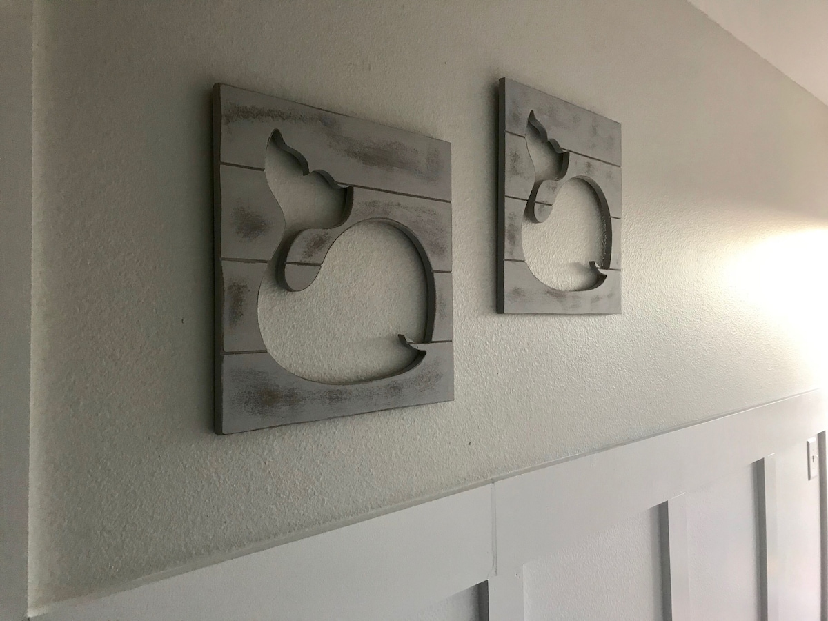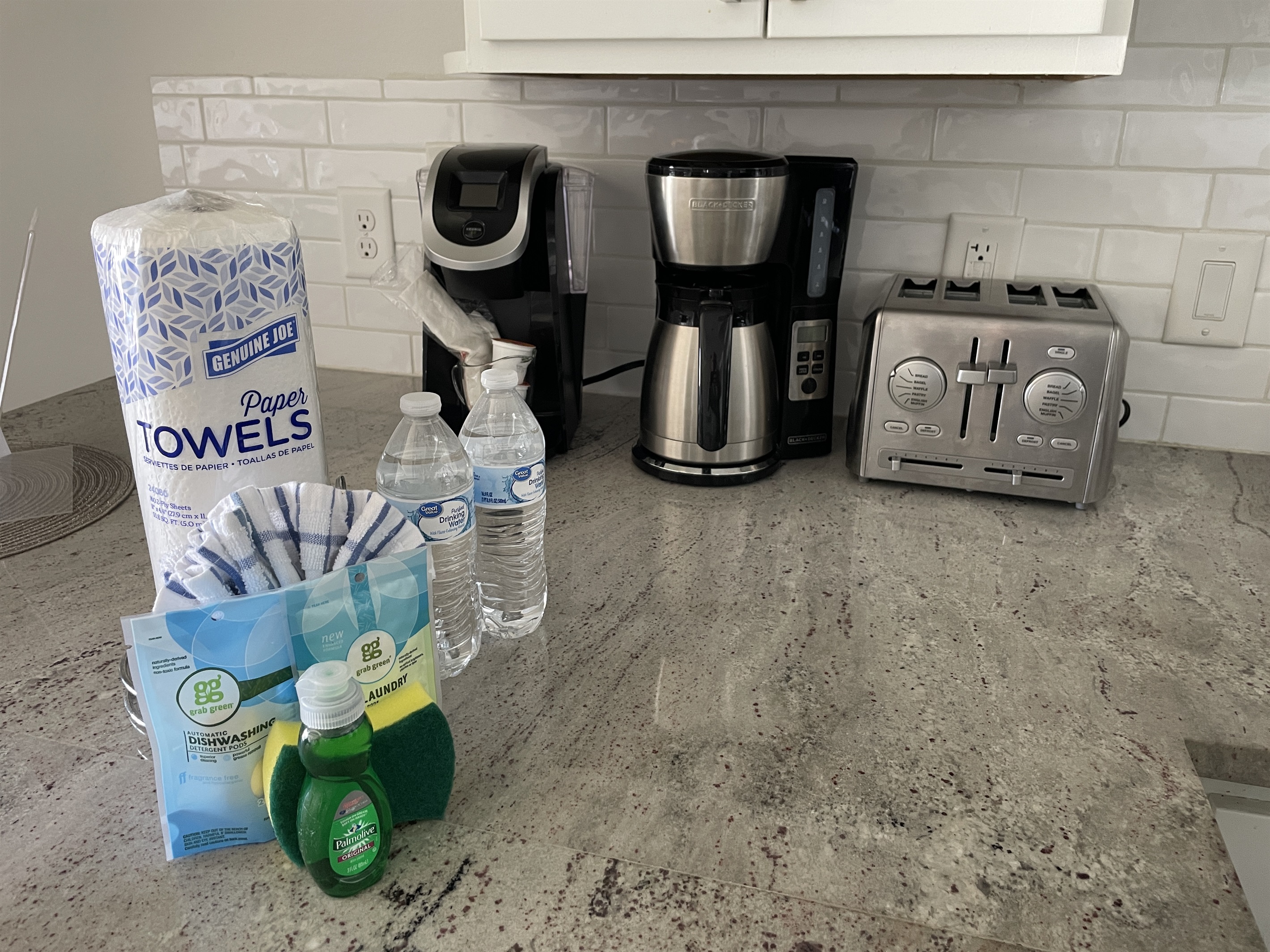 Your welcome package will have startup supply of bottled water, coffee, toilet papers, travel size shampoo, hand soaps in both bathrooms, paper towel, dish liquid, new dish sponge, dishwasher(2) and laundry(2) tablets.