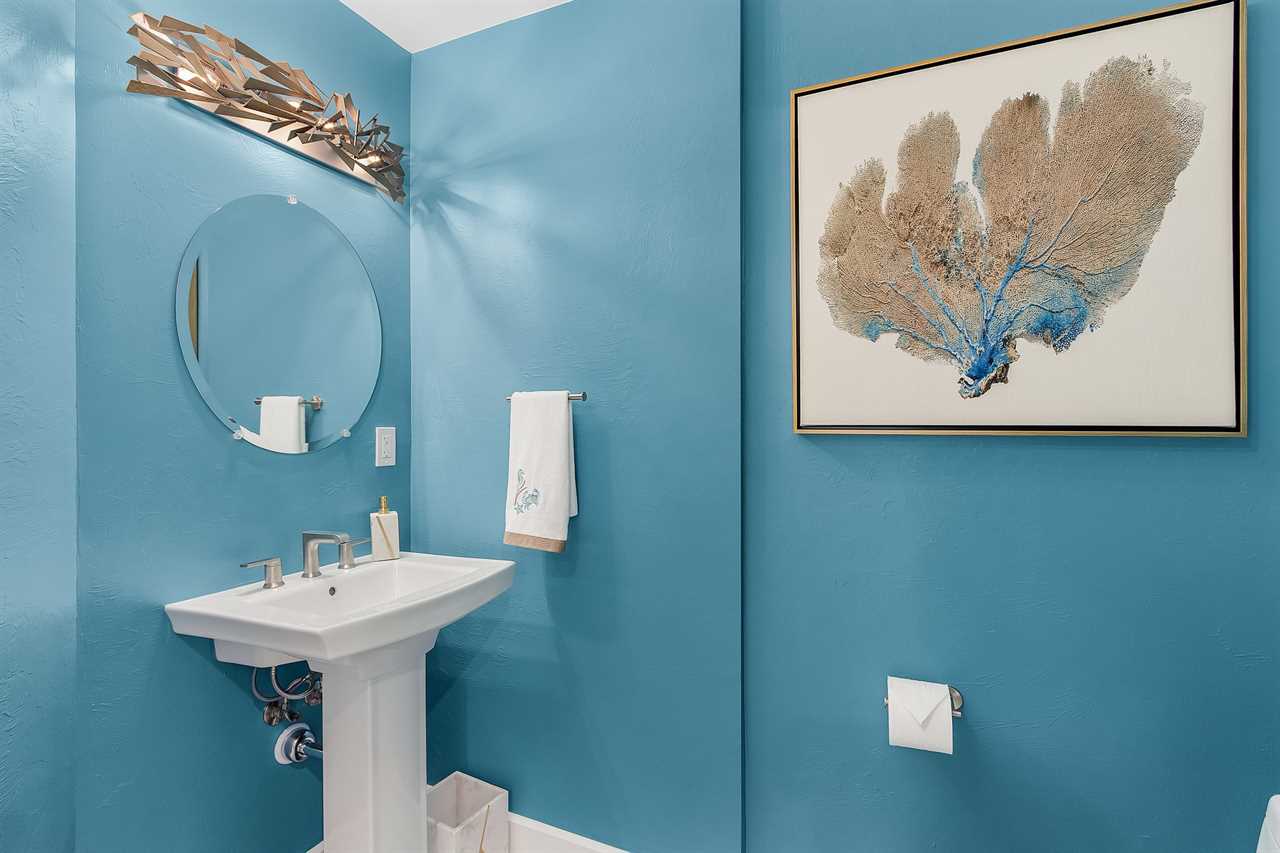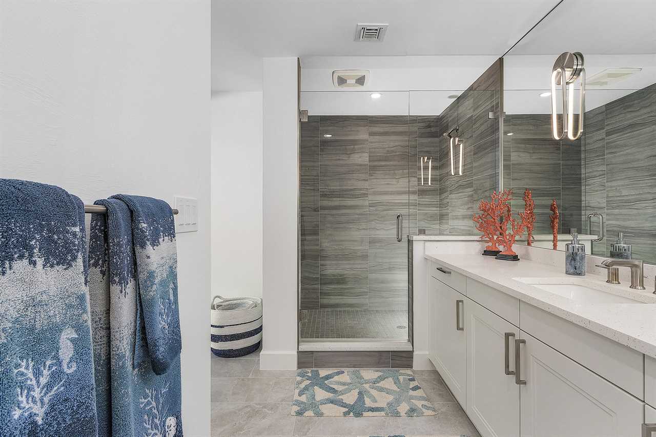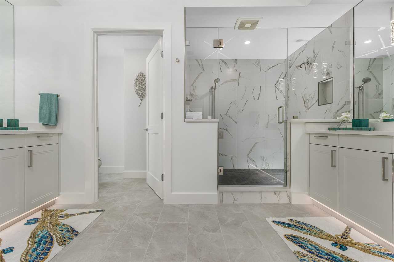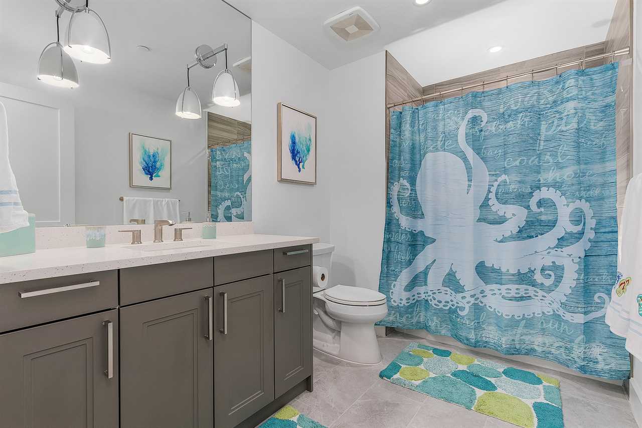 The master bedroom is a sanctuary of opulence, featuring a king-sized bed and an ensuite bathroom that rivals a spa retreat. The ensuite is equipped with his and her sinks, ensuring convenience and luxury, and a generously sized walk-in shower. The guest bedrooms are equally inviting, with one boasting a king-sized bed and the other featuring two twin beds. Each bedroom has its dedicated bathroom, ensuring privacy and convenience for all guests.