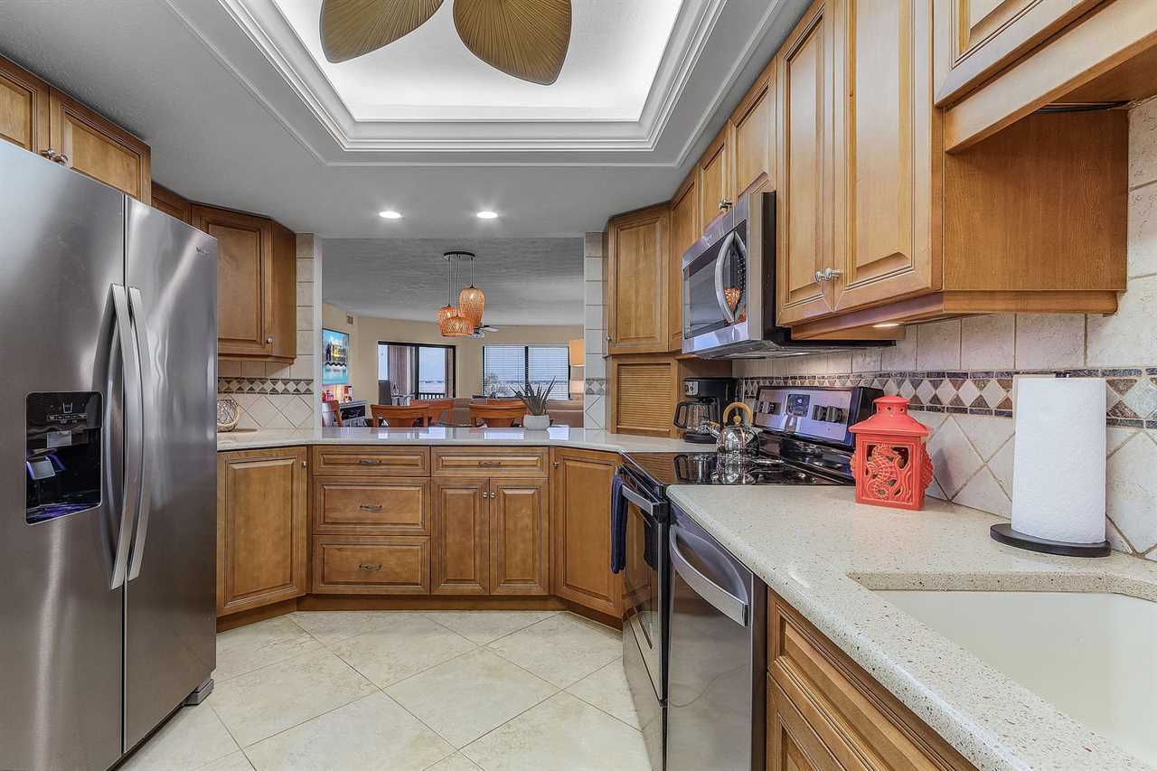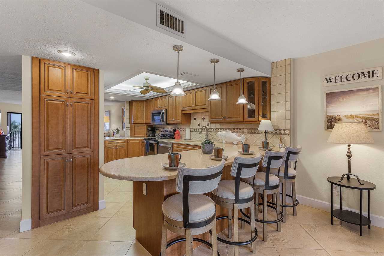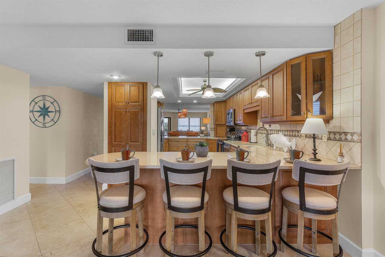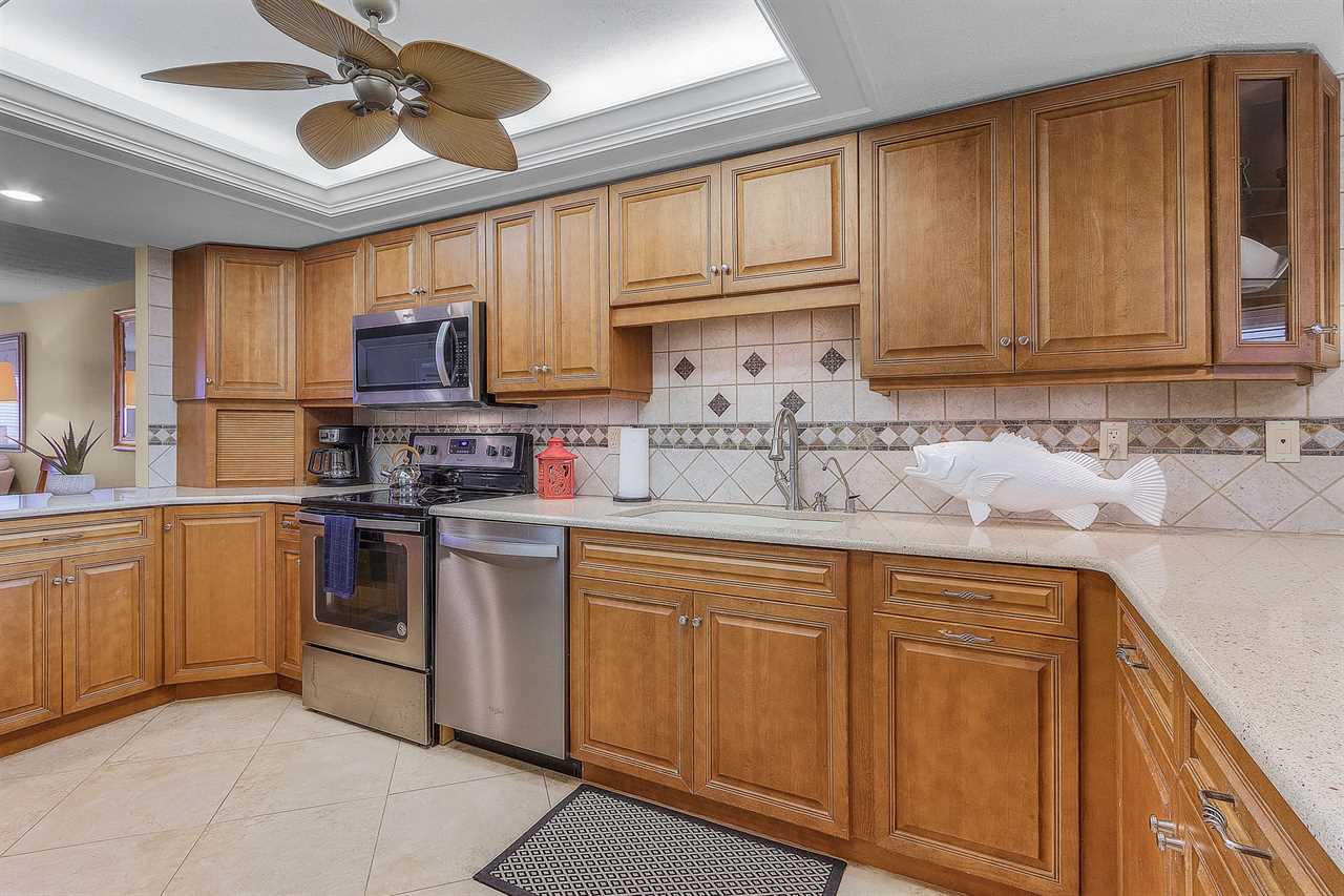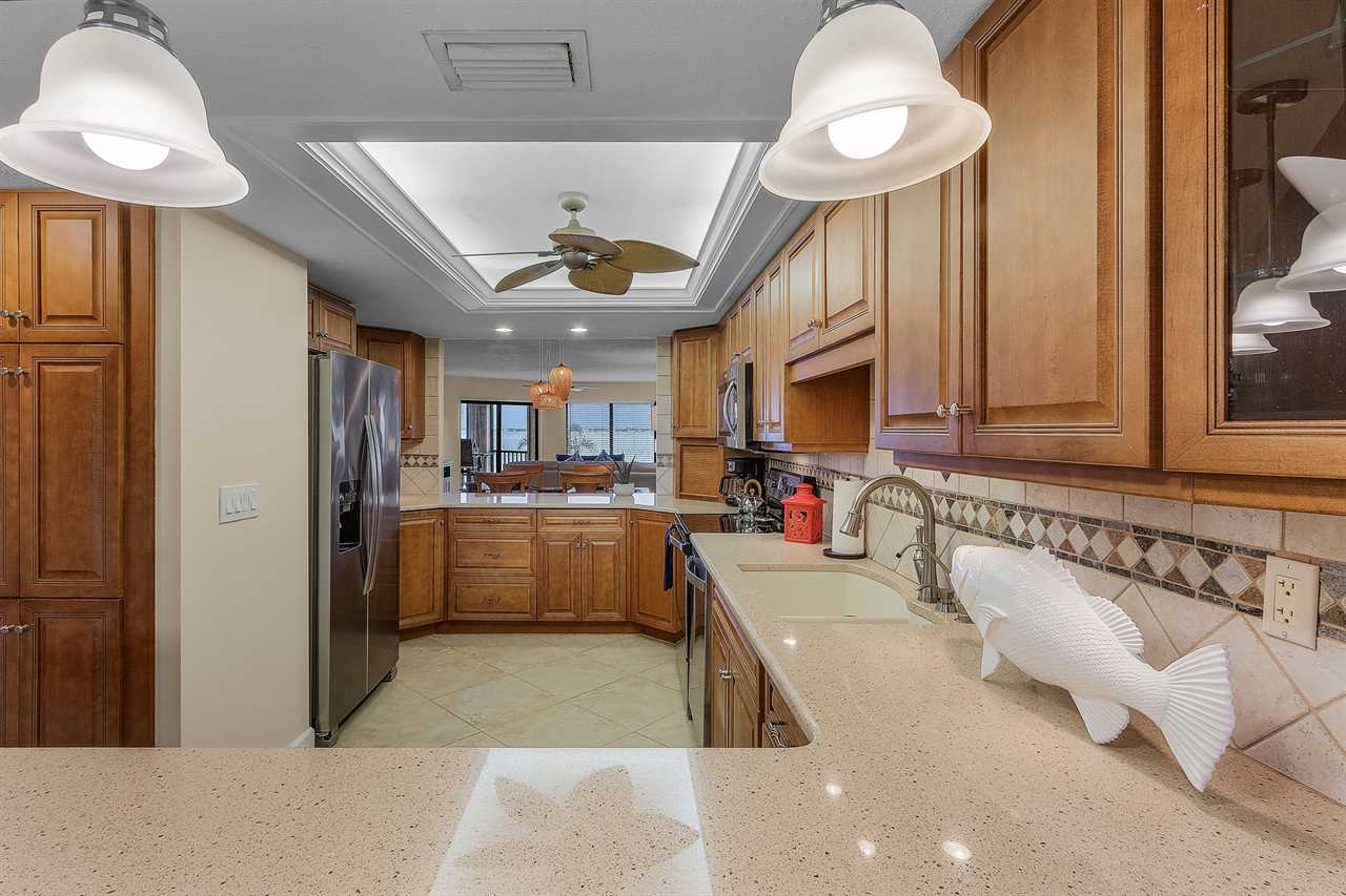 The kitchen is equipped with modern stainless steel appliances, a convenient breakfast bar, and newer wood cabinets. The living area is both gorgeous and spacious, featuring amazing water views from every angle. The owner's suite is a retreat in itself, with sliders providing access to the outdoor living area, a walk-in closet, and a completely remodeled bathroom featuring dual sinks and a decorative tiled shower.