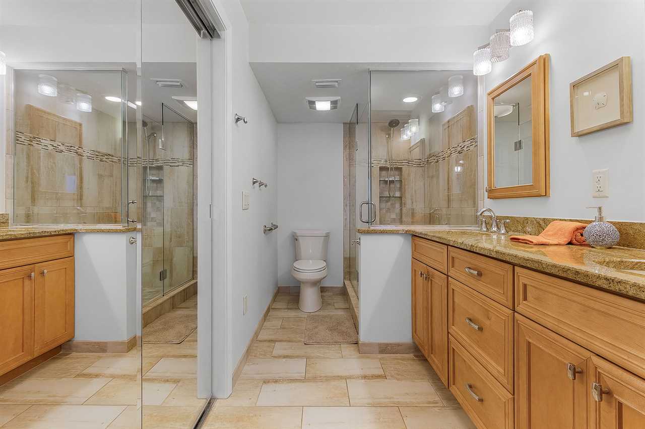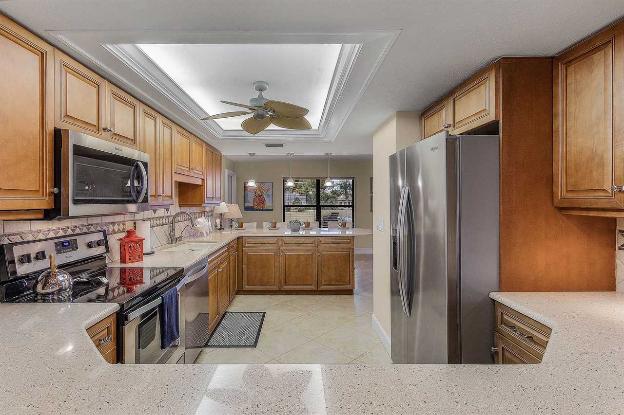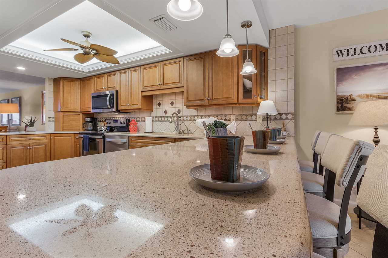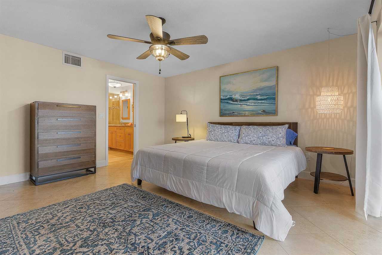 The kitchen is equipped with modern stainless steel appliances, a convenient breakfast bar, and newer wood cabinets. The living area is both gorgeous and spacious, featuring amazing water views from every angle. The owner's suite is a retreat in itself, with sliders providing access to the outdoor living area, a walk-in closet, and a completely remodeled bathroom featuring dual sinks and a decorative tiled shower.