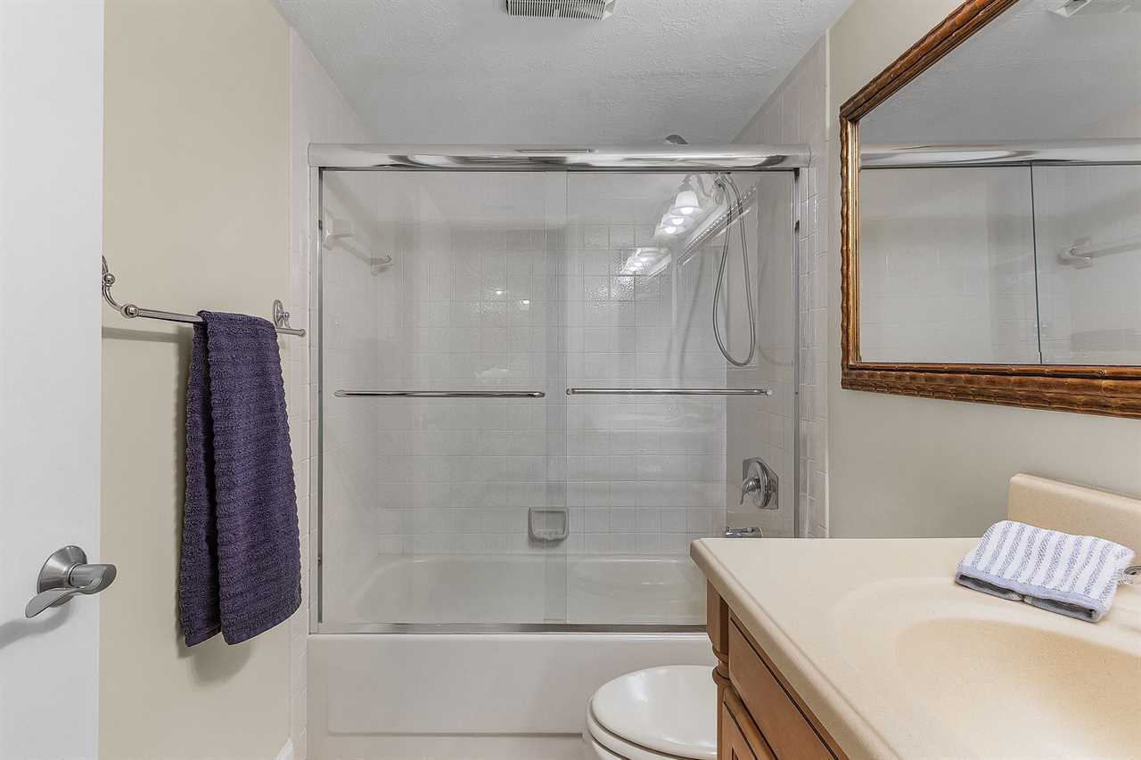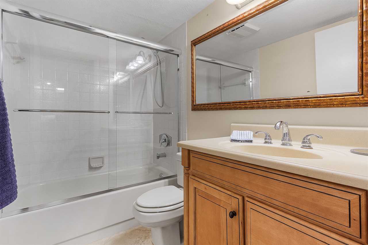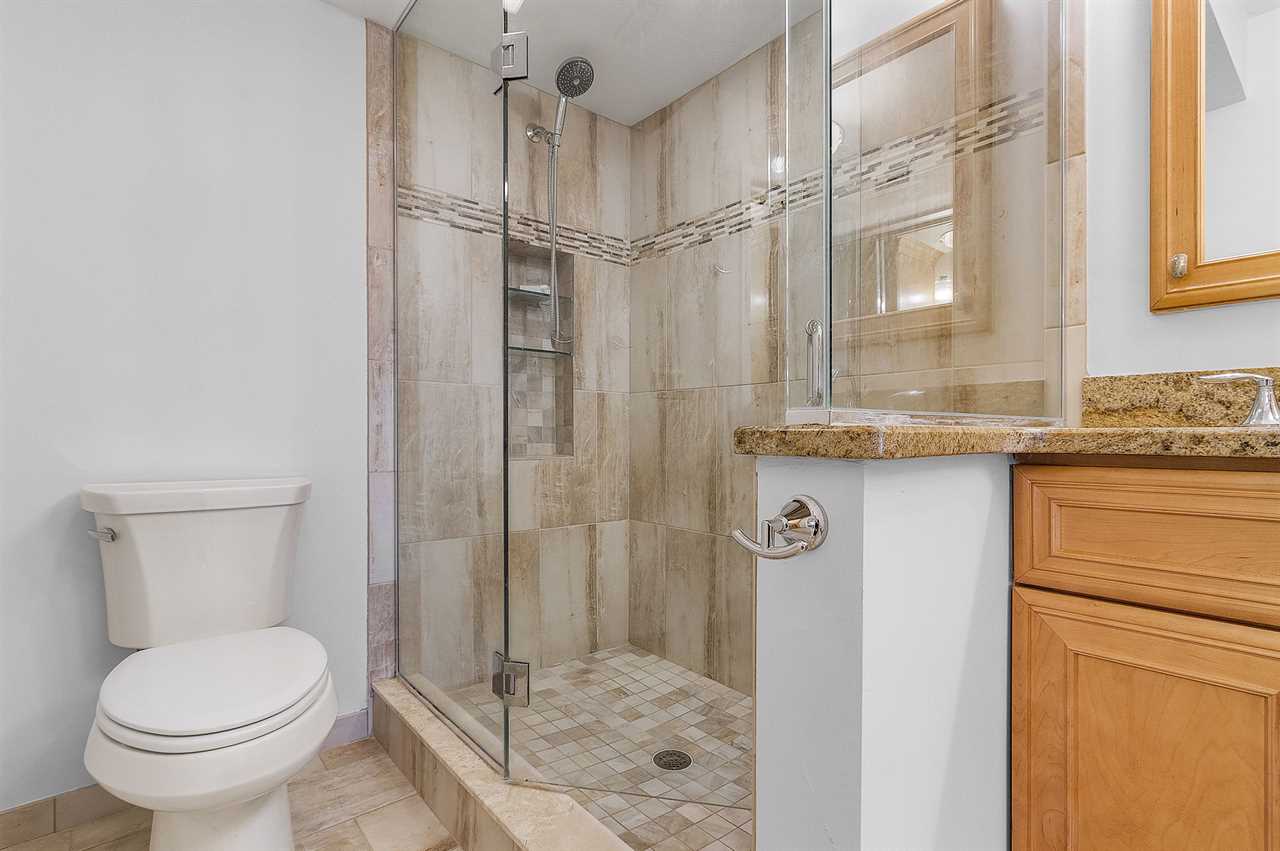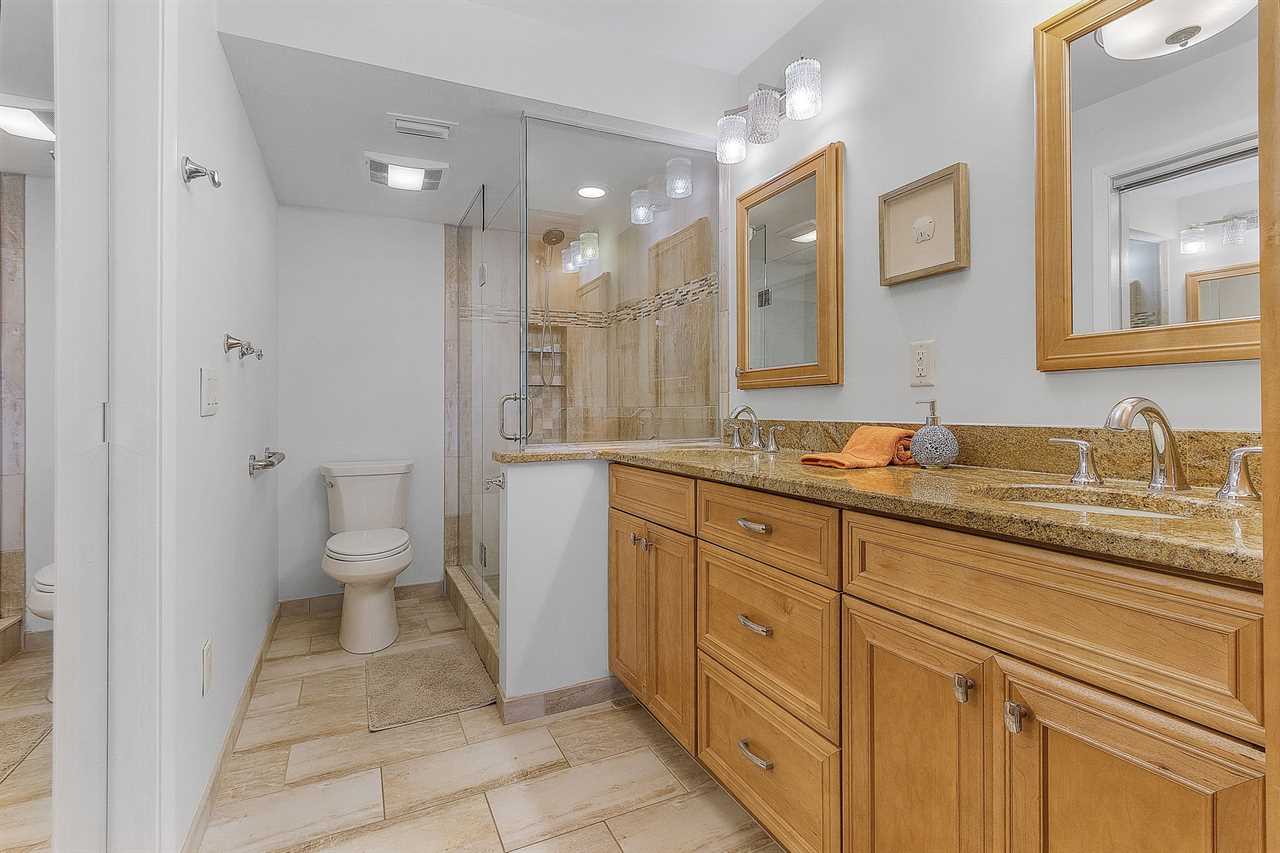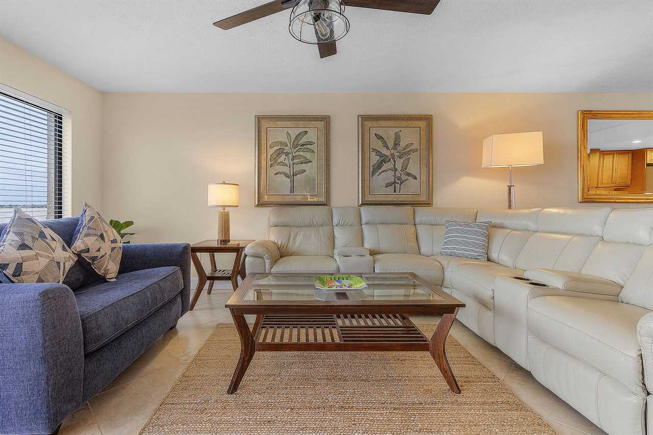The kitchen is equipped with modern stainless steel appliances, a convenient breakfast bar, and newer wood cabinets. The living area is both gorgeous and spacious, featuring amazing water views from every angle. The owner's suite is a retreat in itself, with sliders providing access to the outdoor living area, a walk-in closet, and a completely remodeled bathroom featuring dual sinks and a decorative tiled shower.