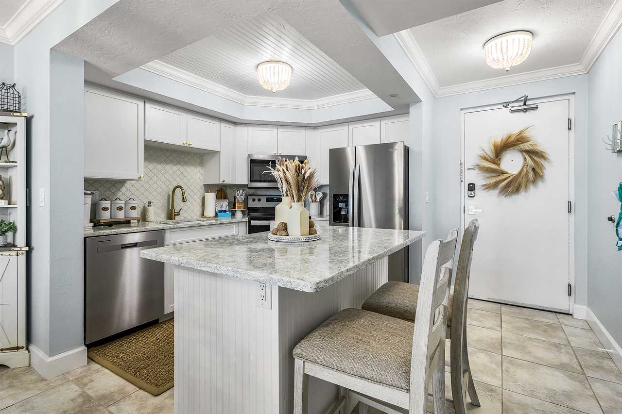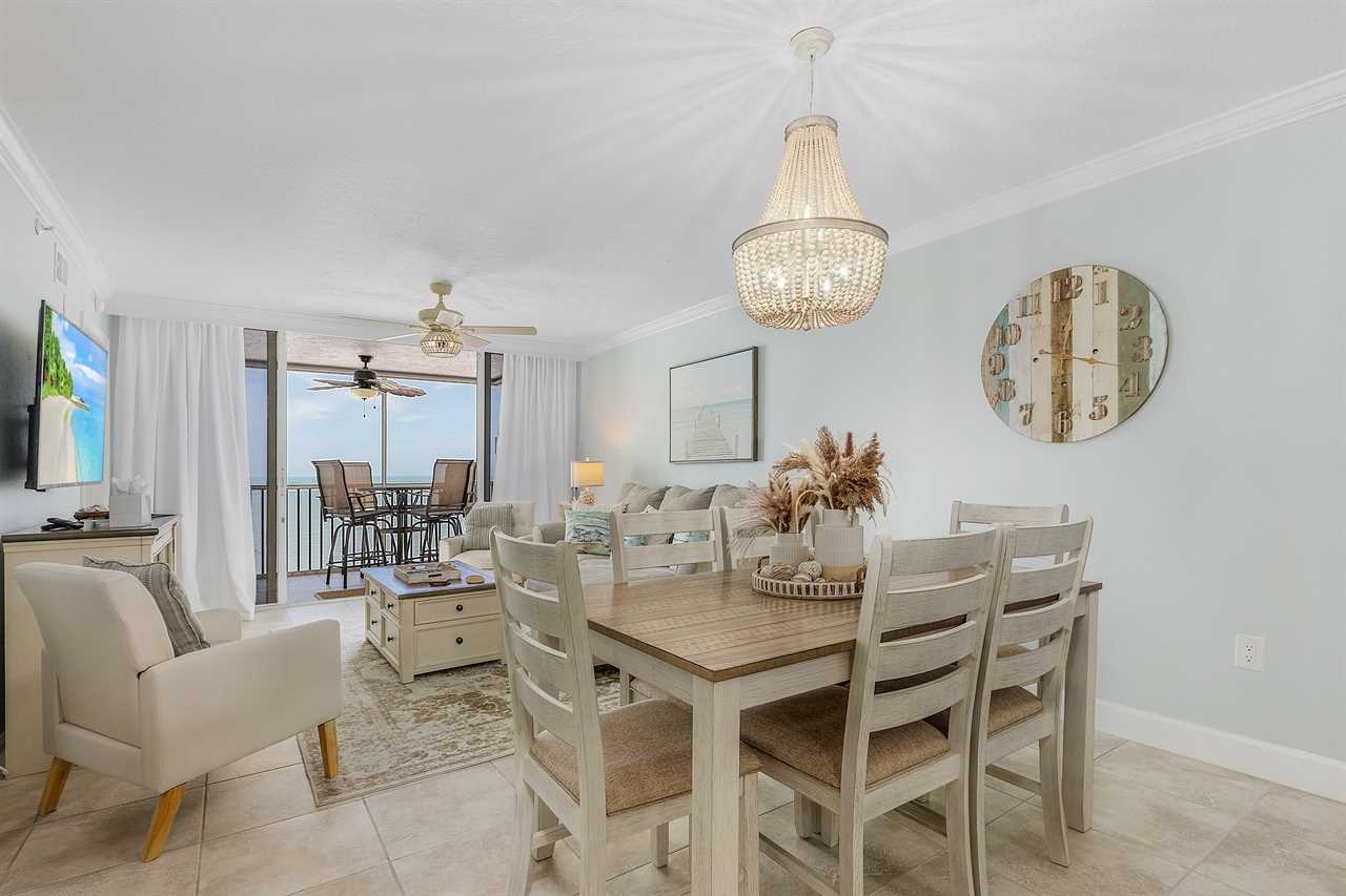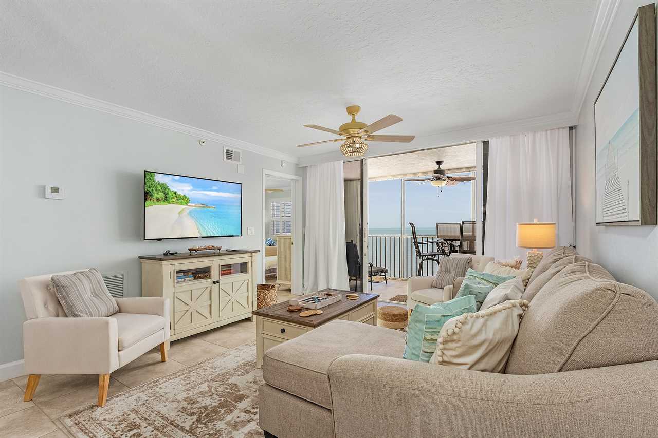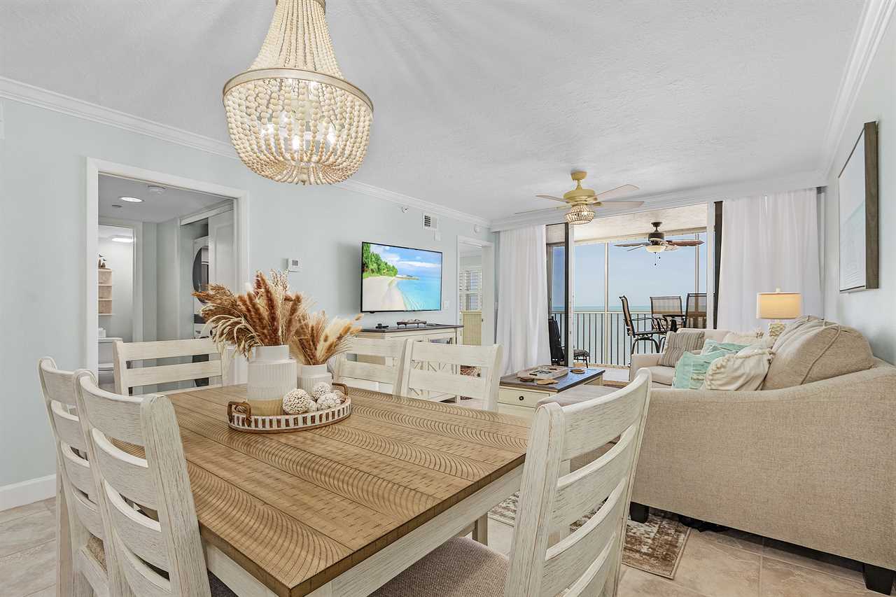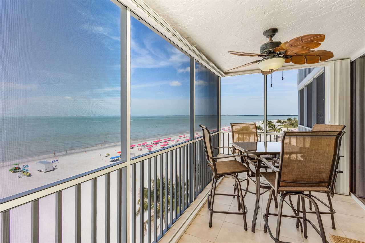Entry is via elevator to the fifth floor and into an entry foyer and the open plan kitchen, dining, and living areas. There is tile flooring throughout. The kitchen has everything necessary to create full-course meals should you so desire, or to just make toast and coffee in the morning. You only need to bring the food! There is an architectural tray ceiling with indirect lighting and plenty of granite counter space. Appliances are all stainless steel and include a dishwasher, glass-top range with oven, built-in above-range microwave oven, and refrigerator/freezer with ice maker. There is also a granite-top island with cabinet and drawer space on the kitchen side. The adjacent dining area has a rectangular table seating five. This flows into the living area which is nicely furnished with a sleeper sofa with an end table and lamps, two matching side chairs, and a coffee table. Opposite the sofa is a credenza which is a wall-mounted large flat-screen TV. Sliding glass doors from the living area provide access to the gulf-front screened-in balcony that is furnished with a patio table and chairs. The view from this seventh-floor vantage point is expansive and includes the Gulf waters and the sugar-white sand beach right in front of you. From this vantage point you will see Sanibel Island to the west, then nothing but the open Gulf of Mexico to the south.