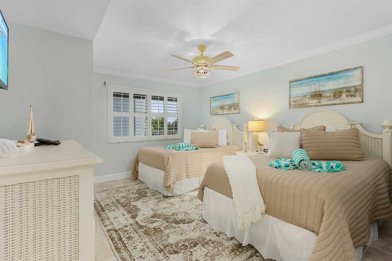 The primary bedroom with en suite bath has a king-size bed, nightstand, and lamp, an armoire with three drawers and a flat-screen TV above. The windows in this bedroom also offer a great view of the beach and the Gulf of Mexico. The bathroom is accessed through a pocket sliding door into the dressing area where there is a granite-top vanity with a lavatory, mirror, and storage space beneath. Through a pocket sliding door is the commode and a nicely tiled walk-in shower with glass doors. The guest bedroom, bath, and laundry area are accessible through a pocket door. Behind sliding doors is a stacked washer and dryer set. The guest bathroom has a granite-top vanity with a lavatory and storage space beneath, mirror, a commode, and a tiled combination tub/shower. The guest bedroom is furnished with two double beds with a nightstand and lamp, a double dresser with flat screen TV above, and ample closet space.