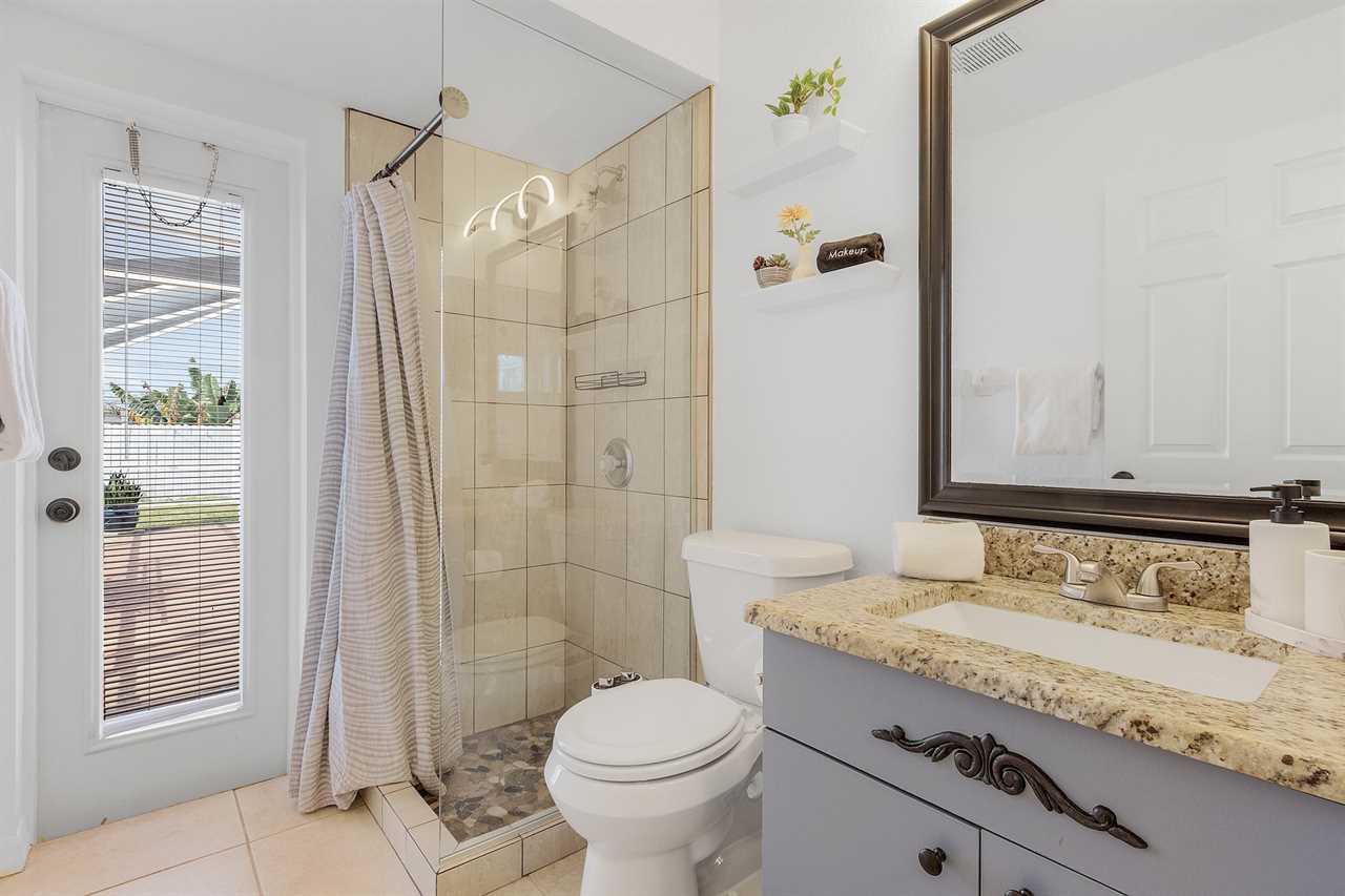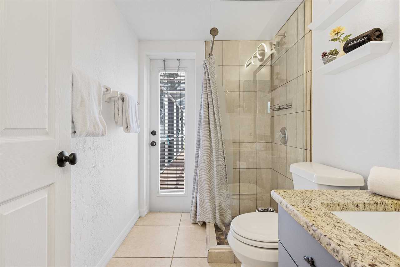 Direct bathroom access from the pool deck makes outdoor living effortless. Whether you're enjoying your morning coffee poolside or a nighttime dip, the space is designed for ease and enjoyment.