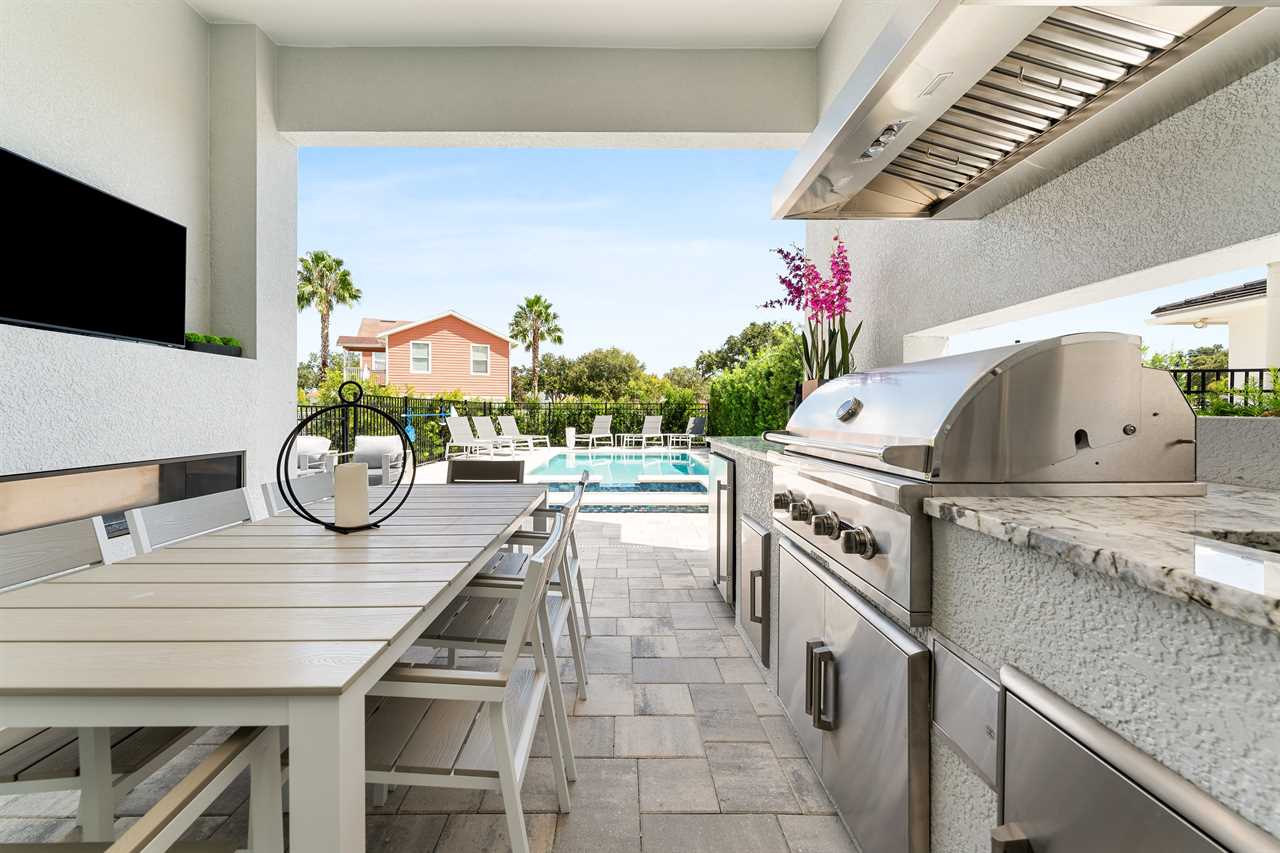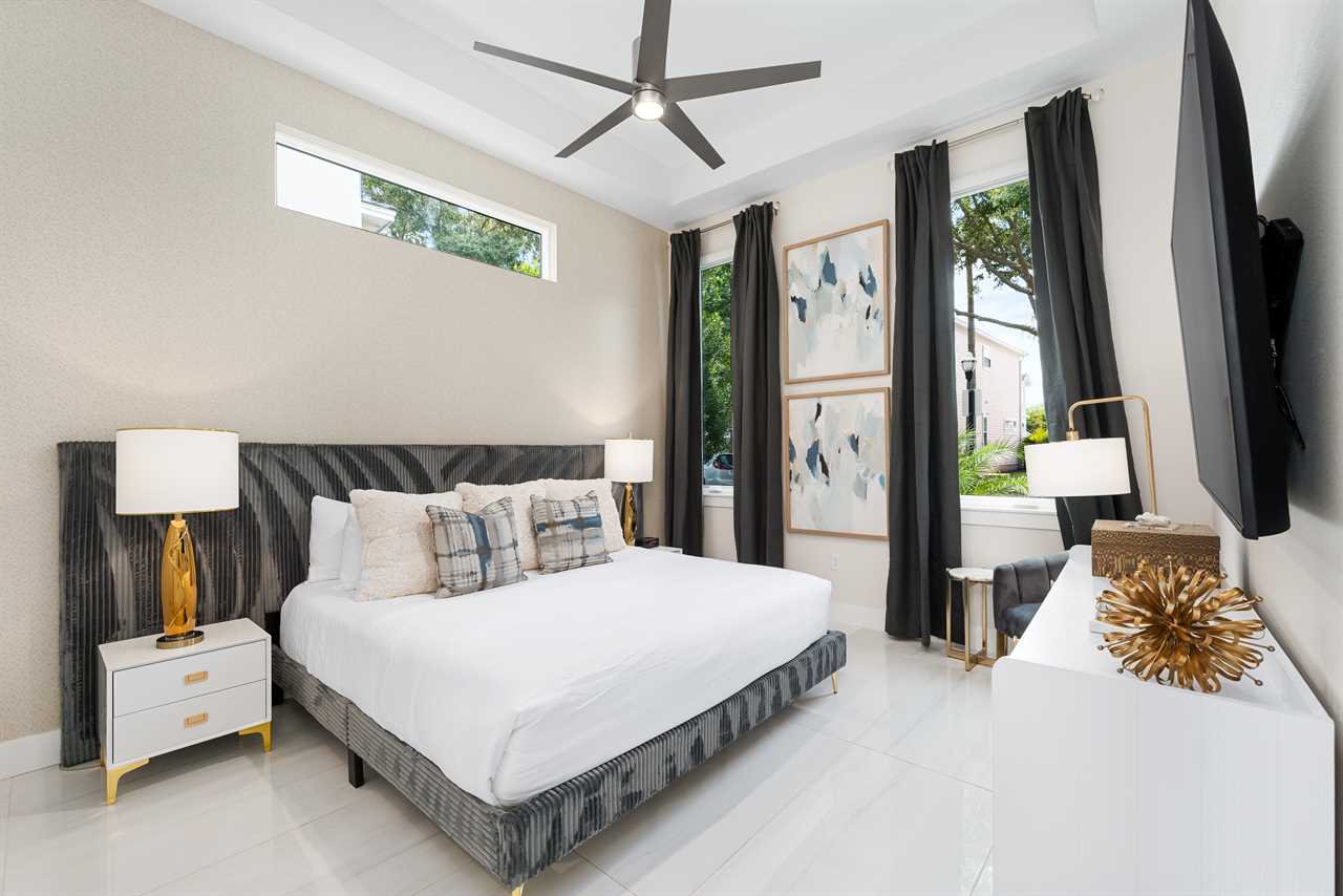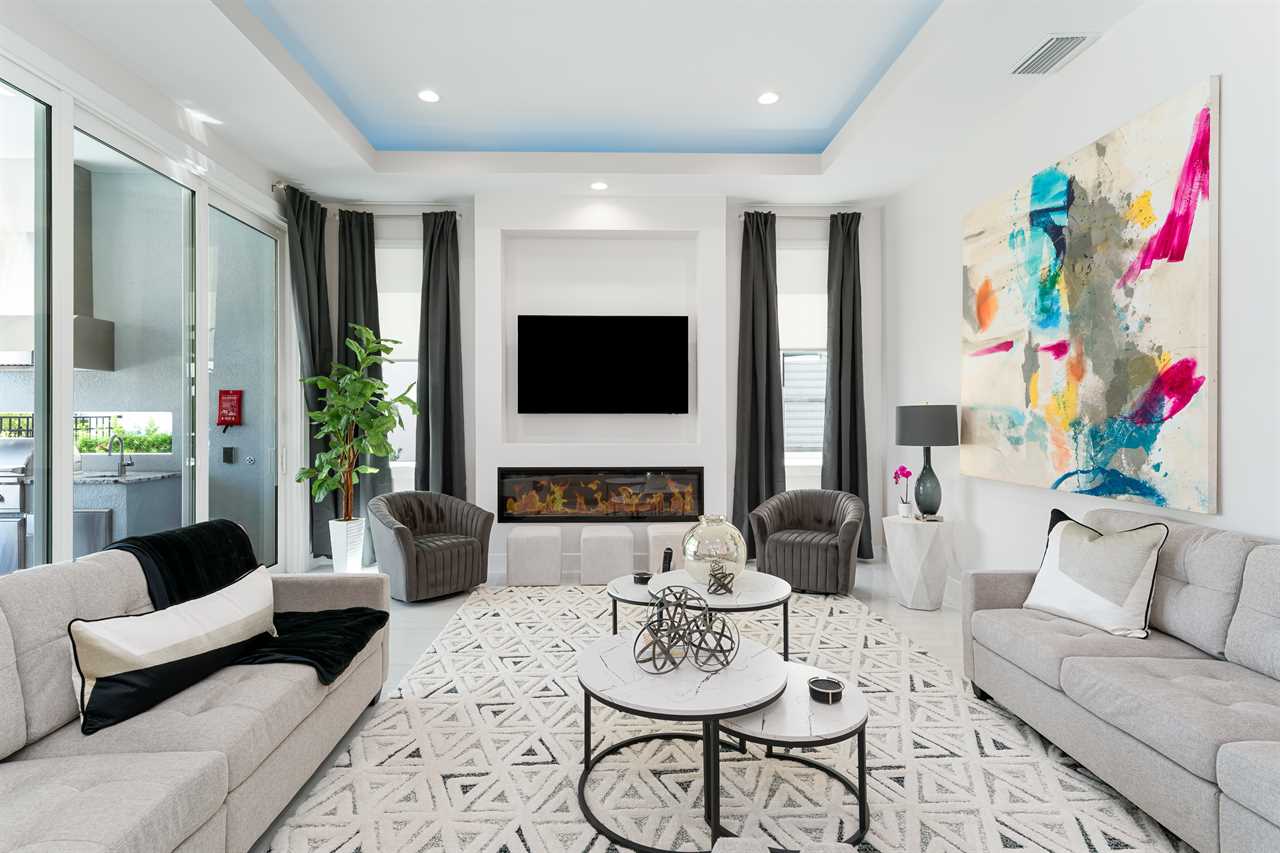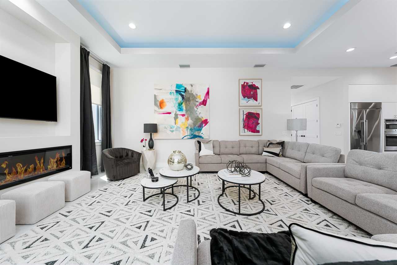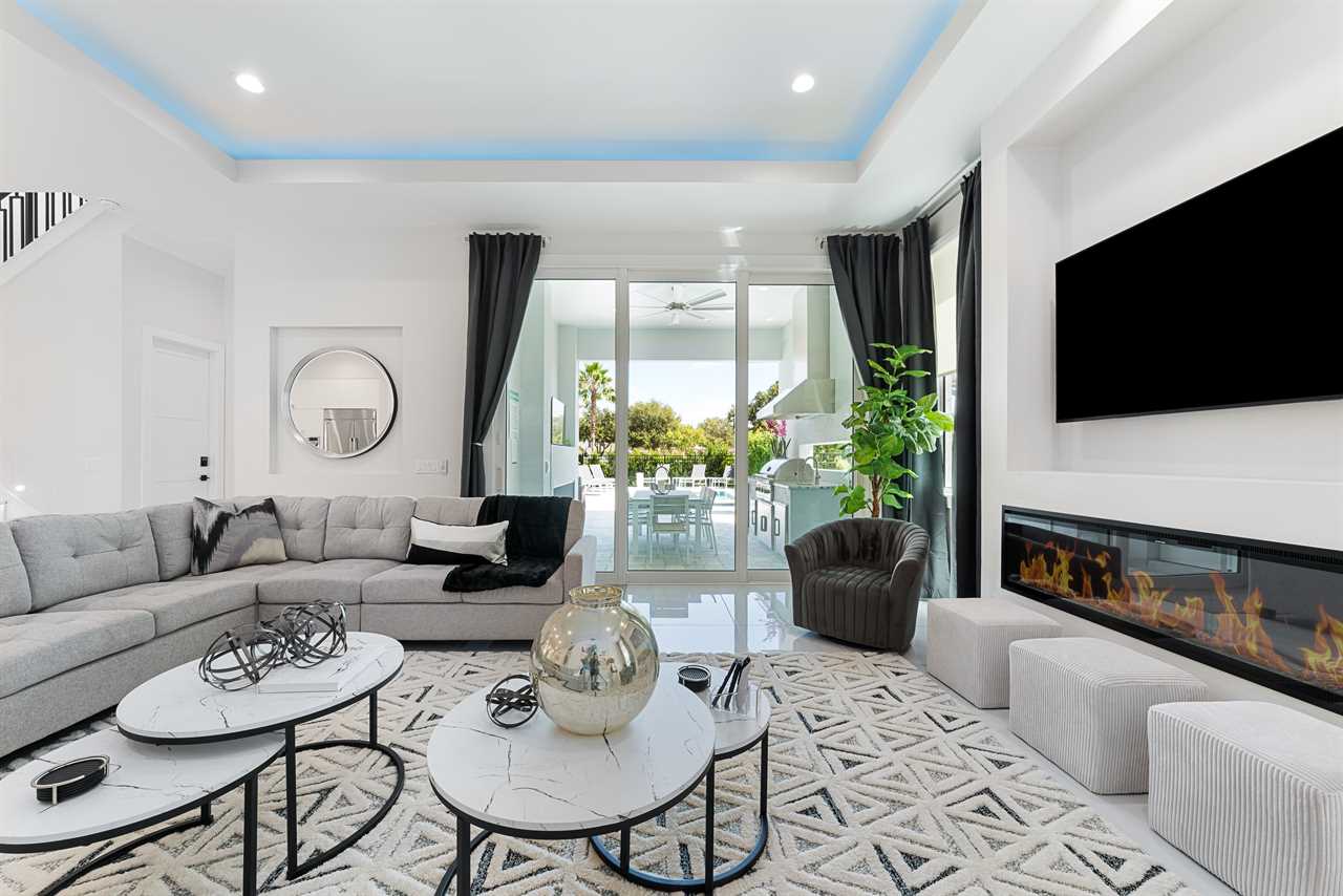 This house located in Homestead within Reunion Resort offers a luxurious and spacious experience. The living room features a large smart TV and an electric fireplace, perfect for cozy gatherings. The kitchen is equipped with granite countertops and a convenient island for cooking and socializing.