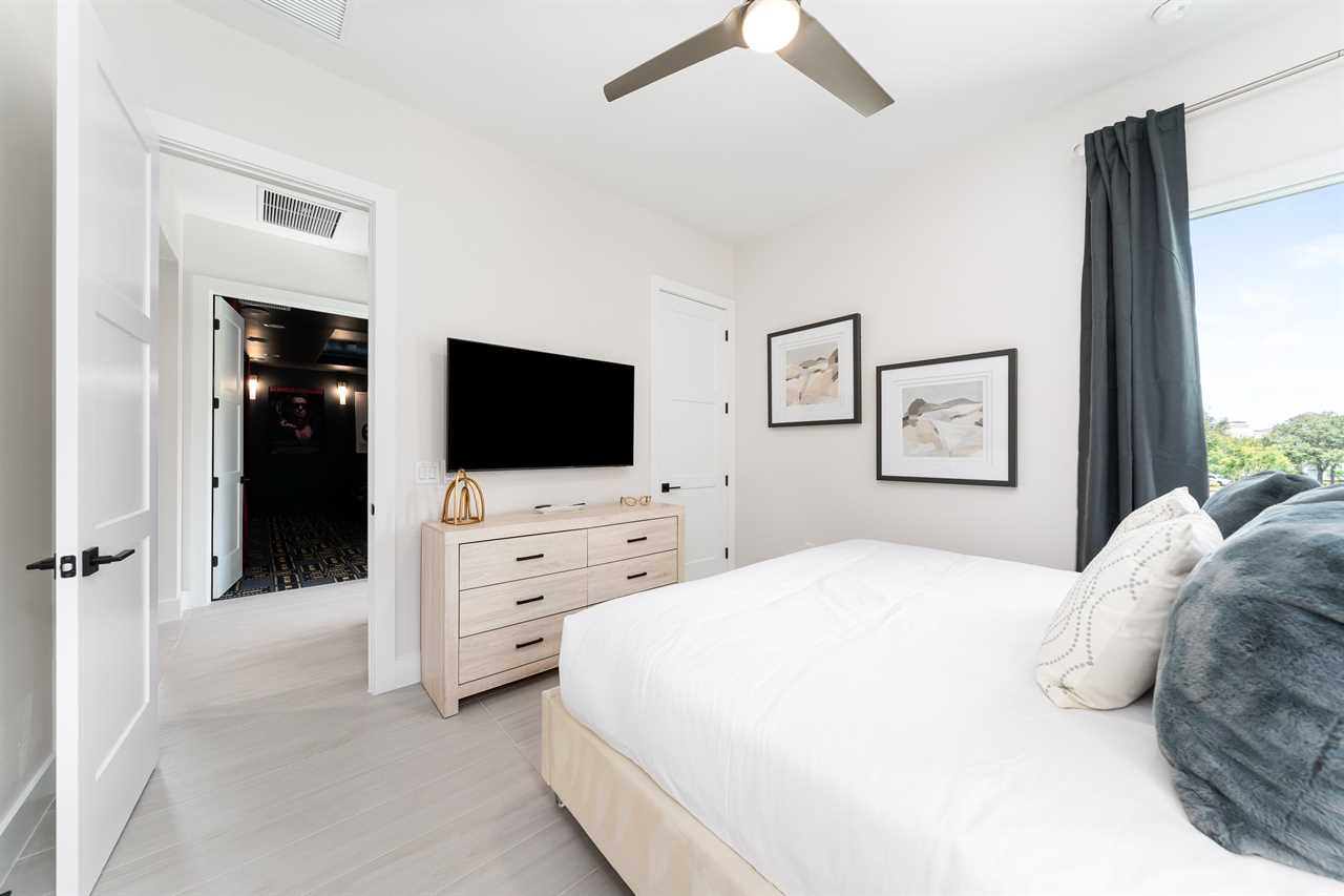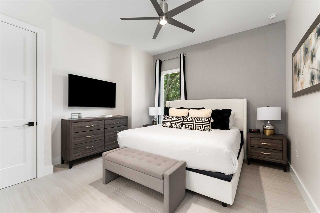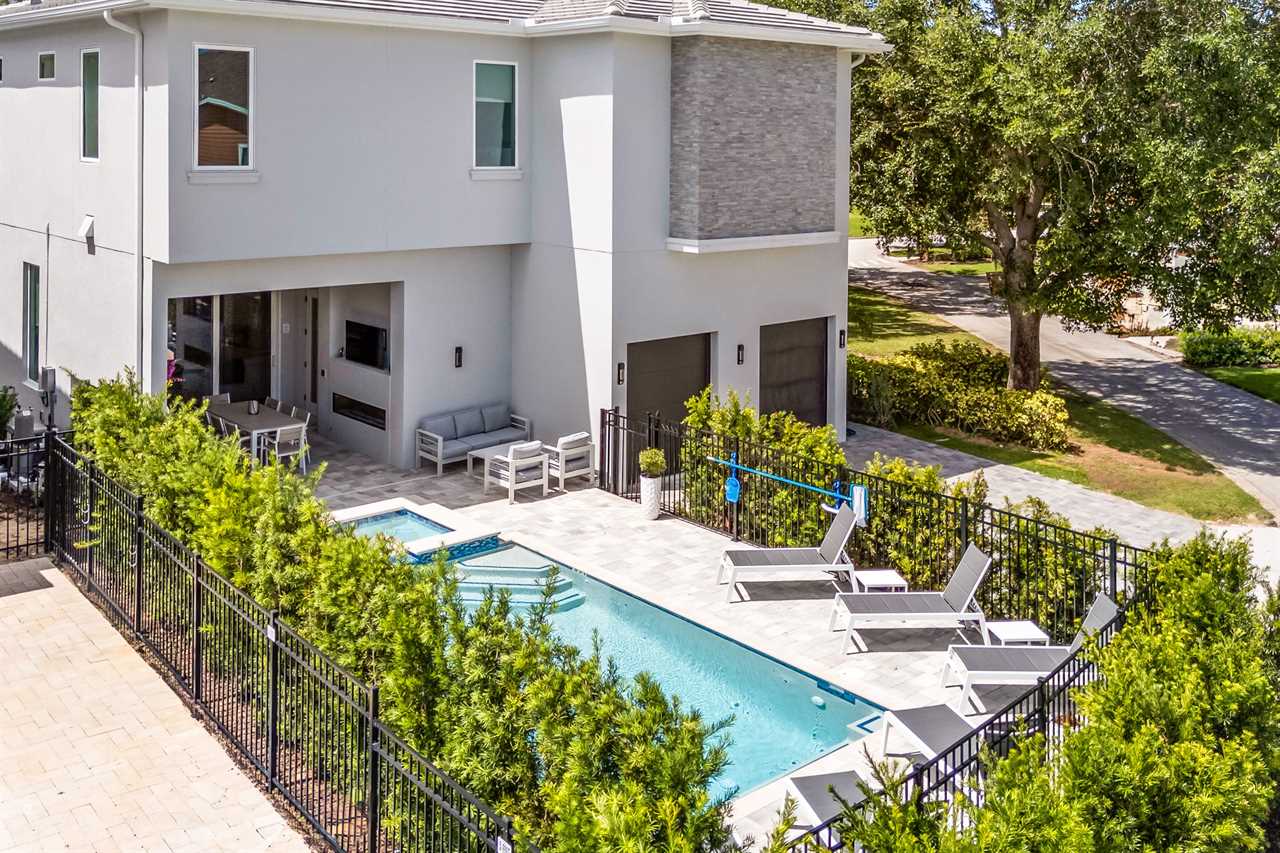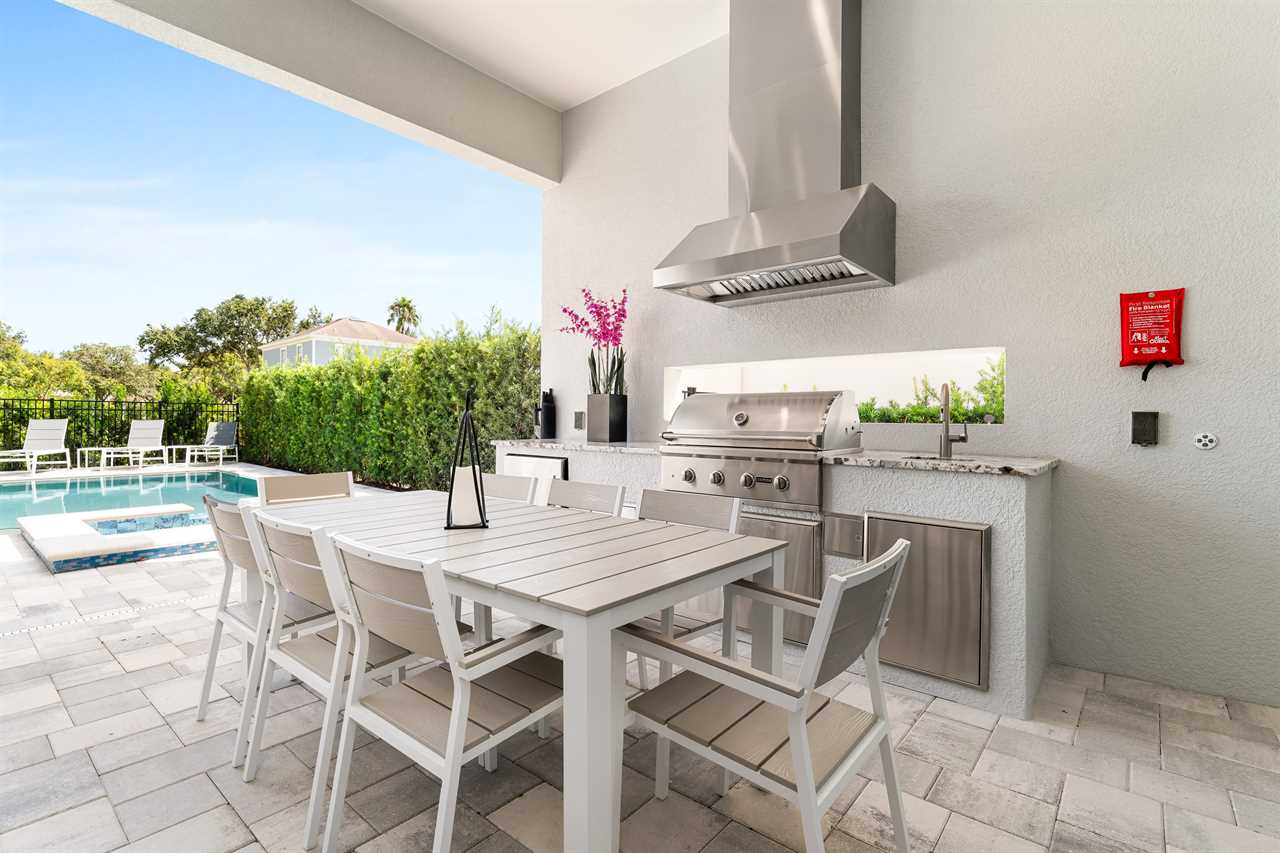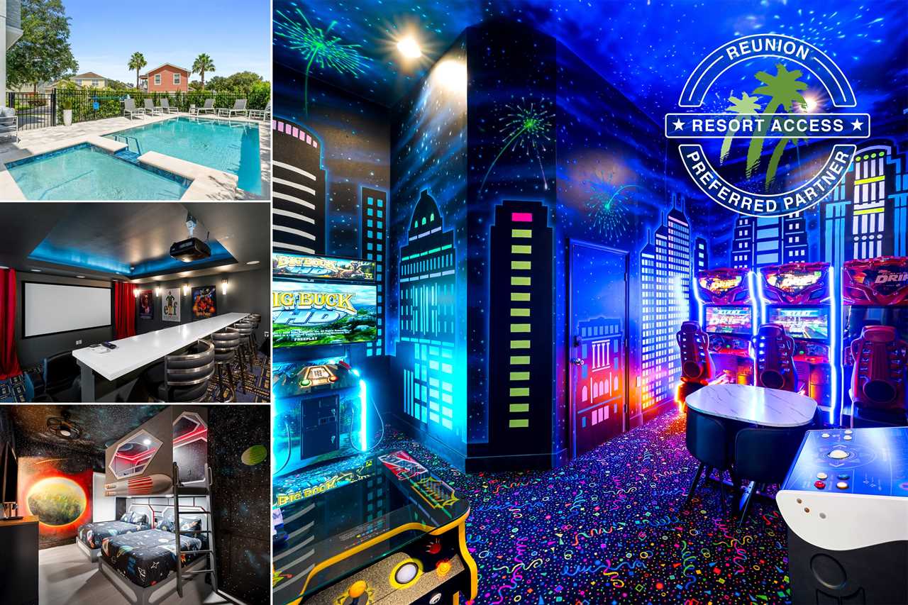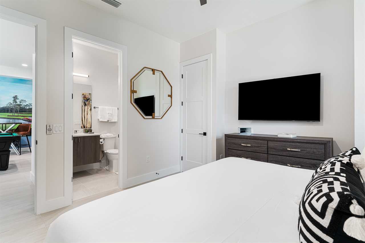 This house located in Homestead within Reunion Resort offers a luxurious and spacious experience. The living room features a large smart TV and an electric fireplace, perfect for cozy gatherings. The kitchen is equipped with granite countertops and a convenient island for cooking and socializing.