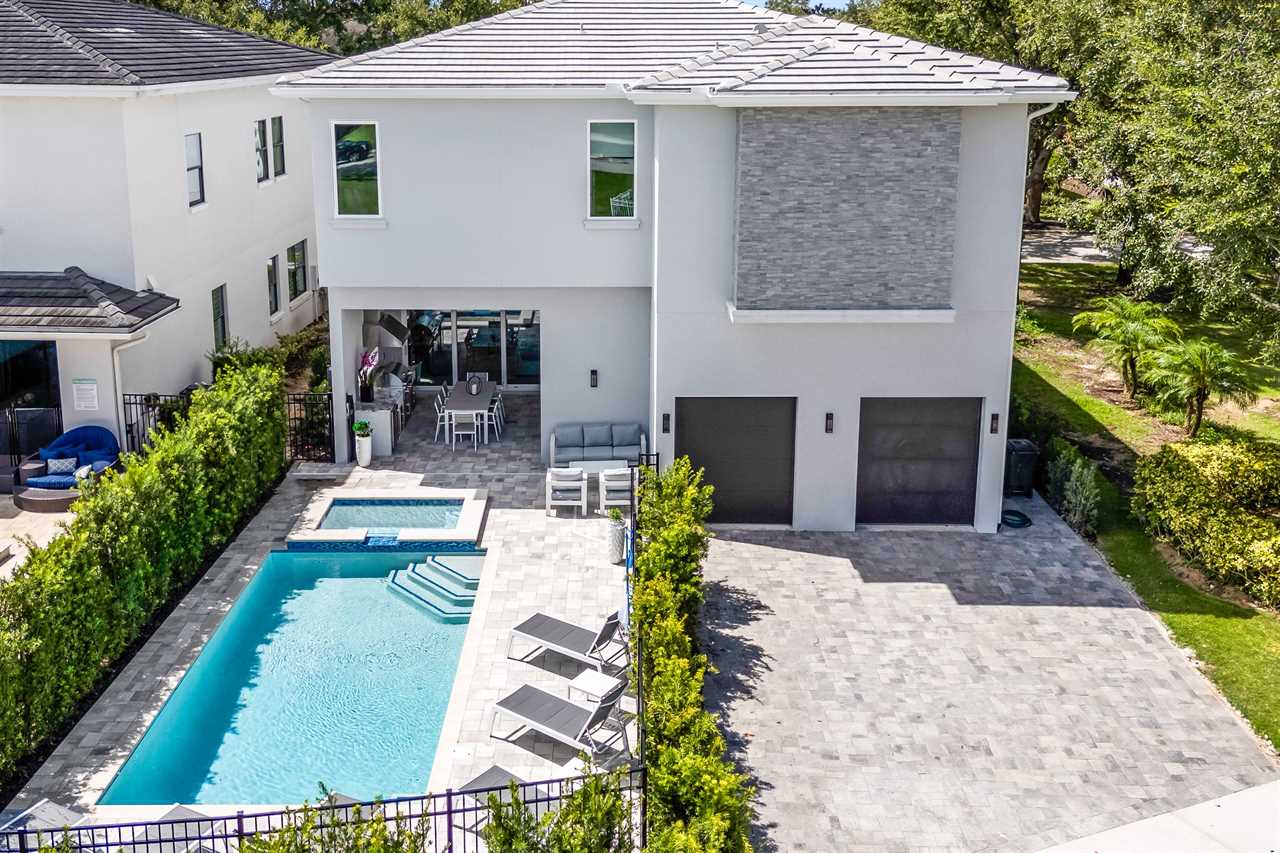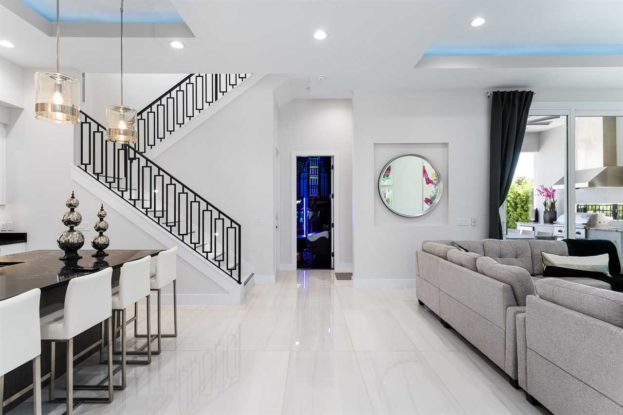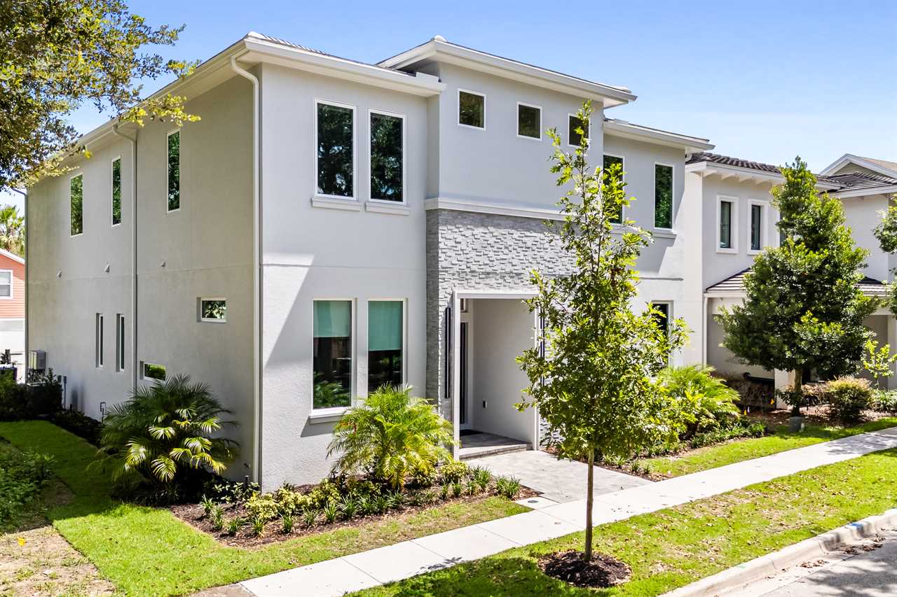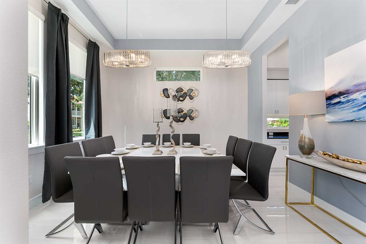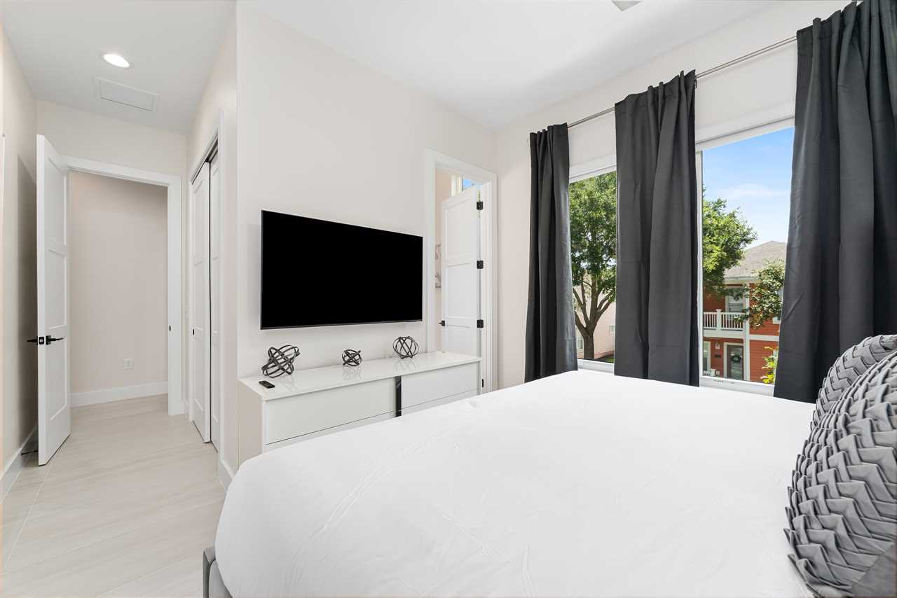 This house located in Homestead within Reunion Resort offers a luxurious and spacious experience. The living room features a large smart TV and an electric fireplace, perfect for cozy gatherings. The kitchen is equipped with granite countertops and a convenient island for cooking and socializing.