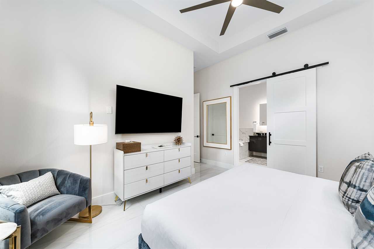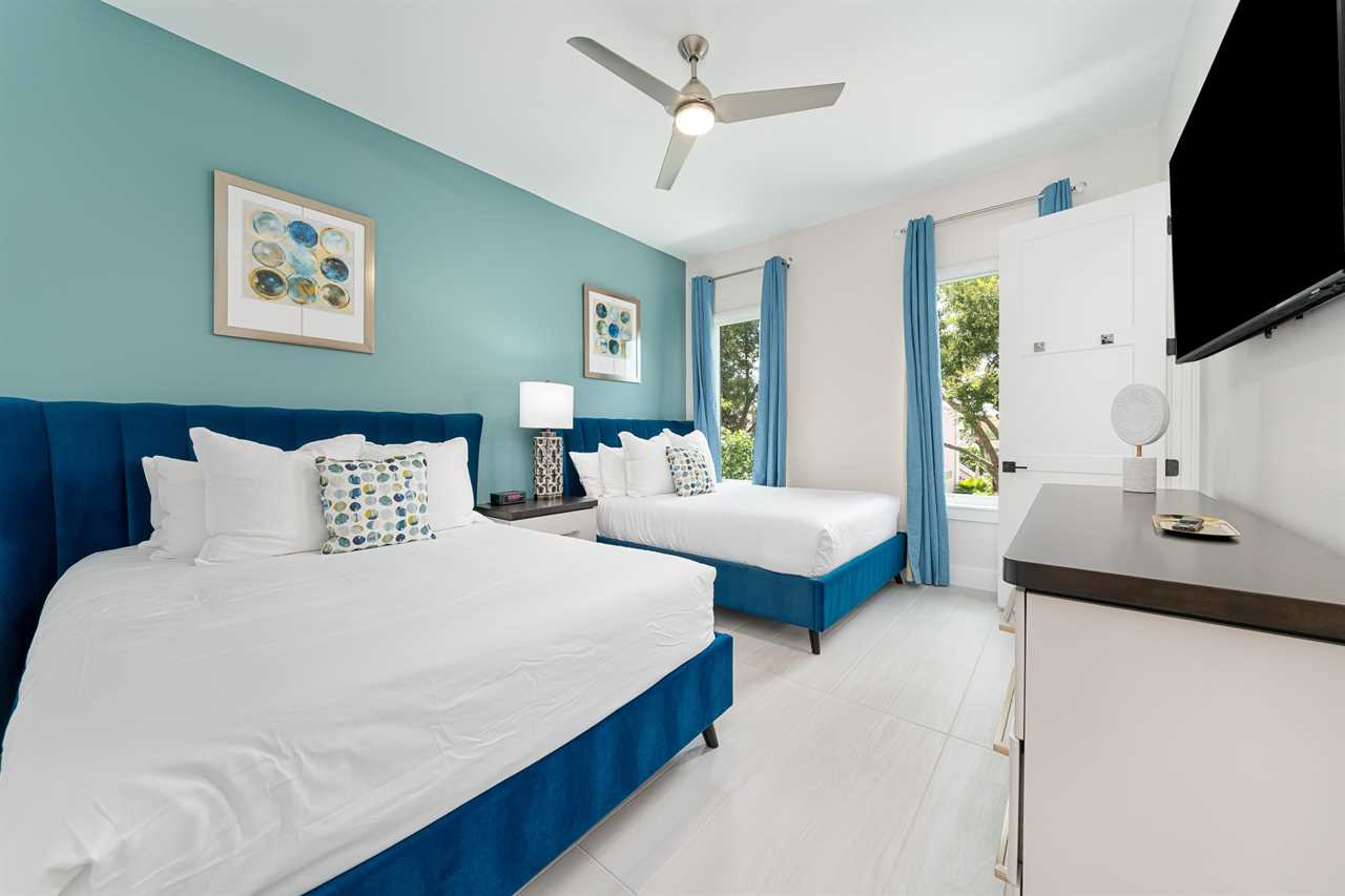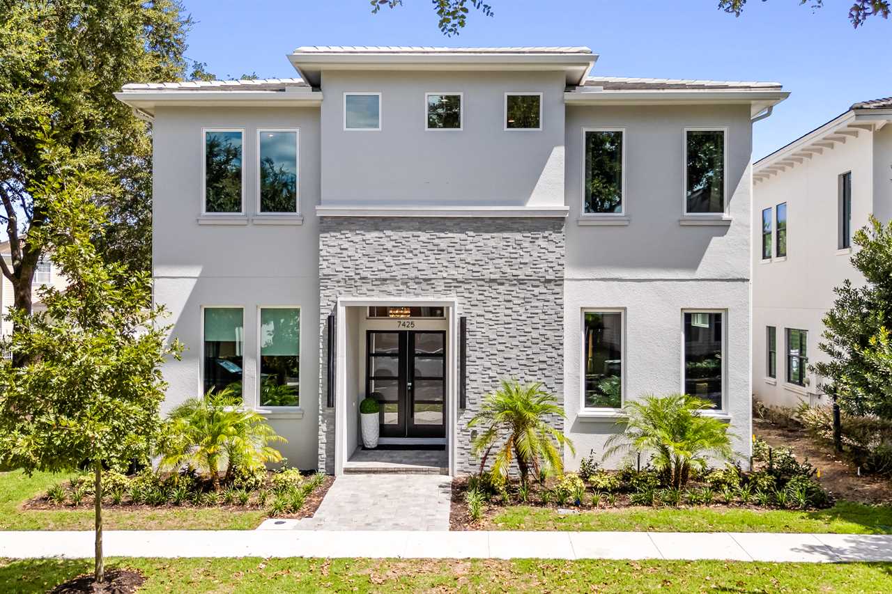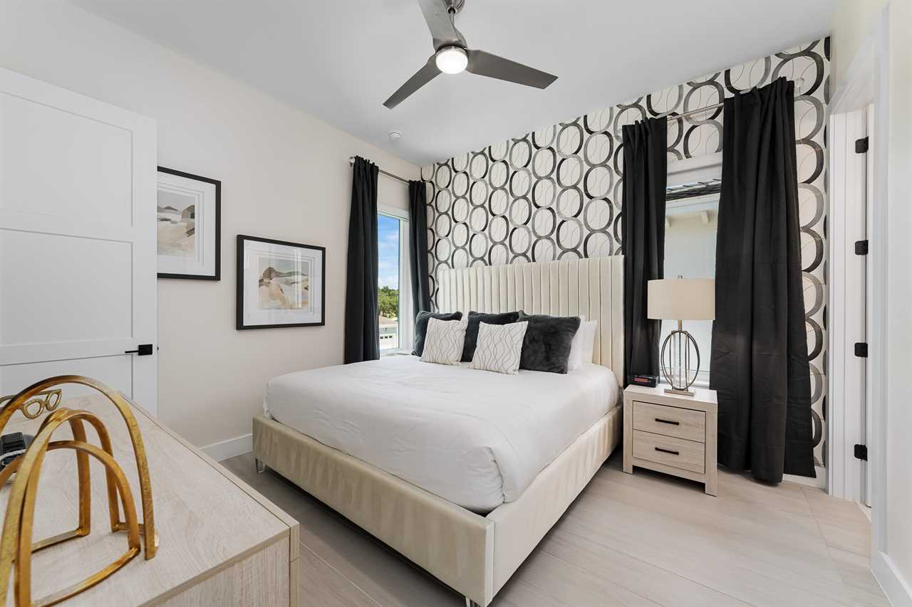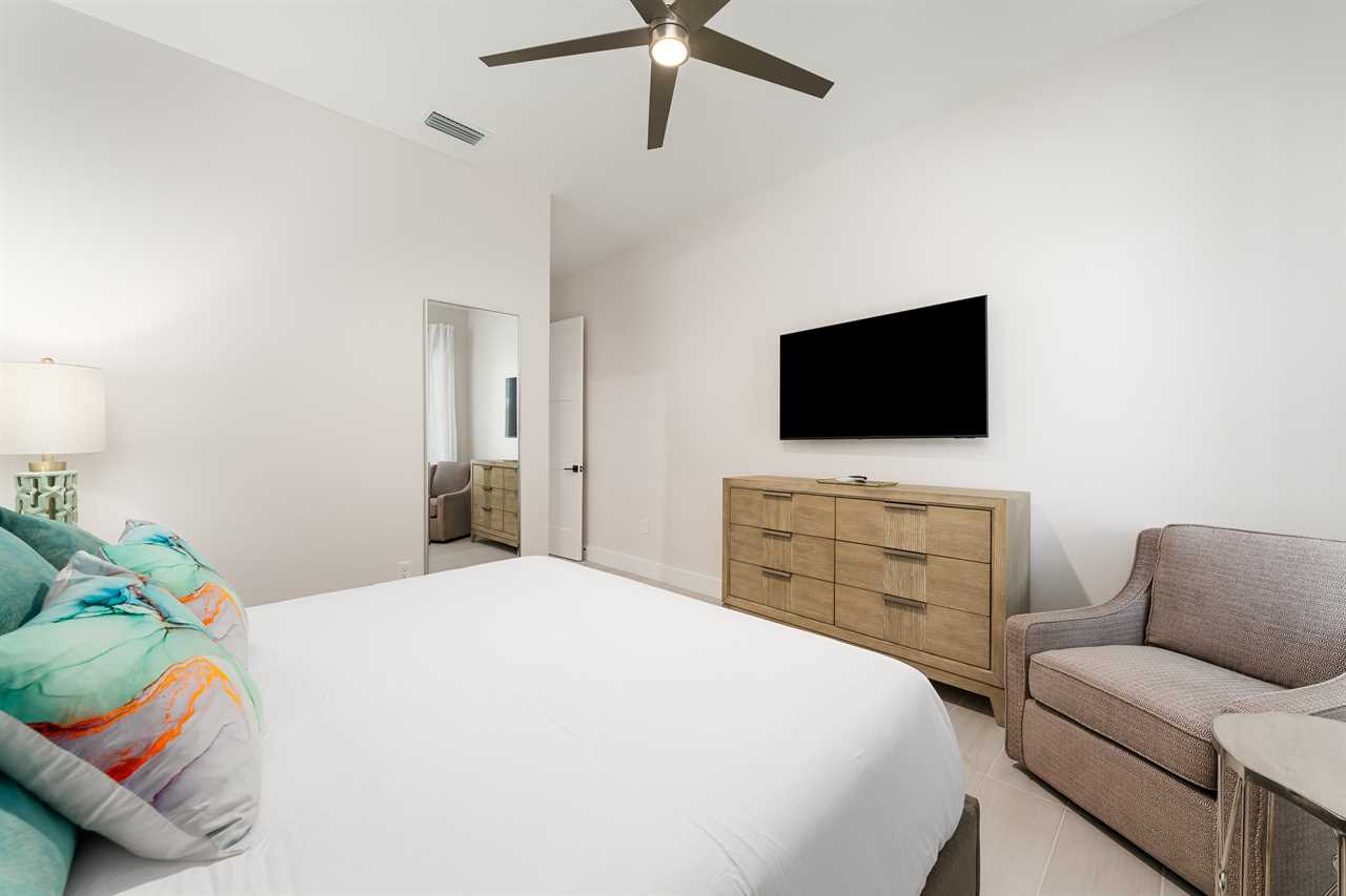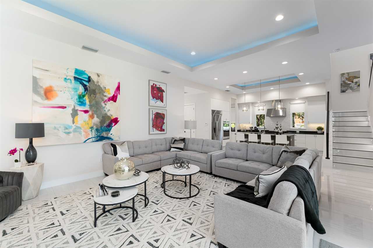 This house located in Homestead within Reunion Resort offers a luxurious and spacious experience. The living room features a large smart TV and an electric fireplace, perfect for cozy gatherings. The kitchen is equipped with granite countertops and a convenient island for cooking and socializing.