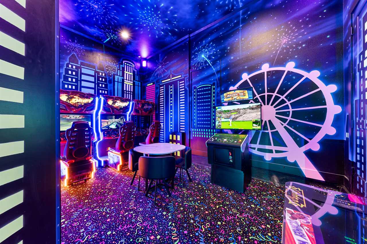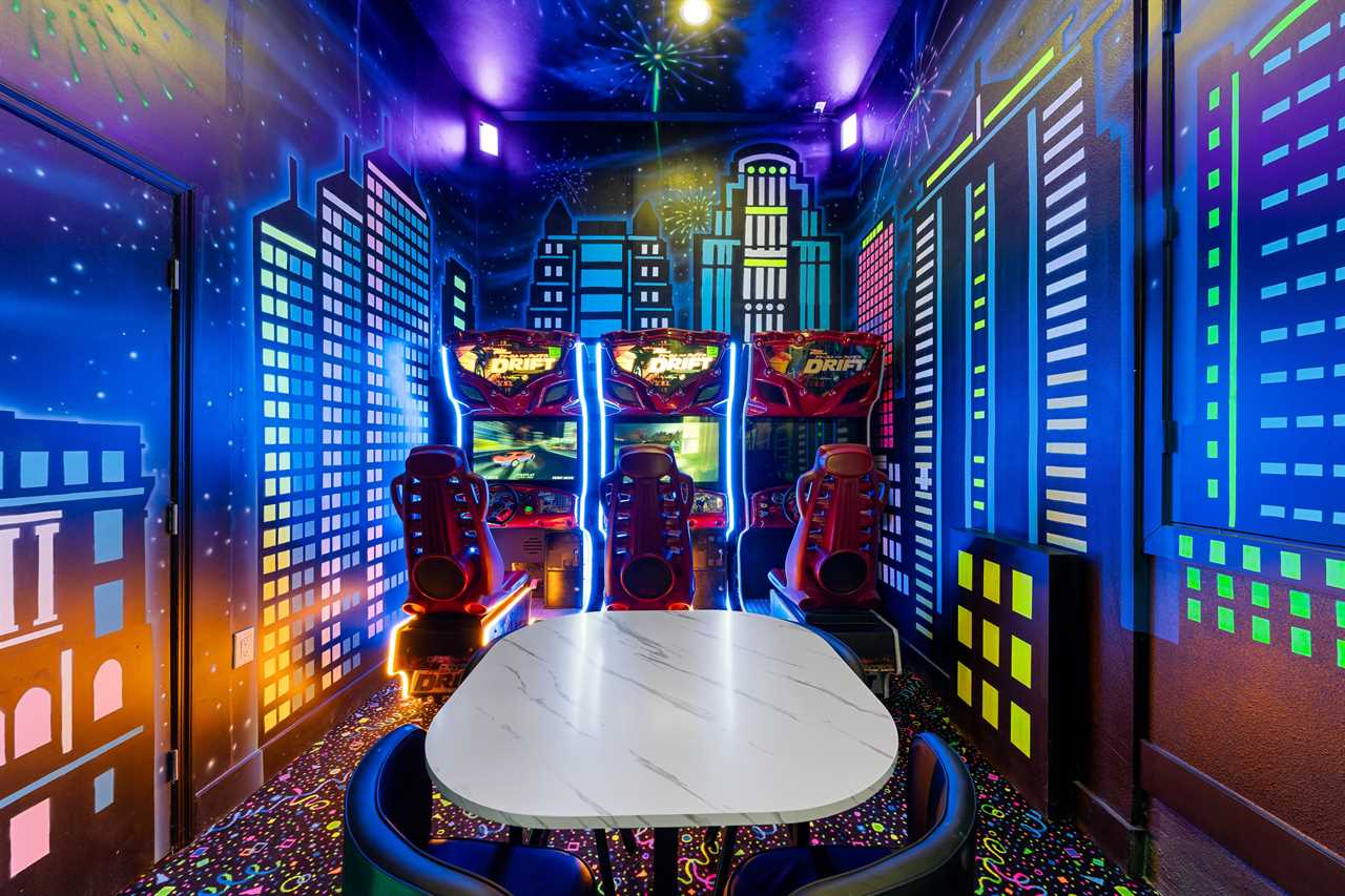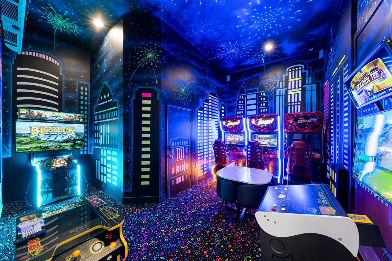 The games room is packed with excitement, featuring a Fast and Furious game with 3 racers, a 2022 Golden Tee game with a smart TV, an arcade game with 60 classic games, a Buck Hunter game, a Pac-Man game and a cocktail table. The outdoor pool area is equally impressive with a private pool with spillover spa, several lounge chairs, a built-in BBQ, and a summer kitchen complete with a fridge and sink. A large smart TV, a built-in fire pit, a table for 10, and an outdoor ceiling fan enhance the outdoor living space.