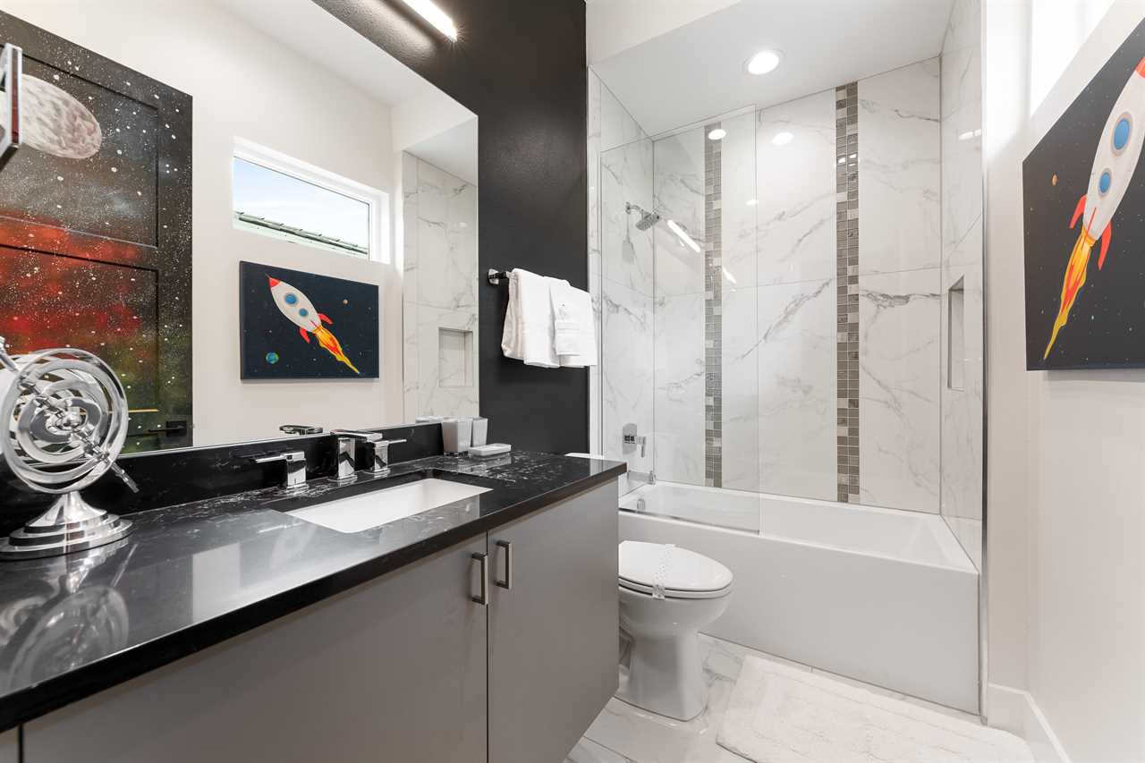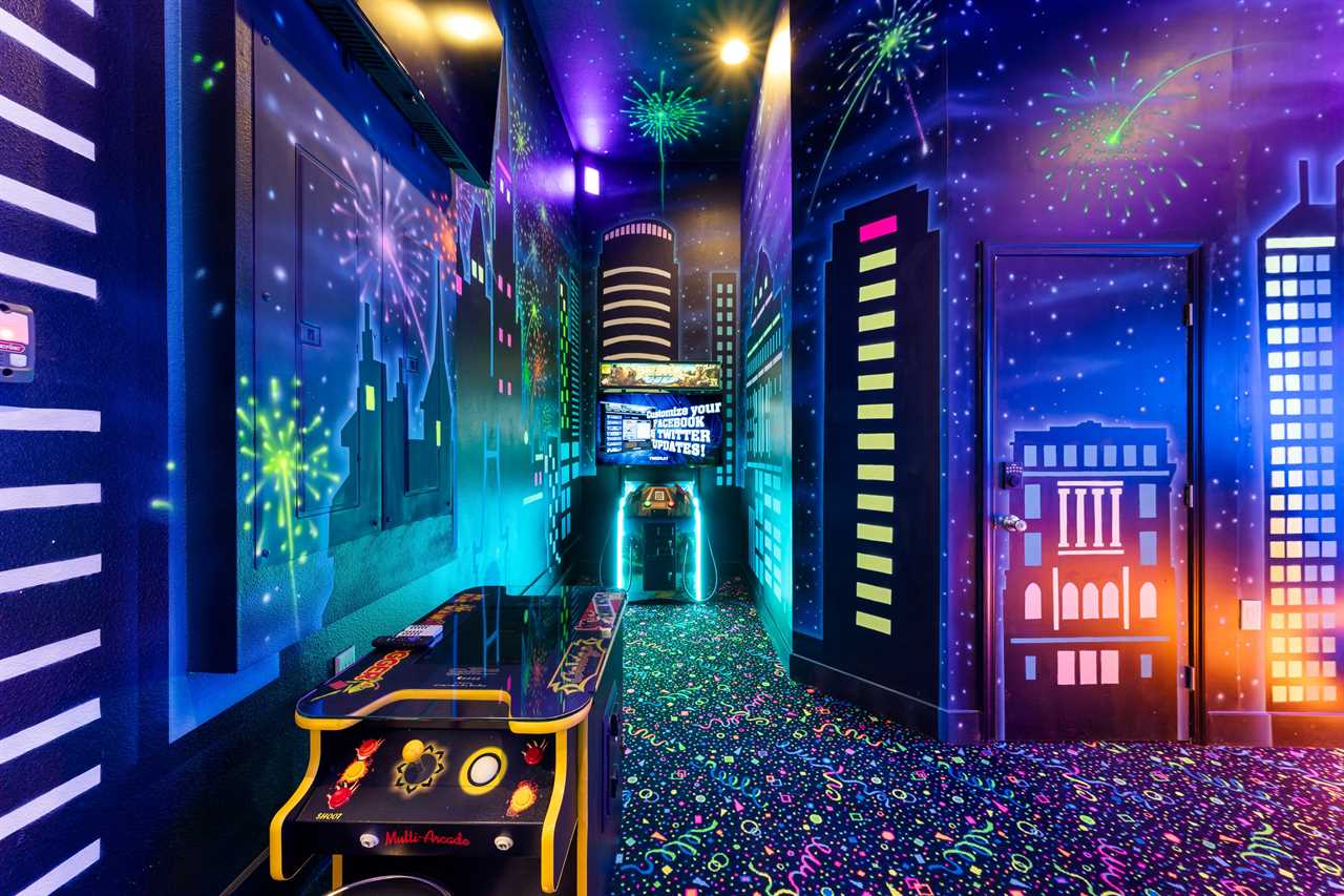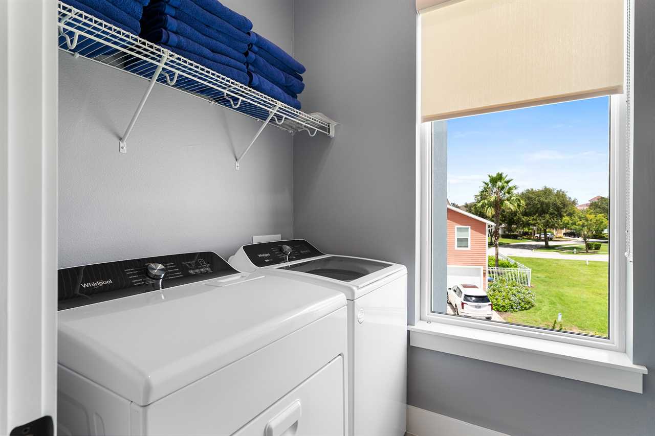 Convenience is key, with a laundry room located on both floors. The bedrooms include five spacious king rooms, a space-themed bunk room with two full beds and one twin bed equipped with an Xbox and PS5, and another room with two queen beds, offering plenty of comfort for guests.