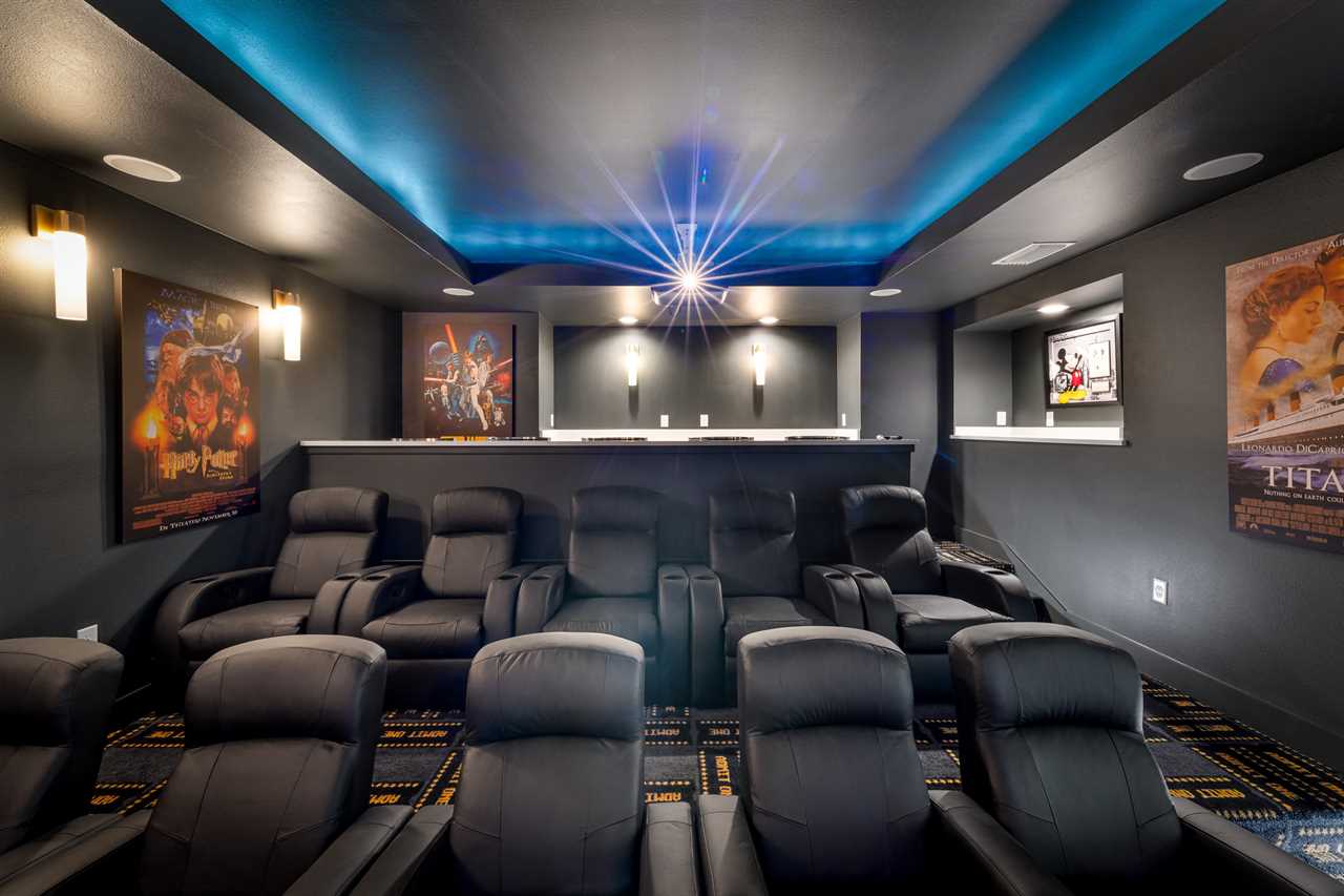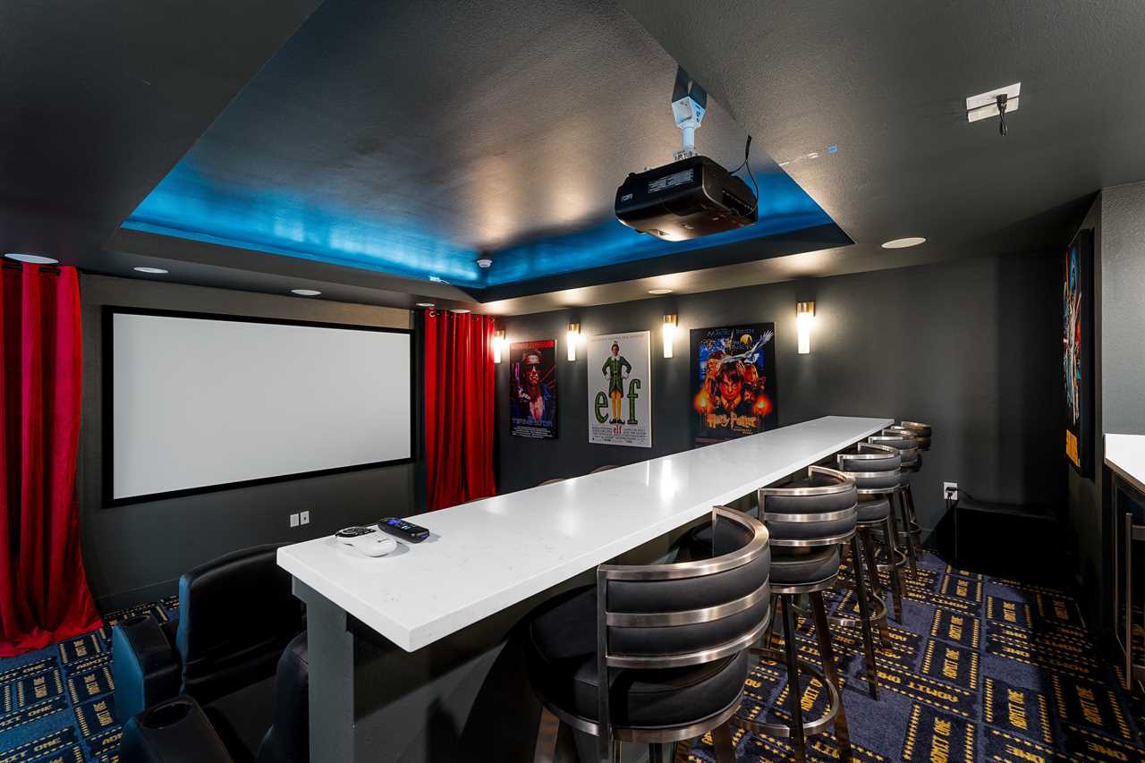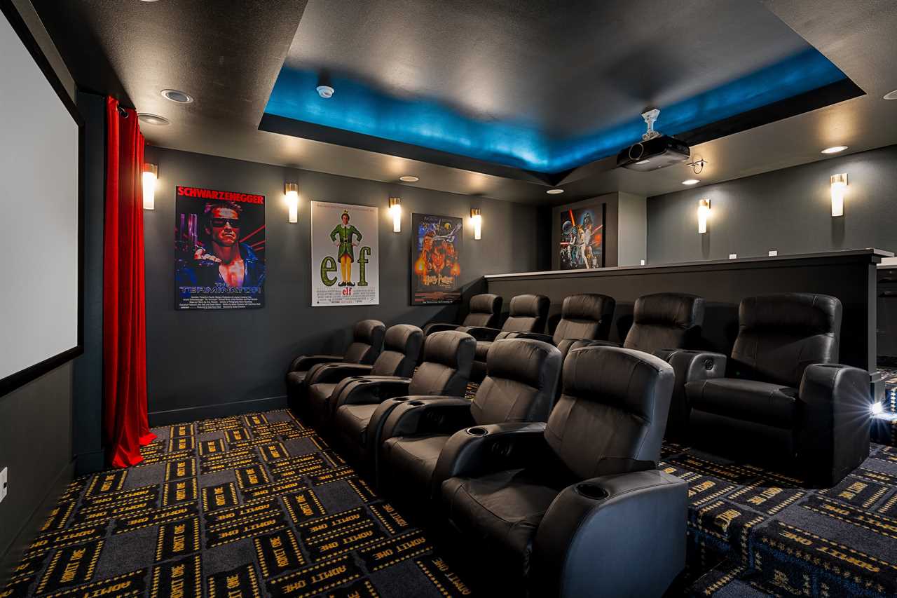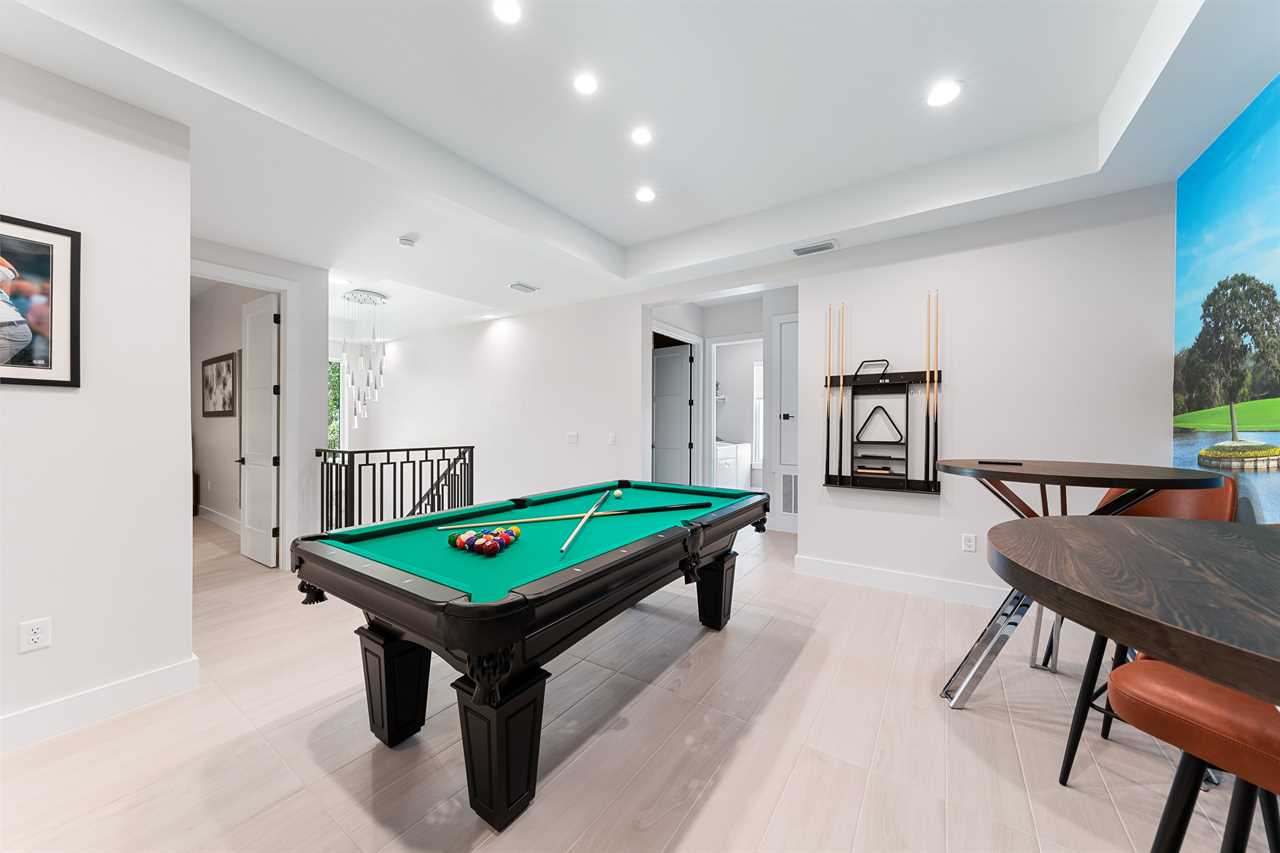 For entertainment, the home boasts a theater with 10 leather recliners, a bar that seats 6 on the back row, and a 140-inch projector screen with surround sound for an immersive viewing experience. The loft area includes a pool table, additional seating, and a wall-mounted TV, providing a fun space to relax.