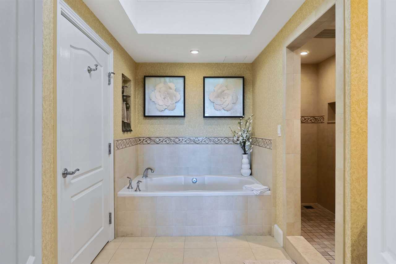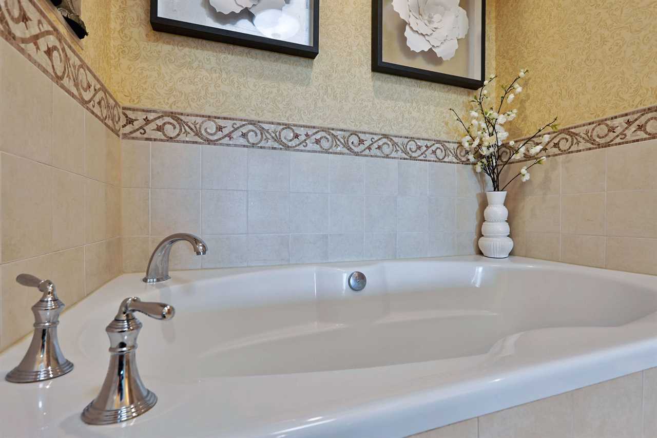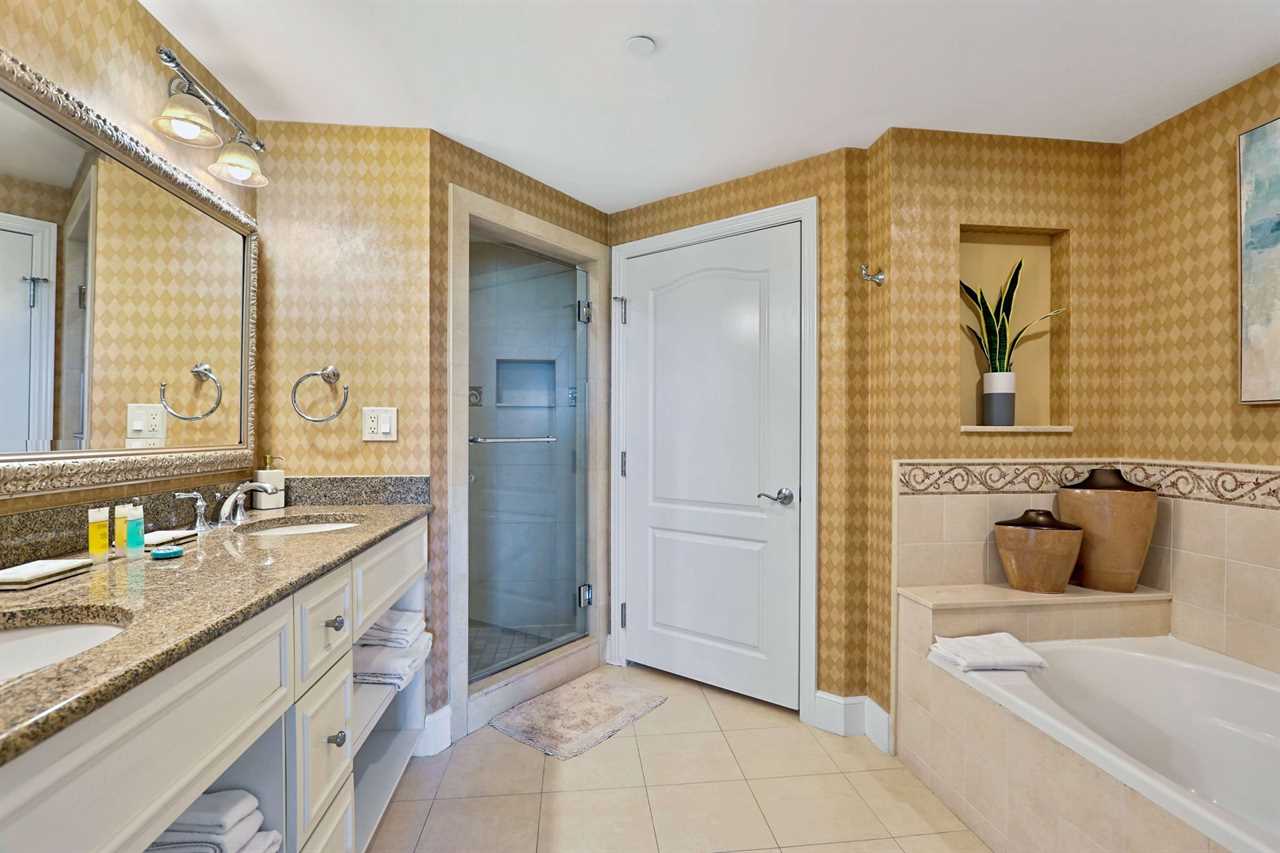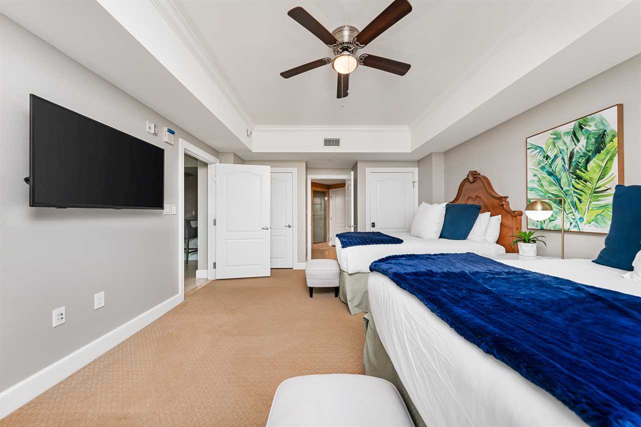 The home features two master bedrooms designed with your comfort in mind. The left queen/queen master suite includes a large wall-mounted Smart TV and a ceiling fan with light. Its en-suite bathroom boasts a double vanity, a tub, and a separate shower for a luxurious experience.