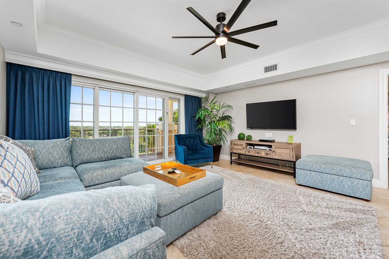 The living room is a spacious haven, showcasing a large sofa and an extra chair for relaxation. A ceiling fan with LED lighting enhances comfort, while a wall-mounted Smart TV and Xbox provide entertainment options for all ages.