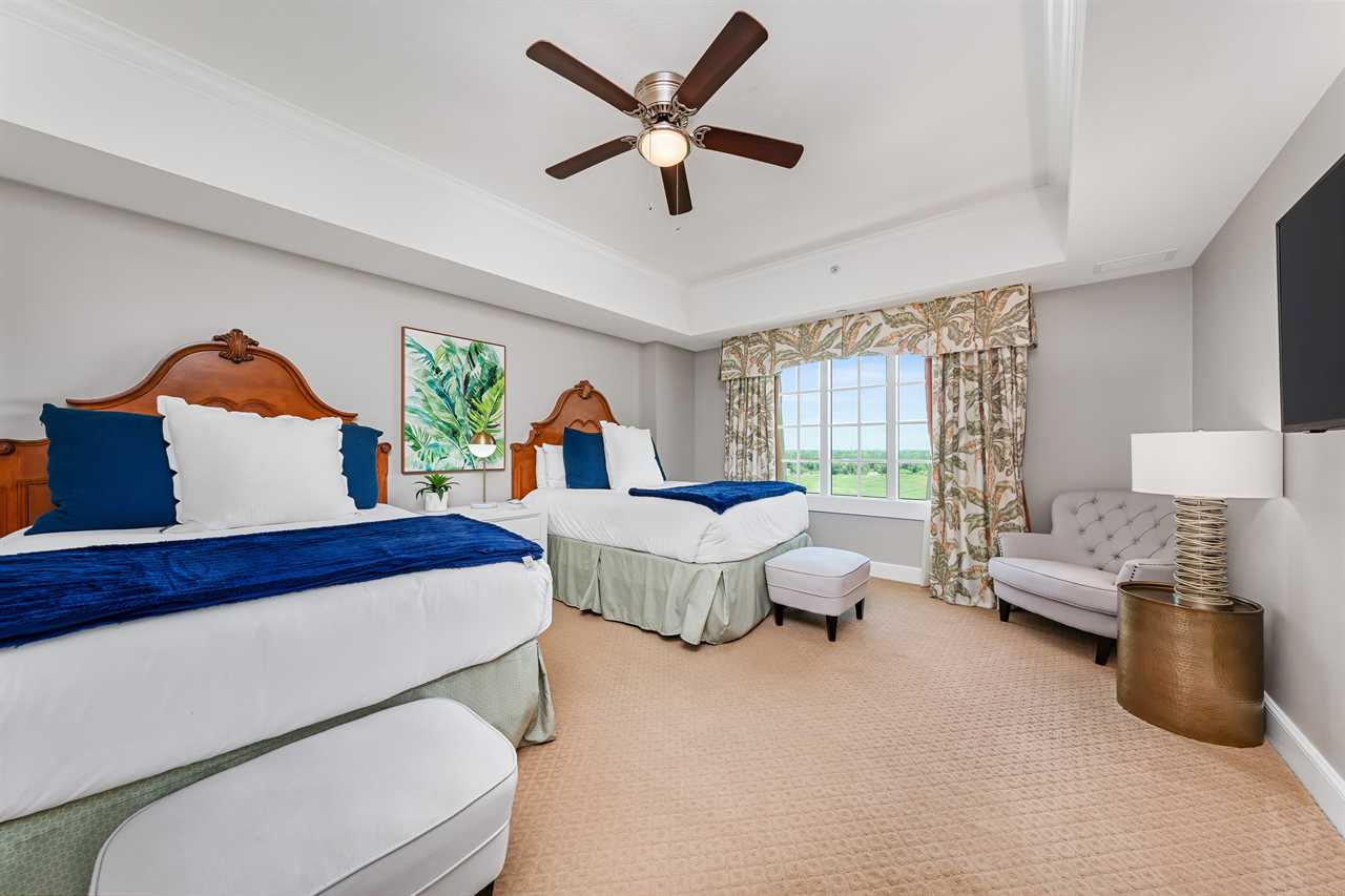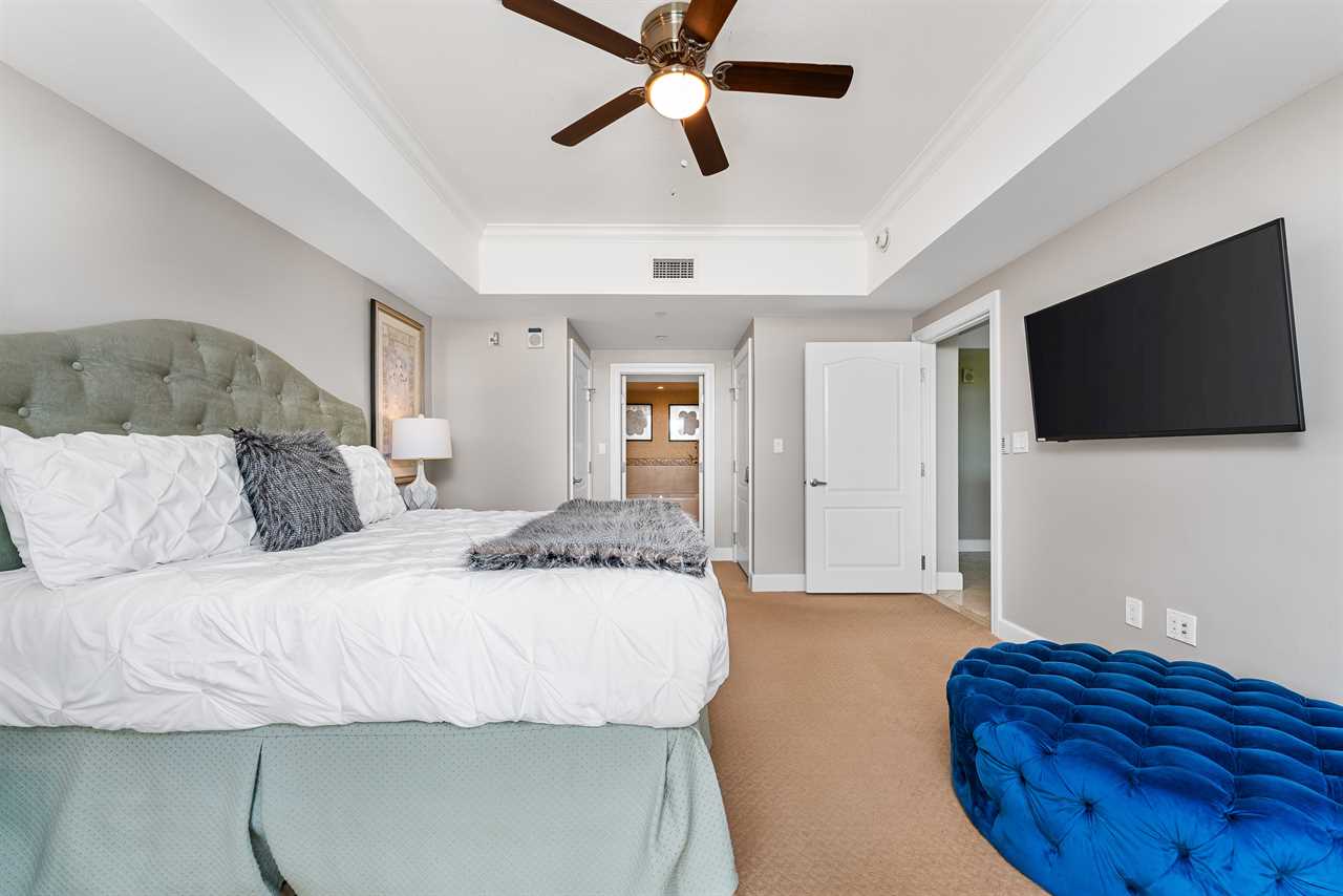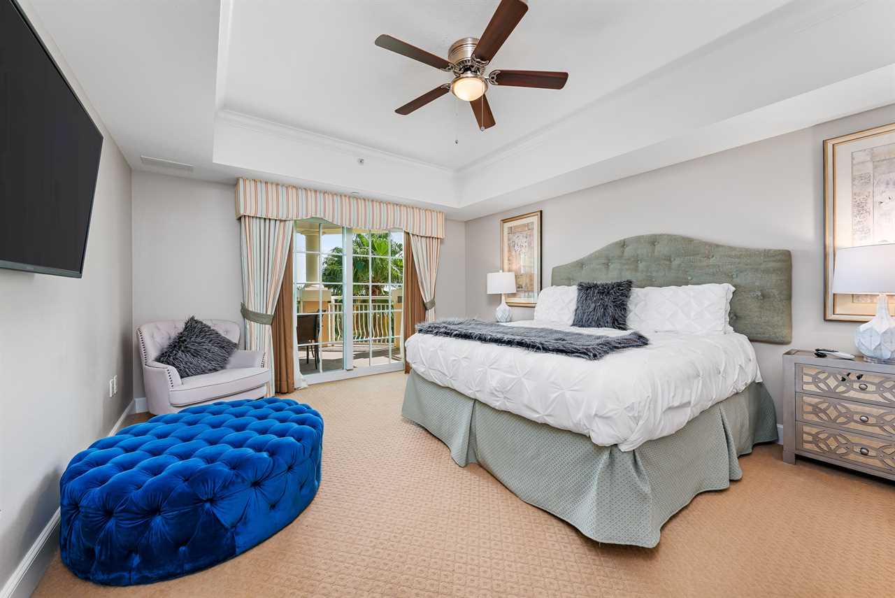 The right king master suite offers a ceiling fan with light, a cozy chair, and a door rest for added comfort. Enjoy the convenience of a wall-mounted Smart TV and direct access to the balcony, where you can savor the beautiful surroundings.