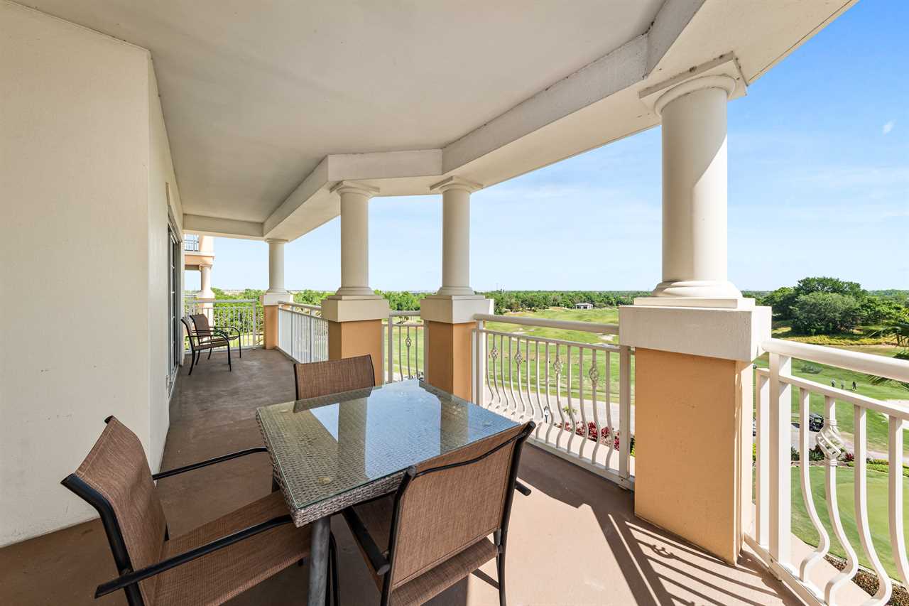 Step out onto the balcony, where a table and five chairs offer a picturesque setting for outdoor dining or simply enjoying the serene golf course views.