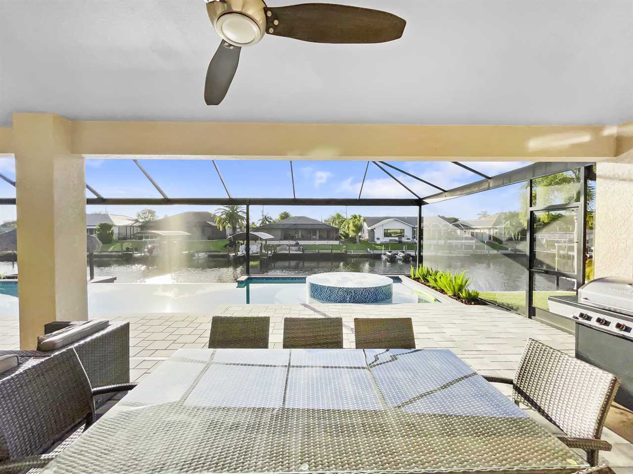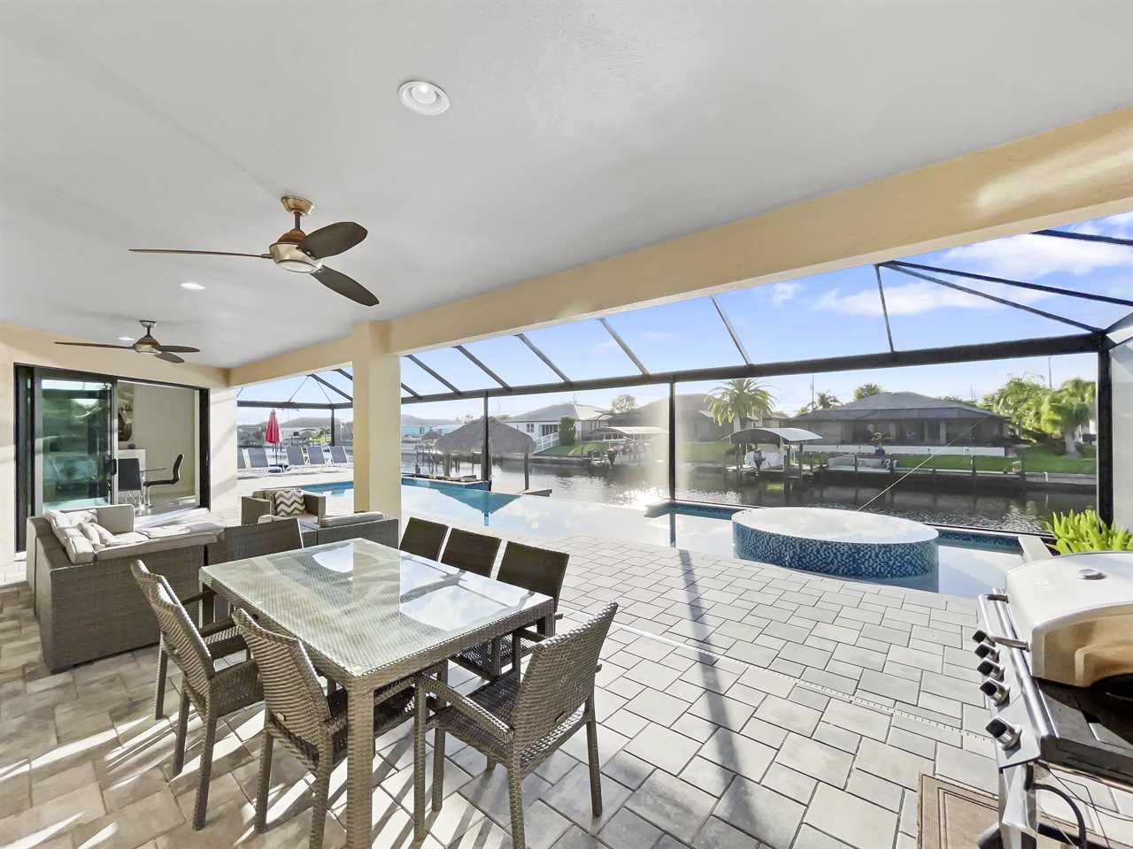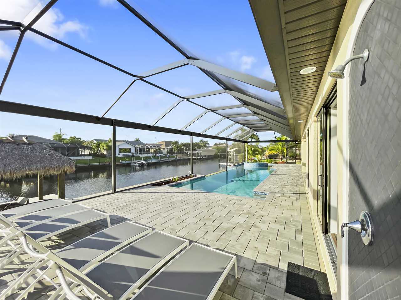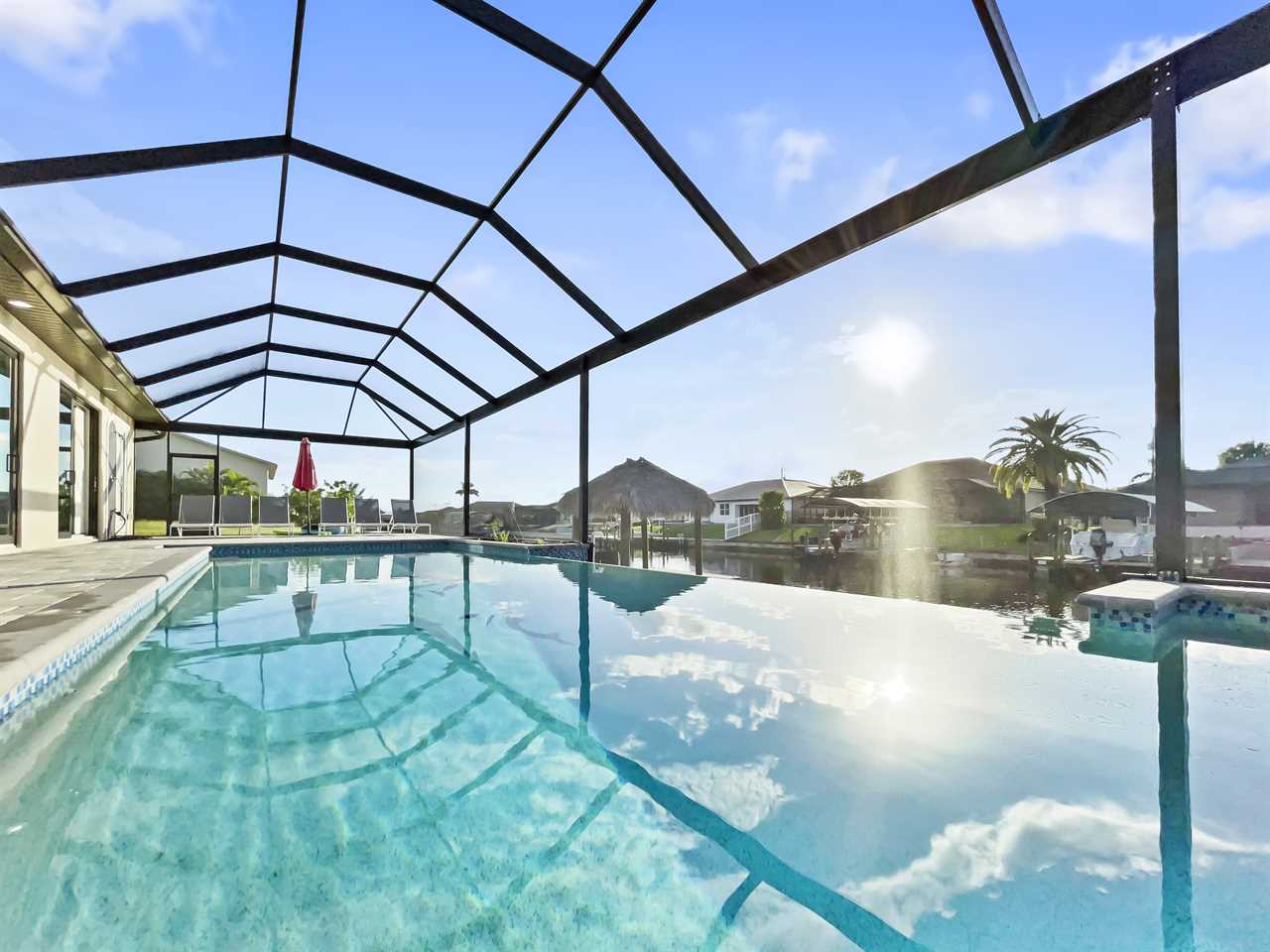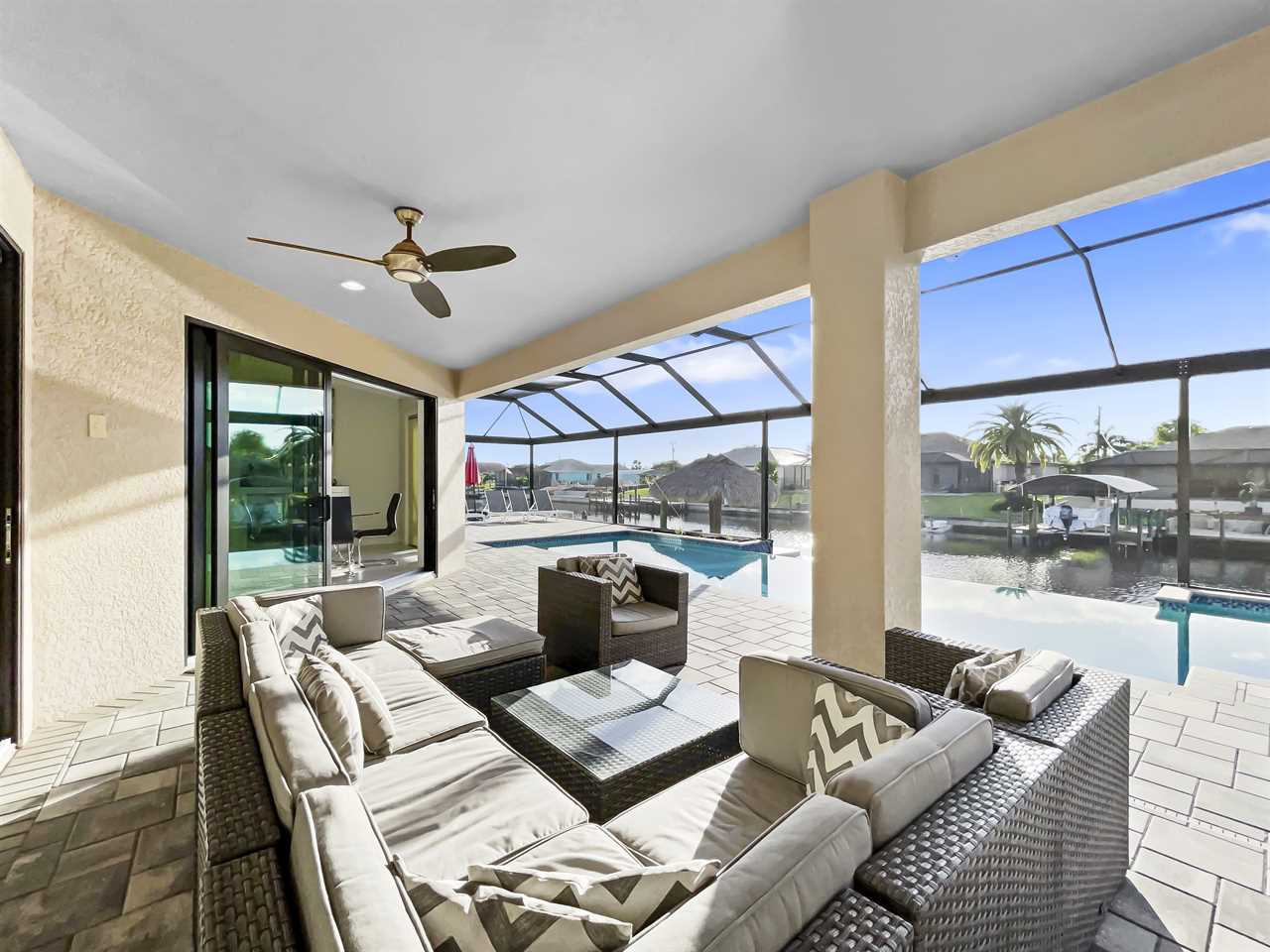 The waterfront home of Villa Royal Palm is a four-bedroom, four-bathroom home in Cape Coral for eight guests. The single-level home features neutral colors that fade away against lush tropical vegetation in bold green. A covered patio holds the entrance to the home and a soaring roof. Make yourself at home, then head outside to your outdoor oasis. The fully screened-in area boasts an in-ground pool with partial zero-edge and spillover spa. At one end of the pool is a deck with adjustable chaise lounges to enjoy a sunny Florida day, as well as an outdoor shower too rinse off before heading back inside. Under the covered patio, you'll find a BBQ grill for cooking up favorite foods and an outdoor dining set that seats the whole group. A large outdoor living set seats where everyone can relax and spend time together. The door at the other end allows easy access to the private dock and tiki hut with seating. Launch a kayak or tie up a boat for fun water sports.