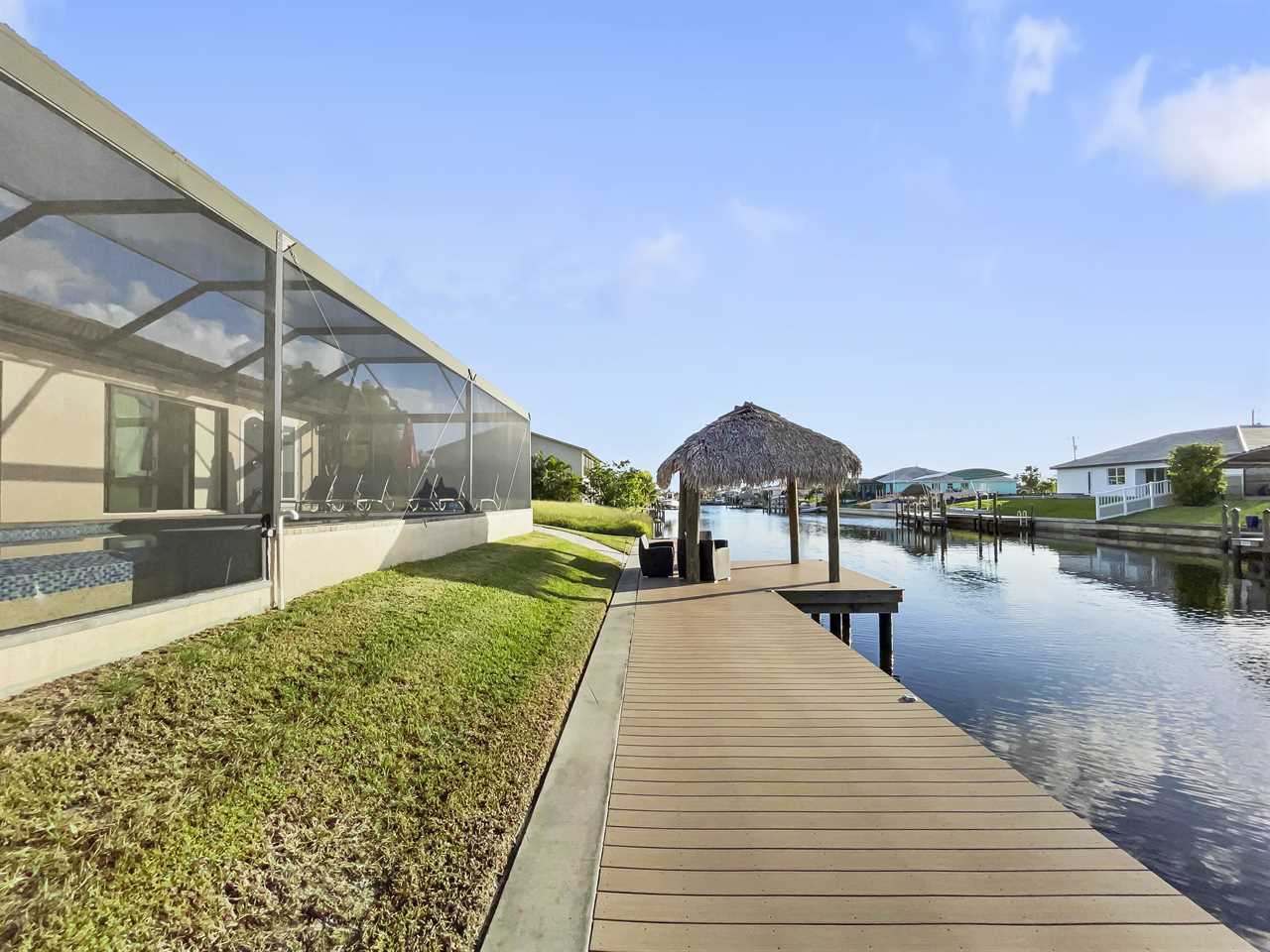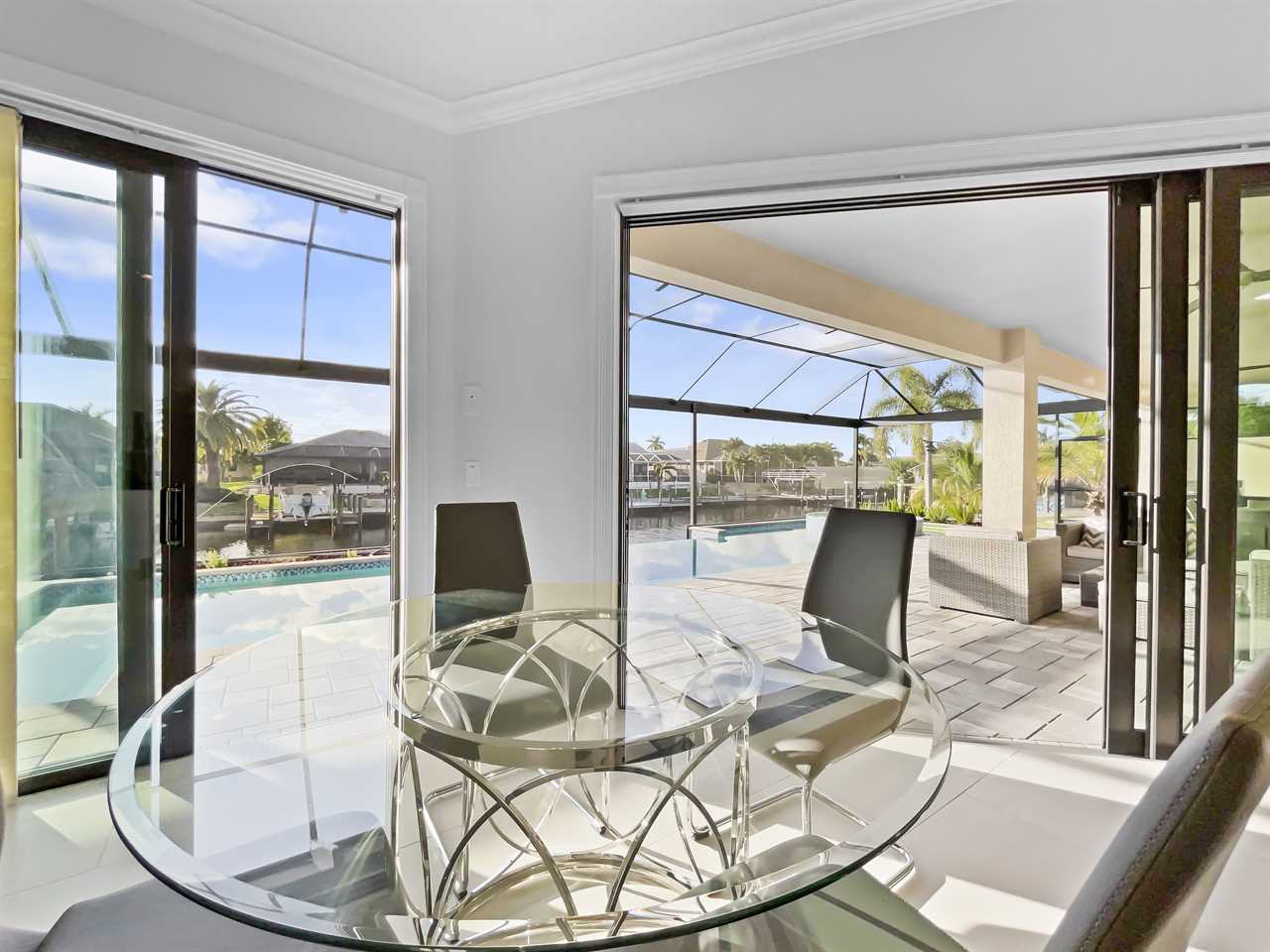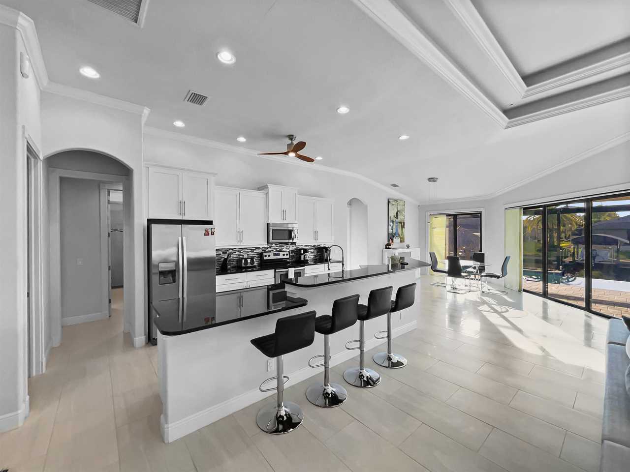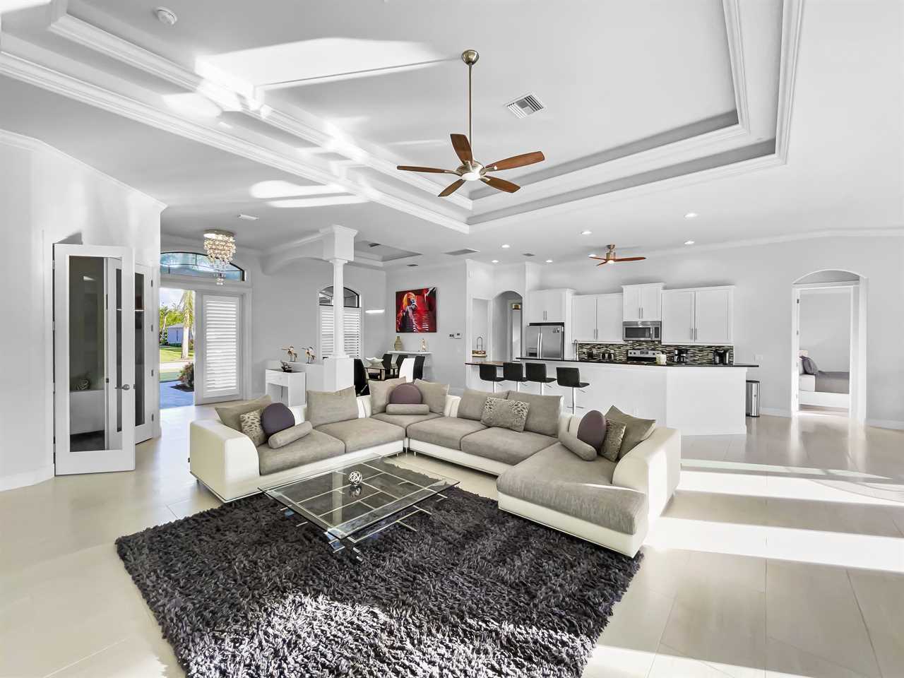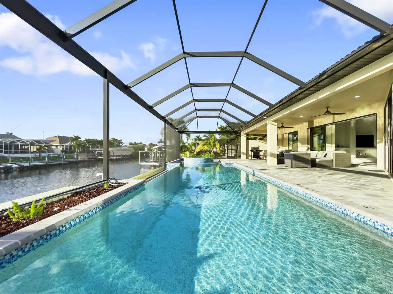 The waterfront home of Villa Royal Palm is a four-bedroom, four-bathroom home in Cape Coral for eight guests. The single-level home features neutral colors that fade away against lush tropical vegetation in bold green. A covered patio holds the entrance to the home and a soaring roof. Make yourself at home, then head outside to your outdoor oasis. The fully screened-in area boasts an in-ground pool with partial zero-edge and spillover spa. At one end of the pool is a deck with adjustable chaise lounges to enjoy a sunny Florida day, as well as an outdoor shower too rinse off before heading back inside. Under the covered patio, you'll find a BBQ grill for cooking up favorite foods and an outdoor dining set that seats the whole group. A large outdoor living set seats where everyone can relax and spend time together. The door at the other end allows easy access to the private dock and tiki hut with seating. Launch a kayak or tie up a boat for fun water sports.