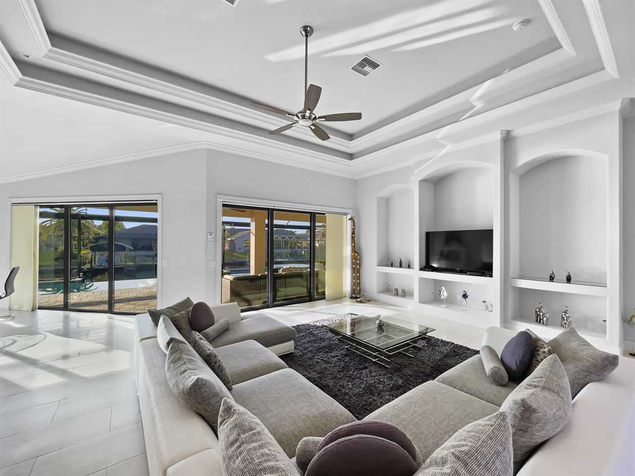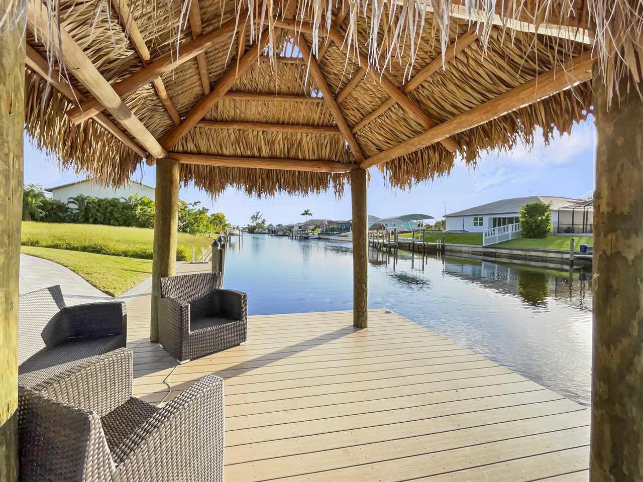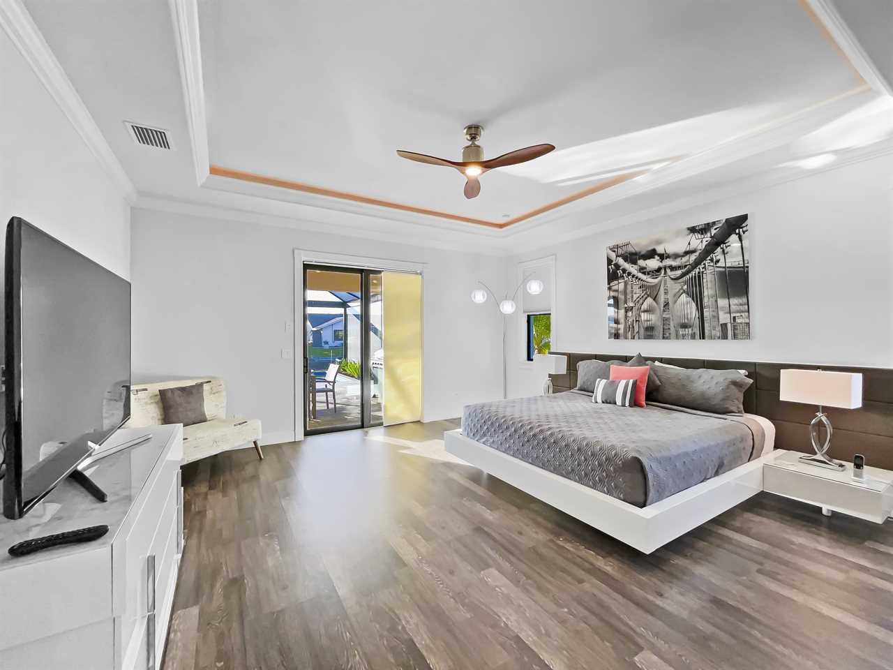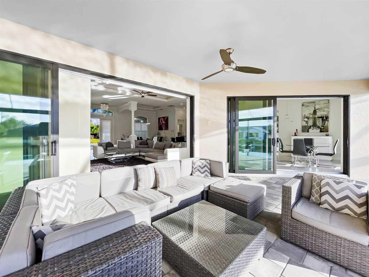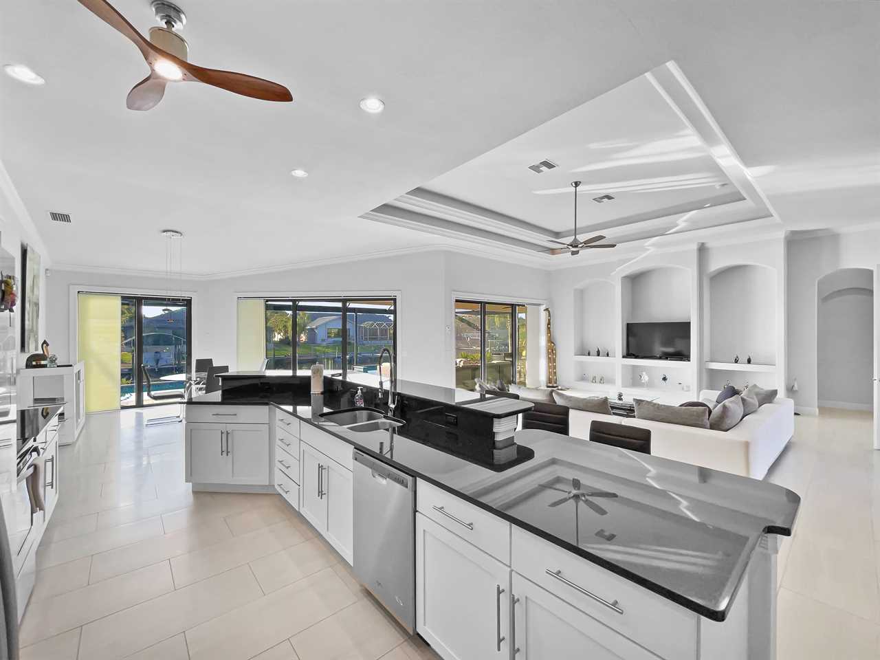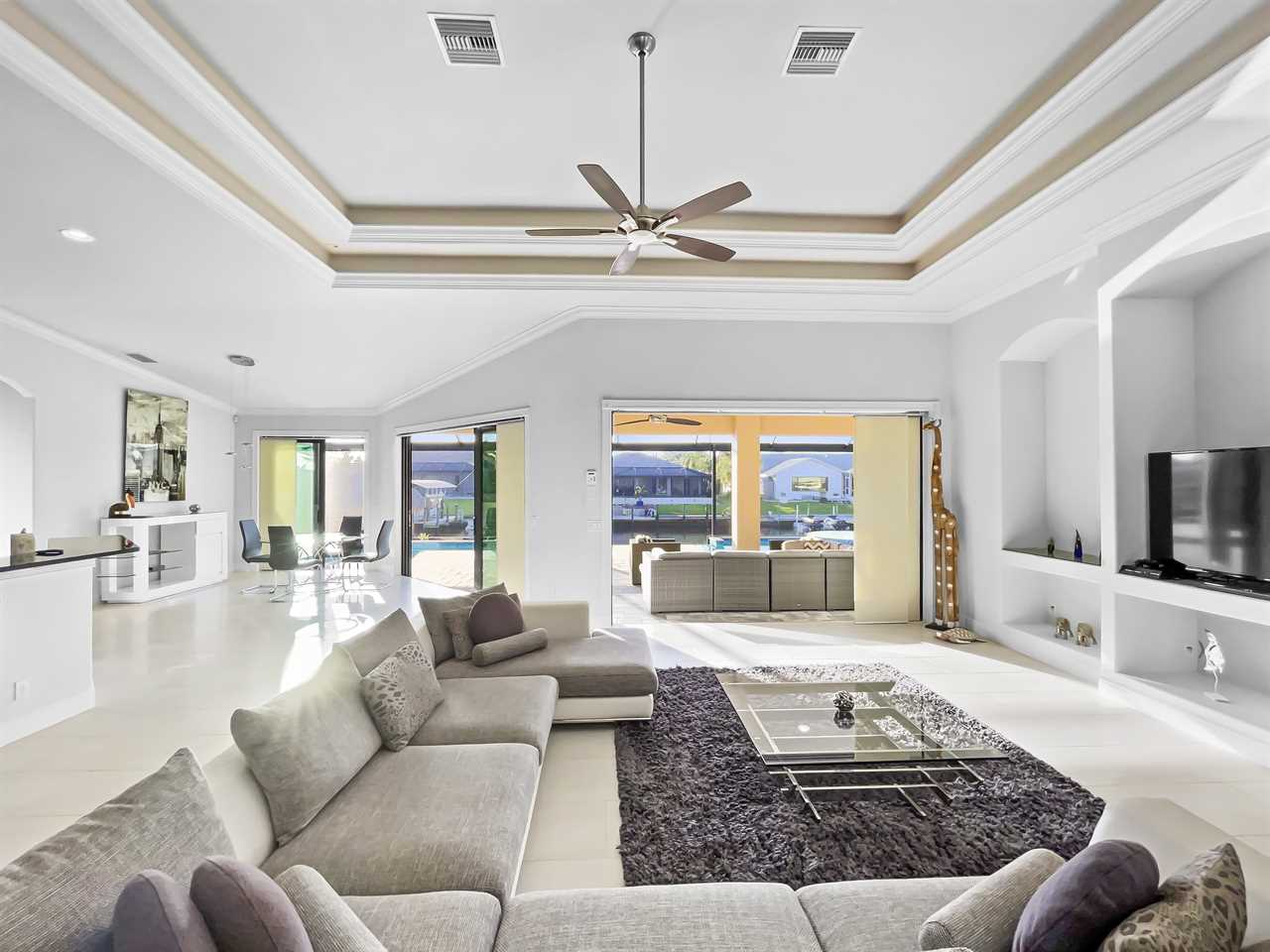 The waterfront home of Villa Royal Palm is a four-bedroom, four-bathroom home in Cape Coral for eight guests. The single-level home features neutral colors that fade away against lush tropical vegetation in bold green. A covered patio holds the entrance to the home and a soaring roof. Make yourself at home, then head outside to your outdoor oasis. The fully screened-in area boasts an in-ground pool with partial zero-edge and spillover spa. At one end of the pool is a deck with adjustable chaise lounges to enjoy a sunny Florida day, as well as an outdoor shower too rinse off before heading back inside. Under the covered patio, you'll find a BBQ grill for cooking up favorite foods and an outdoor dining set that seats the whole group. A large outdoor living set seats where everyone can relax and spend time together. The door at the other end allows easy access to the private dock and tiki hut with seating. Launch a kayak or tie up a boat for fun water sports.