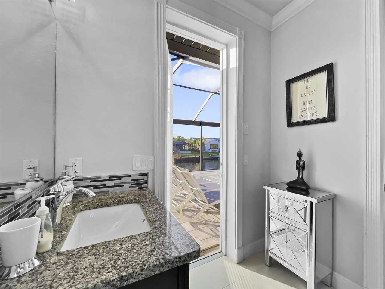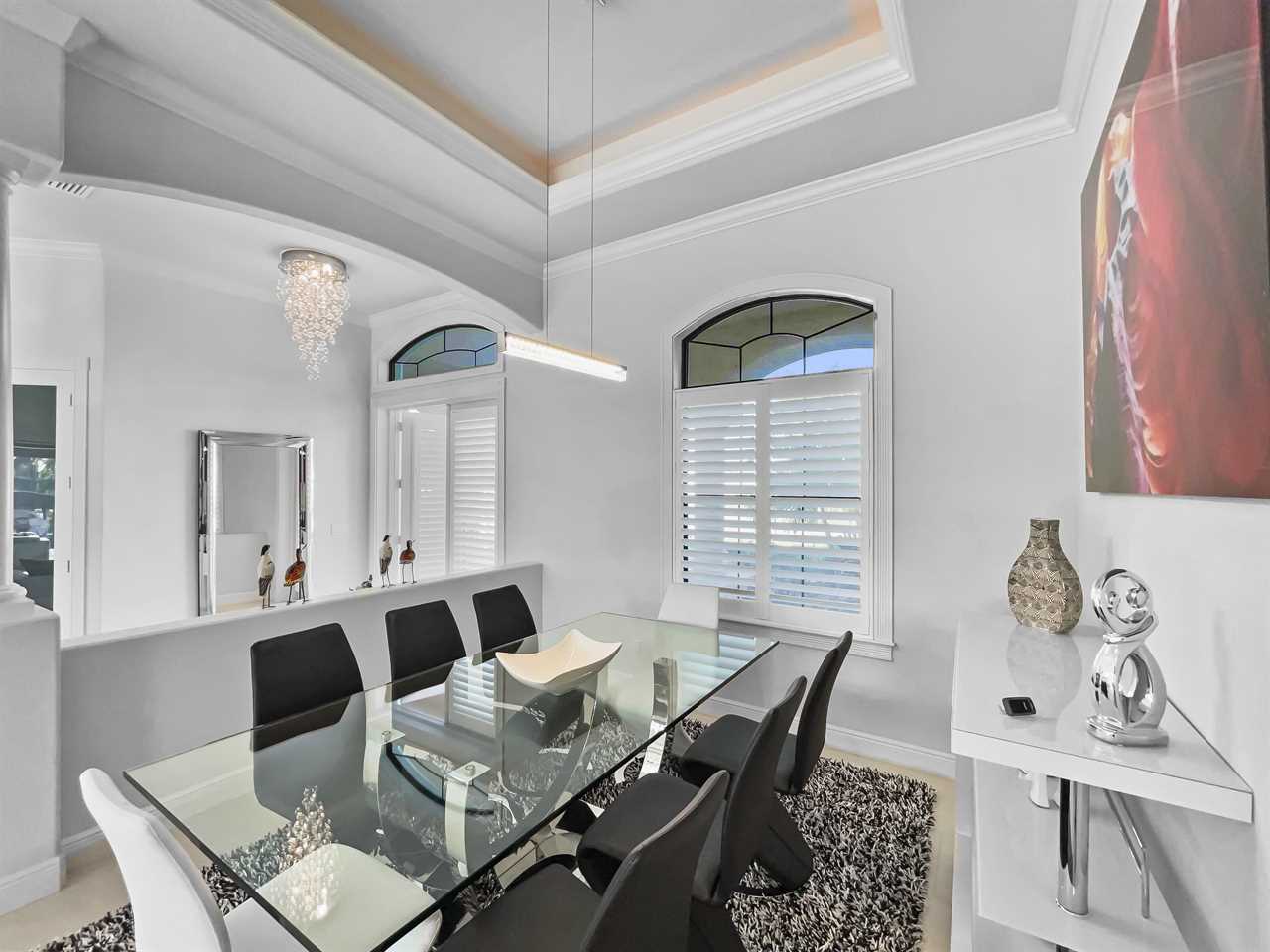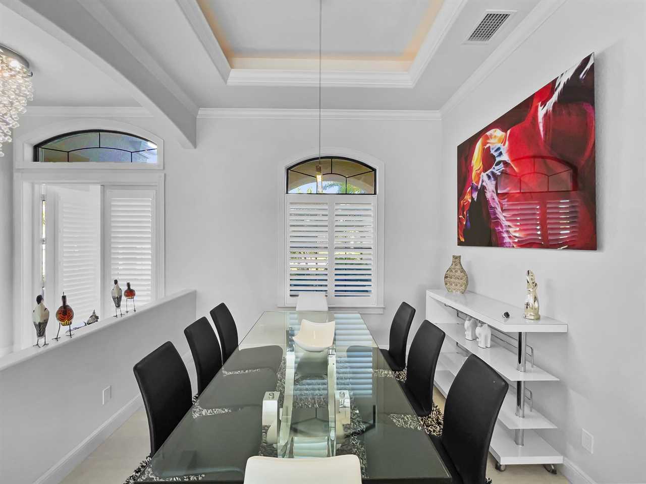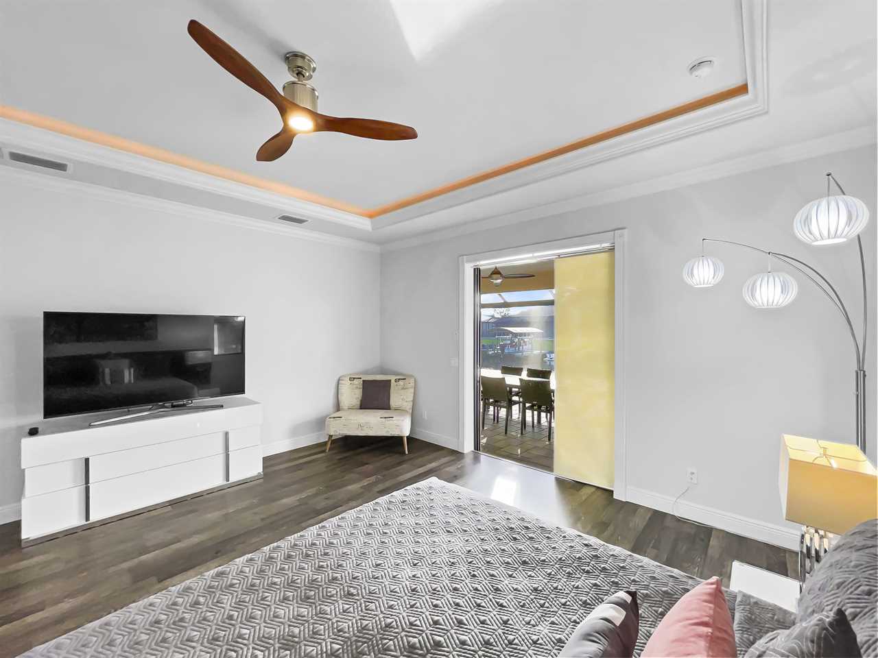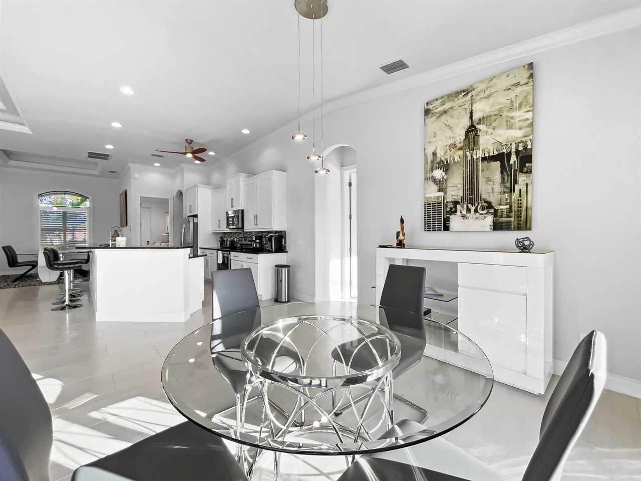 The waterfront home of Villa Royal Palm is a four-bedroom, four-bathroom home in Cape Coral for eight guests. The single-level home features neutral colors that fade away against lush tropical vegetation in bold green. A covered patio holds the entrance to the home and a soaring roof. Make yourself at home, then head outside to your outdoor oasis. The fully screened-in area boasts an in-ground pool with partial zero-edge and spillover spa. At one end of the pool is a deck with adjustable chaise lounges to enjoy a sunny Florida day, as well as an outdoor shower too rinse off before heading back inside. Under the covered patio, you'll find a BBQ grill for cooking up favorite foods and an outdoor dining set that seats the whole group. A large outdoor living set seats where everyone can relax and spend time together. The door at the other end allows easy access to the private dock and tiki hut with seating. Launch a kayak or tie up a boat for fun water sports.