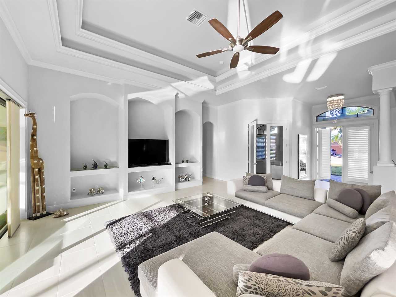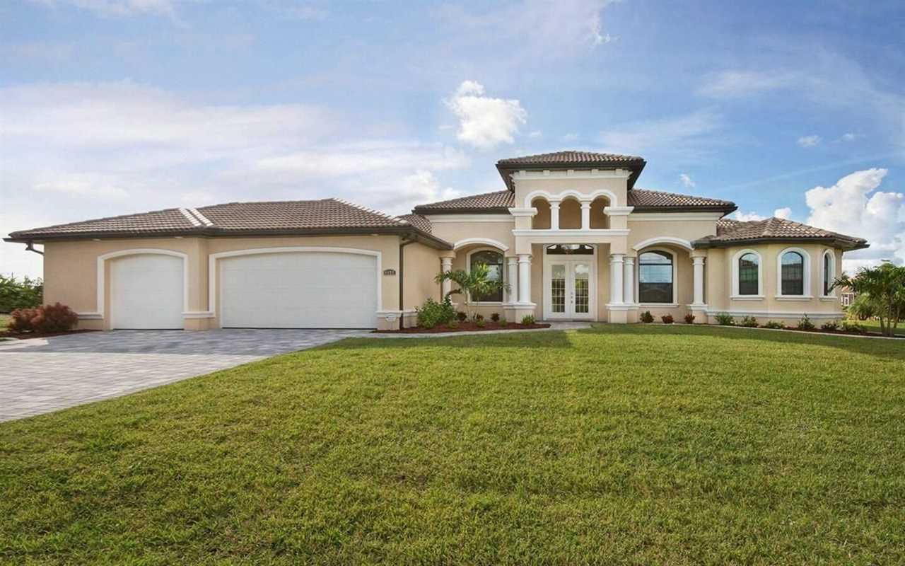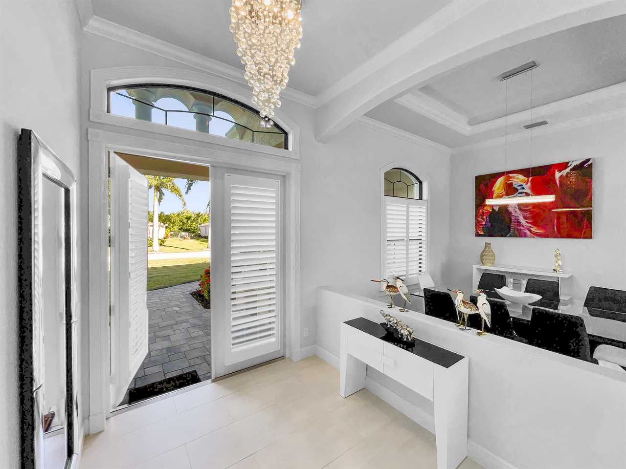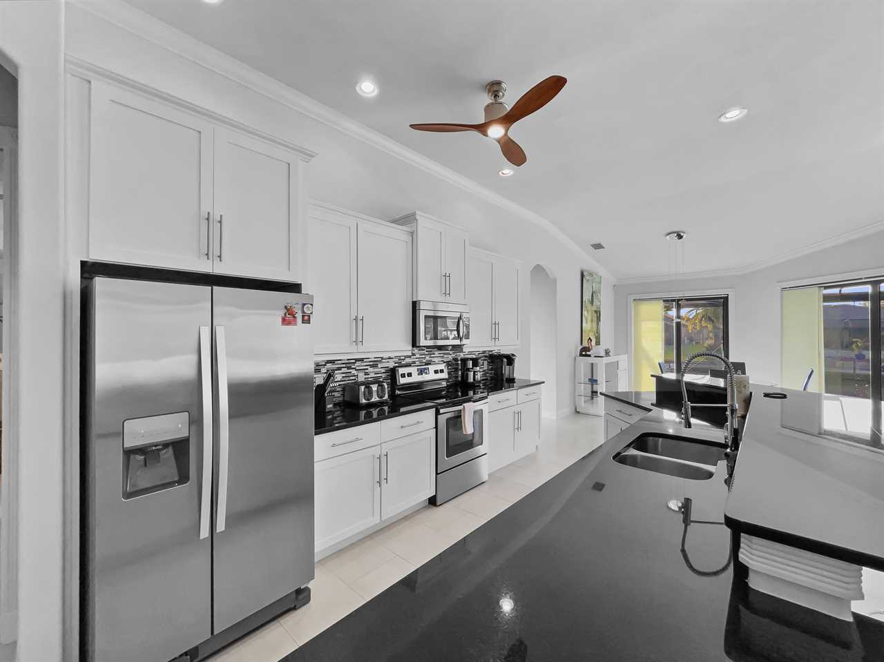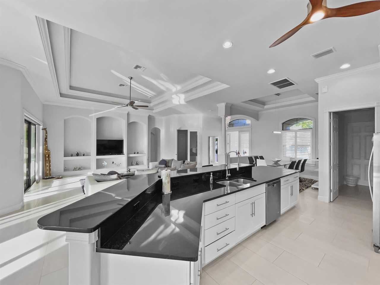 The waterfront home of Villa Royal Palm is a four-bedroom, four-bathroom home in Cape Coral for eight guests. The single-level home features neutral colors that fade away against lush tropical vegetation in bold green. A covered patio holds the entrance to the home and a soaring roof. Make yourself at home, then head outside to your outdoor oasis. The fully screened-in area boasts an in-ground pool with partial zero-edge and spillover spa. At one end of the pool is a deck with adjustable chaise lounges to enjoy a sunny Florida day, as well as an outdoor shower too rinse off before heading back inside. Under the covered patio, you'll find a BBQ grill for cooking up favorite foods and an outdoor dining set that seats the whole group. A large outdoor living set seats where everyone can relax and spend time together. The door at the other end allows easy access to the private dock and tiki hut with seating. Launch a kayak or tie up a boat for fun water sports.