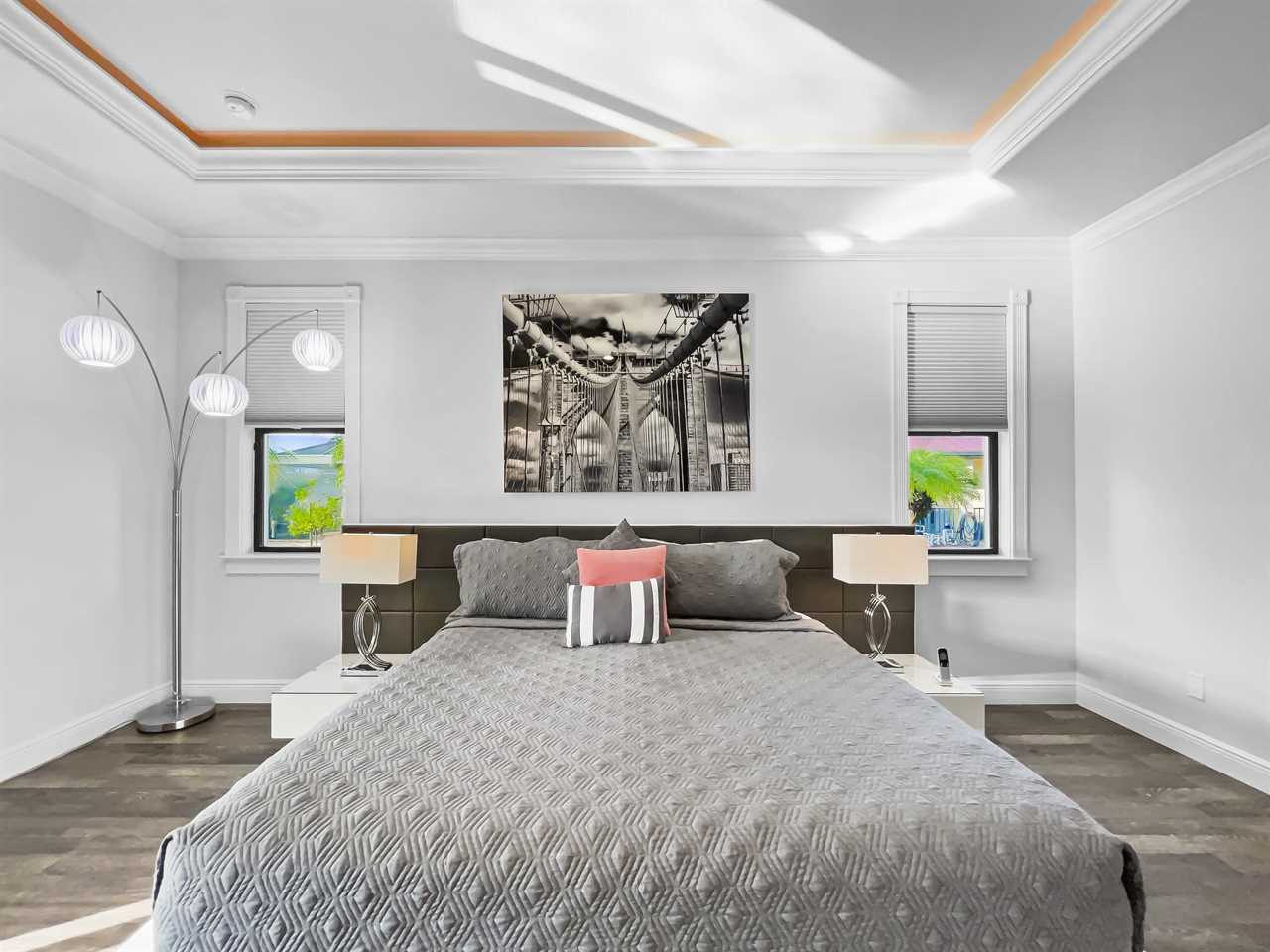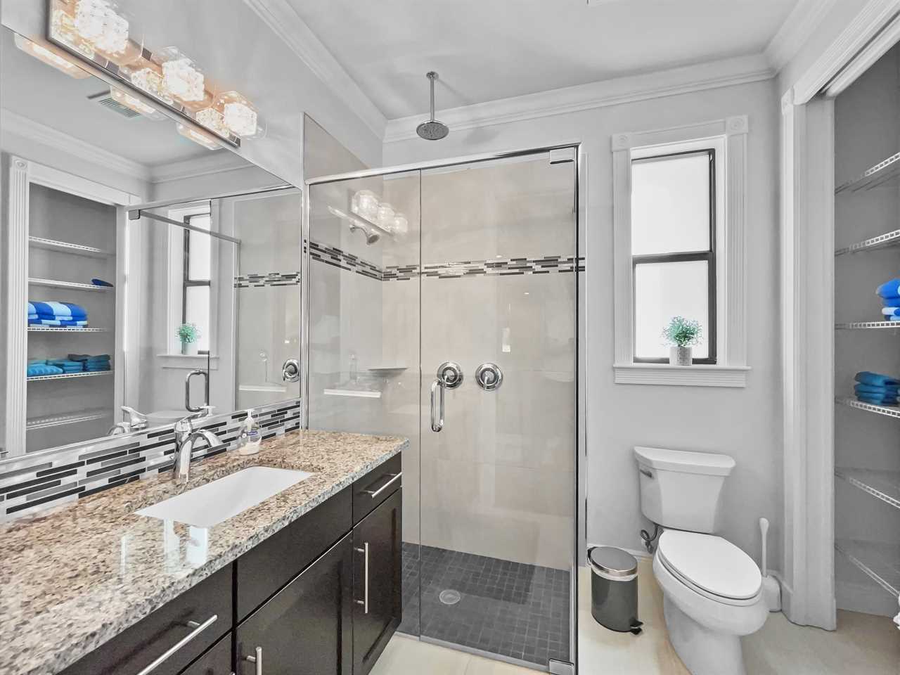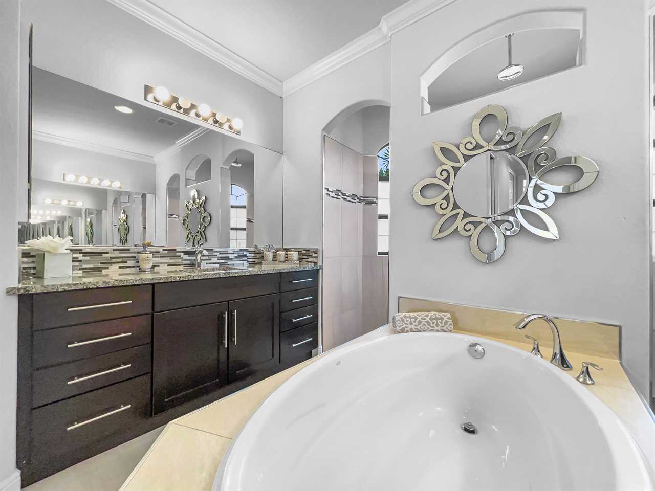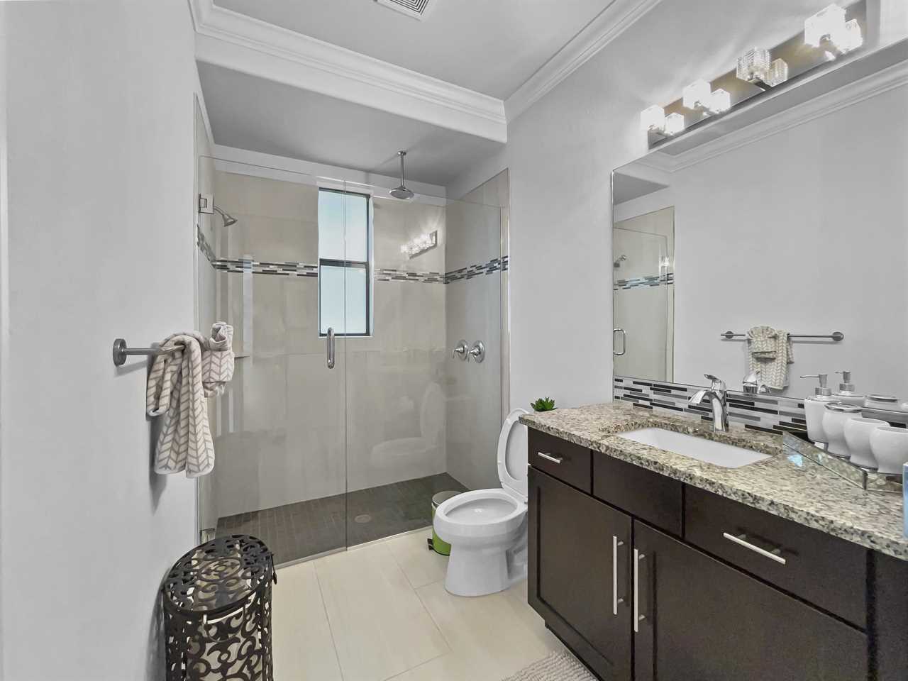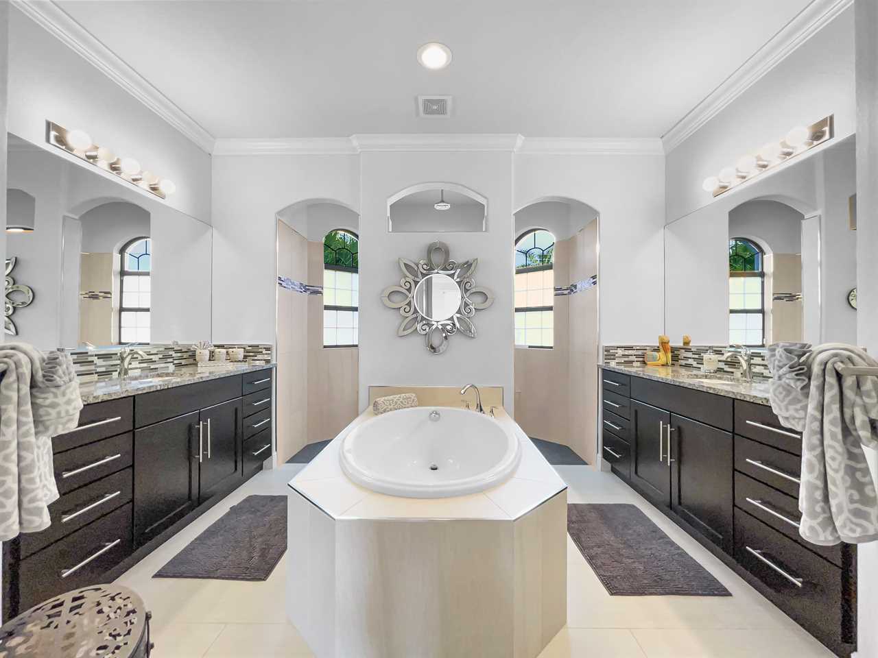 At the end of the day, choose a private bedroom. The master suite boasts a king bedroom set with custom headboard, sitting area, and flat screen TV. Enjoy private access to the outside space too! The master bathroom features a massive shower stall with dual entrances and multiple shower heads, and separate soaking tub. “His” and “hers” vanities are separated by the tub in the center of the room.