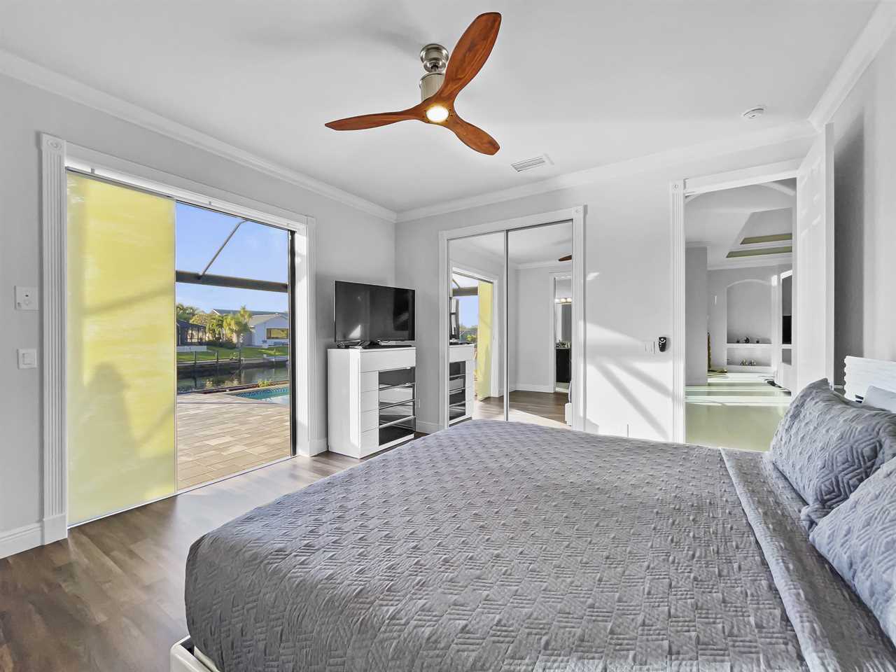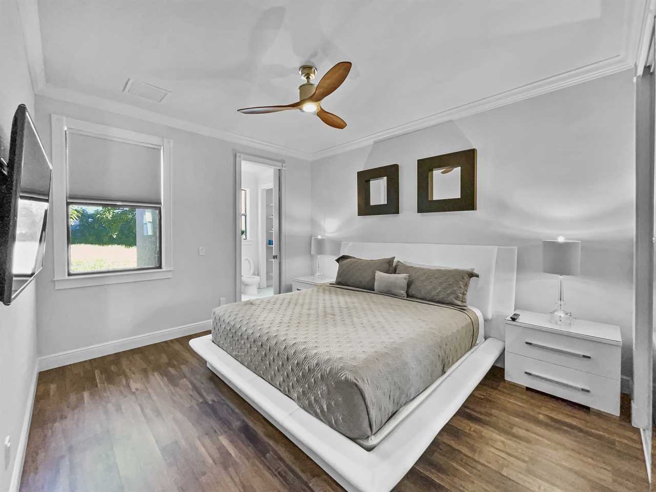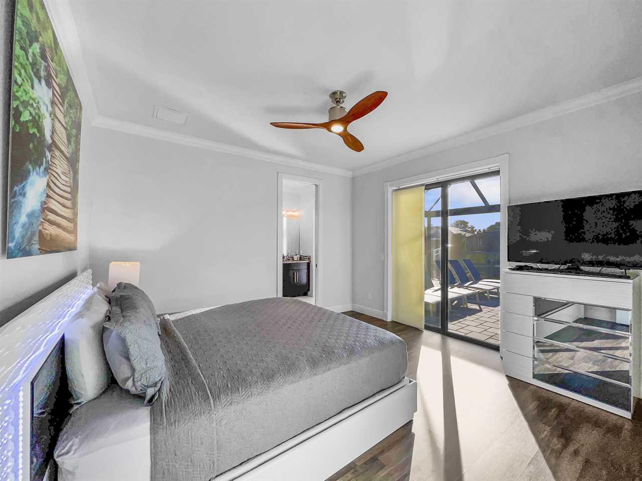 The remaining bedrooms each have an en suite bathroom that features a large shower stall with multiple shower heads and single-sink vanity. The second boasts and upholstered king bed, night tables, a wall-mounted flat screen TV, and access to a side yard and patio area. The third bedroom features an upholstered king bed, night tables, and a wall-mounted flat screen TV. The final bedroom features an upholstered king bed with backlit headboard, night tables, flat screen TV, and access to the outdoor space. The en suite bath also features access from outside so you can clean up without dripping water through the home.