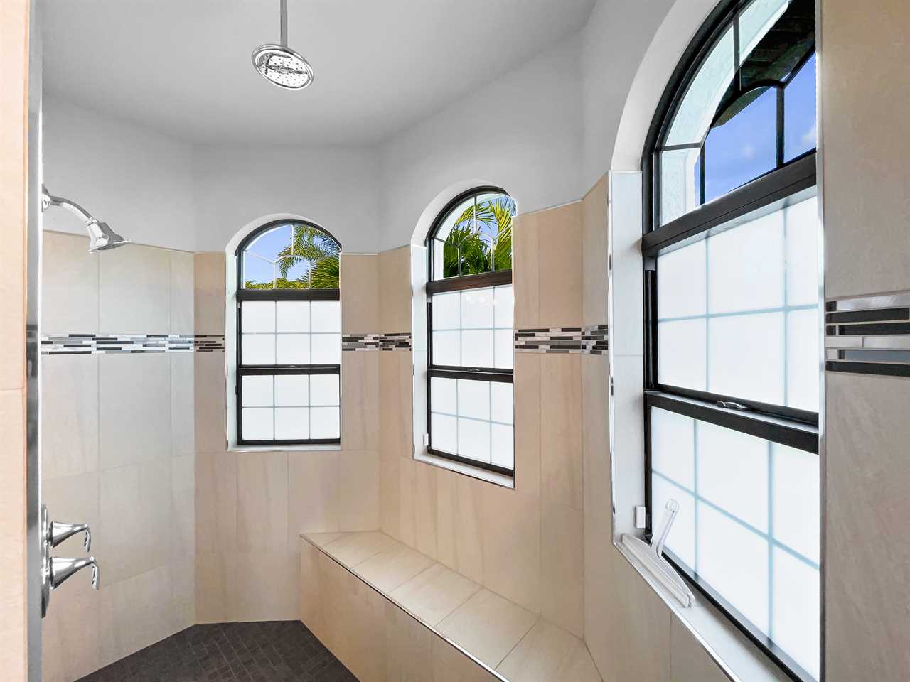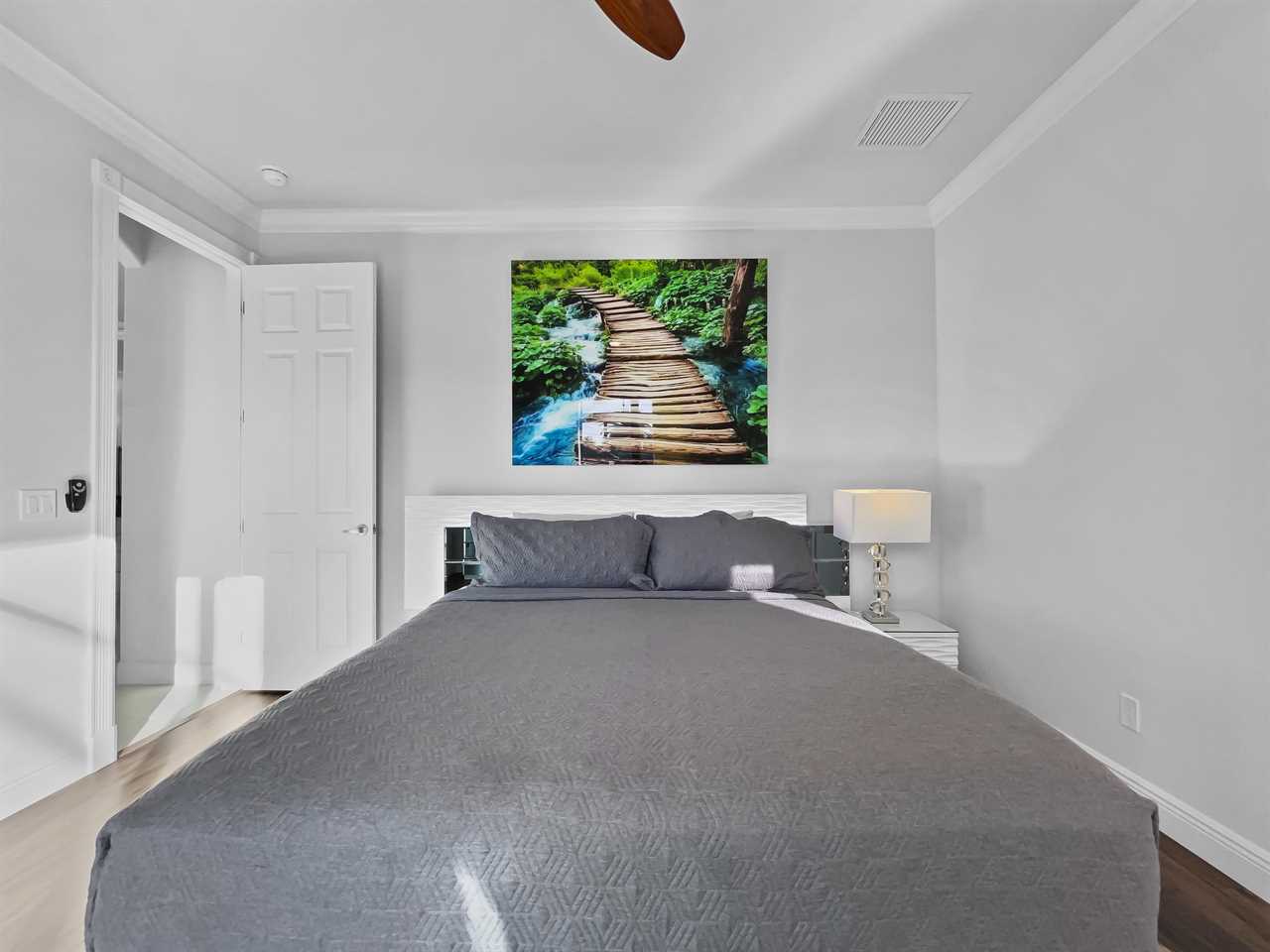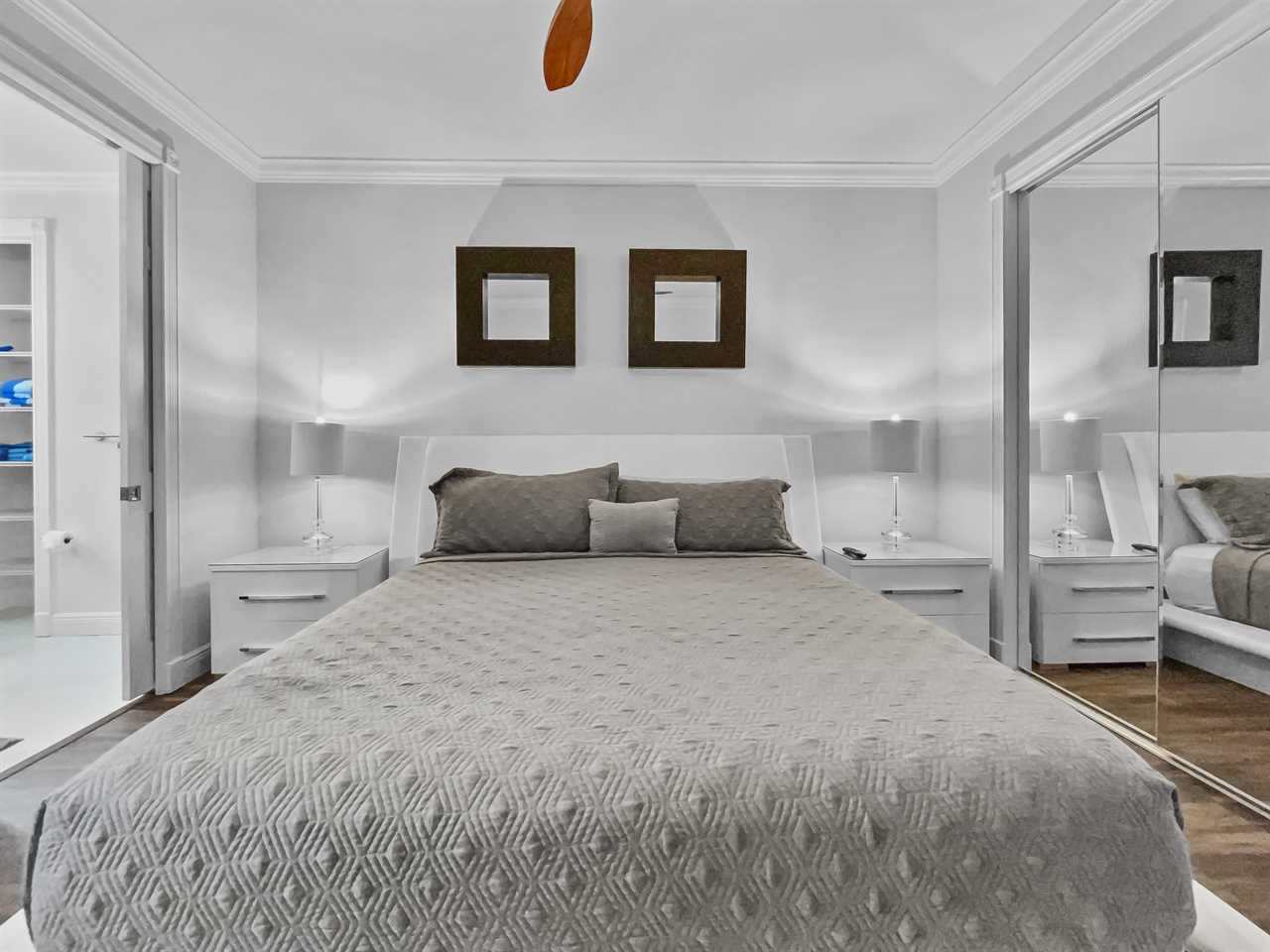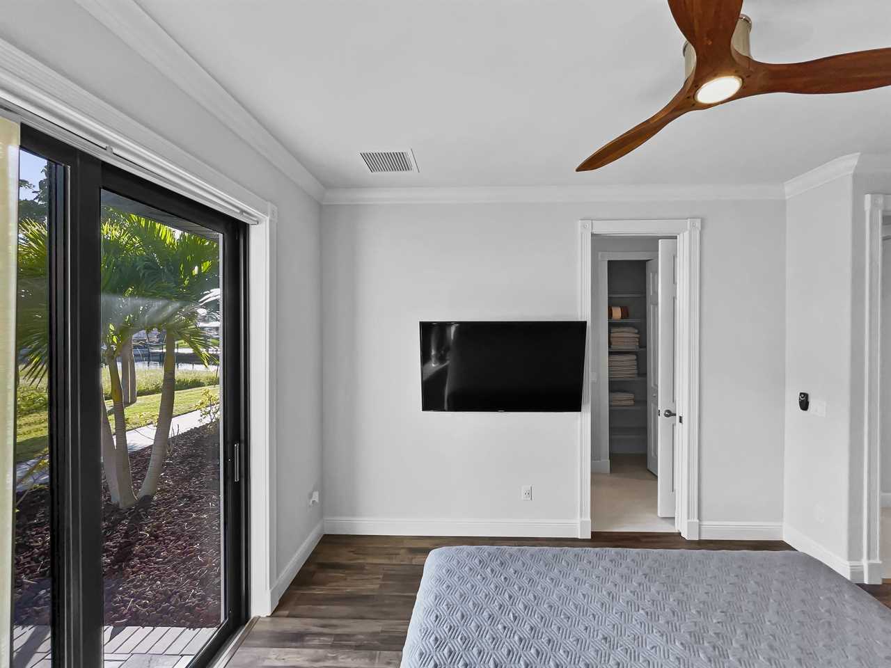 The remaining bedrooms each have an en suite bathroom that features a large shower stall with multiple shower heads and single-sink vanity. The second boasts and upholstered king bed, night tables, a wall-mounted flat screen TV, and access to a side yard and patio area. The third bedroom features an upholstered king bed, night tables, and a wall-mounted flat screen TV. The final bedroom features an upholstered king bed with backlit headboard, night tables, flat screen TV, and access to the outdoor space. The en suite bath also features access from outside so you can clean up without dripping water through the home.