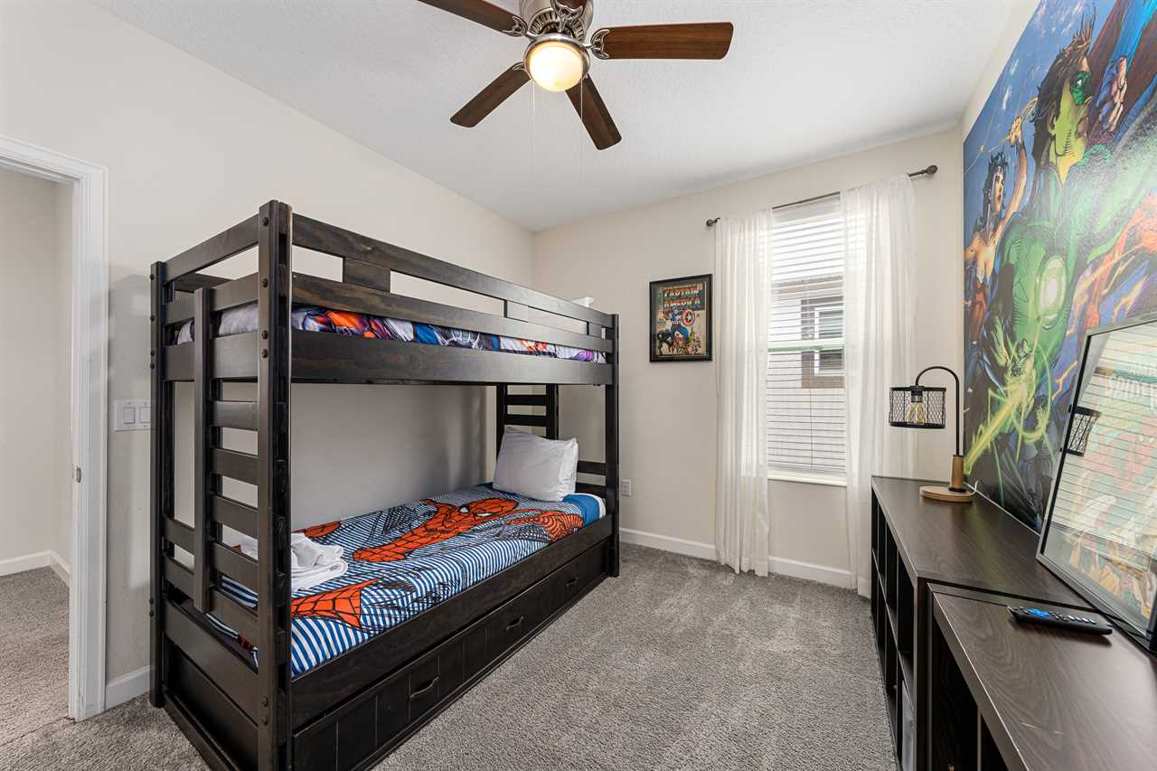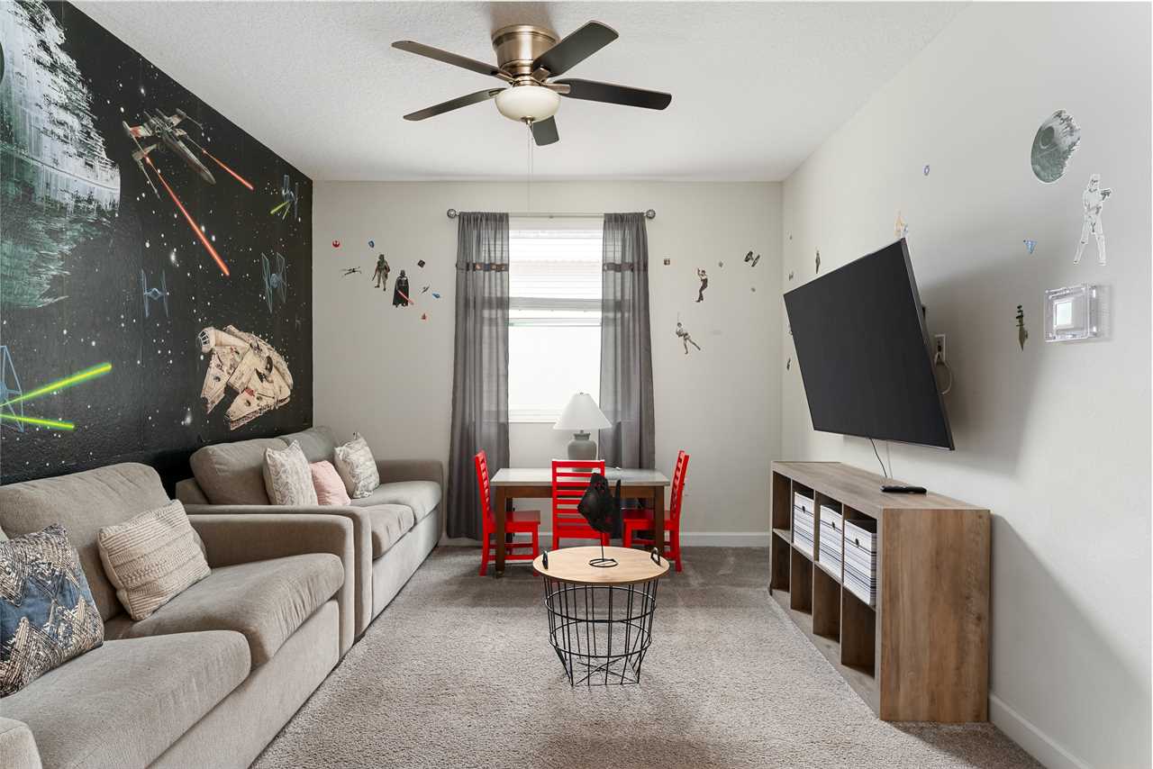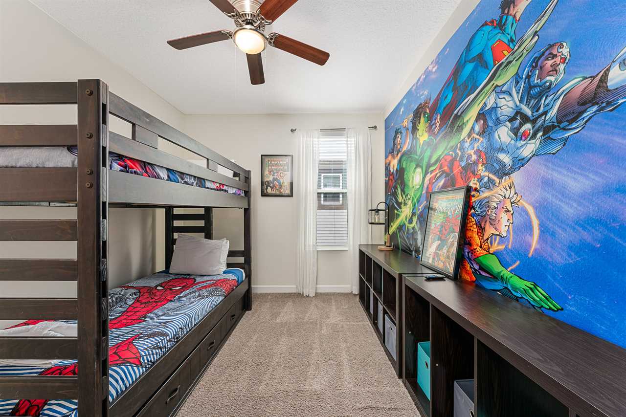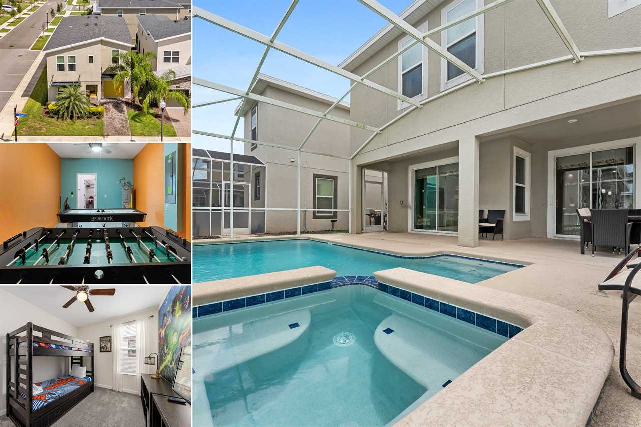 Property Reference: #TR_612BR This beautiful home in The Retreat at Champions Gate is located on a desirable corner lot, offering ample space and privacy. Inside, the open-concept living space is designed for comfort and relaxation. The kitchen features a large island with bar seating for five, making it a perfect spot for casual dining or entertaining. Adjacent, the dining area comfortably seats eight, providing a more formal setting for meals. The living room is furnished with two cozy sofas equipped with recliners, centered around a large wall-mounted smart TV. A ceiling fan adds comfort, creating an inviting space for family and friends to gather. The outdoor area is a private oasis with a screened-in pool and spillover spa, perfect for cooling off or unwinding. The patio includes an outdoor dining table for six and additional seating, making it an ideal setting for alfresco dining or simply enjoying the Florida sunshine. Entertainment options abound in this home, with a games room that features both an air hockey table and foosball, providing fun for guests of all ages. The loft upstairs offers additional living space, complete with two sofas, a kids' seating area, and a large wall-mounted smart TV, all kept cool with a ceiling fan. The home includes six bedrooms, each thoughtfully designed for comfort and style. Downstairs, there is a queen bedroom with a wall-mounted TV and ceiling fan, offering a cozy retreat. Upstairs, the back king master suite features a wall-mounted smart TV and a ceiling fan, along with a private master bath equipped with a double vanity and a spacious shower. The upstairs also features a twin/twin bunk room, complete with a wall-mounted smart TV, and a super hero-themed twin/twin bunk room, which also includes a wall-mounted TV. Conveniently located outside the themed bunk room is a full bath with a tub/shower combo. Additional sleeping arrangements include a queen bedroom with a wall-mounted smart TV and ceiling fan, and another king master suite that boasts a wall-mounted smart TV and a luxurious en-suite bathroom with a double vanity, tub, and shower. This property offers complimentary high-speed wireless internet, ensuring you stay connected throughout your stay. The smoke-free and pet-free environment guarantees a pristine atmosphere for your comfort. Towels and linens are provided, allowing you to travel light and stress-free. The fully equipped kitchen, washer, and dryer add to the convenience, while keyless entry ensures a seamless arrival and departure experience. With its blend of comfort, entertainment, and stylish design, this home at The Retreat at Champions Gate offers a perfect escape for families and groups seeking both relaxation and fun. Property Summary General Complimentary high-speed wireless internet Smoke-free and pet-free for your comfort Towels and linens are provided Fully equipped kitchen Keyless entry Bedroom / Bed Sizes Bedroom 1 - Queen (Downstairs) Bedroom 2 - King (Upstairs) Bedroom 3 - Twin/Twin Bunk (Upstairs) Bedroom 4 - Twin/Twin Bunk (Upstairs) Bedroom 5 - Queen (Upstairs) Bedroom 6 - King (Upstairs) Games Area Air hockey Foosball Pool Area Private screened-in pool Spillover spa Outside furniture Sun loungers Children Equipment Pack n play High chair Stroller Laundry Room Full-size washer and dryer Ironing board & Iron Why book this rental? Professionally managed to offer you a superior, personalized service No hassle with key pick-up! Drive straight to your vacation rental! Detailed guest information guide provided within each property Terms and Conditions Check-in time is 4:00 pm Check-out time is 10:00 am All properties are non-smoking and no pets are allowed An Accidental Damage Protection (ADP) fee will be required to cover any reported accidental damage to this property and its contents There is a one-time departure cleaning fee for all stays Final payment due 45 days prior to your arrival The guest making the reservation must be 25 years of age or older. Bookings made within 30 days of the arrival date must check-in during office hours before the access information is released. The credit/debit card used for payment must be shown along with a valid driving license or passport in the same name as the card. As well as a utility bill with the same address as the card billing address. Pre-Paid cards are not accepted. Vacation rentals may not be used for events or group gatherings that exceed the maximum occupancy. A rental agreement must be signed by the lead guest making the reservation, along with a full list of guest names that will be staying in the property. We use a third party to verify identification and fraud risk, based on the findings we could cancel the reservation. This property does not include a BBQ, however, we do have them available for rental. Pool heat is available and is recommended from the 31st Oct. to the 31st Mar. If you would like the Spillover Spa to be heated you will need to add pool heat to your reservation. Max of 6 cars per address Third party platforms such as Airbnb may not allow optional fees to be displayed in the check-out cart of their website. Optional fees can include items such as early check-in, late check-out, mid stay cleans and pool heat. These items can be added directly with Florida Vacation Homes after the reservation has been made.