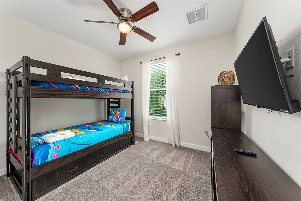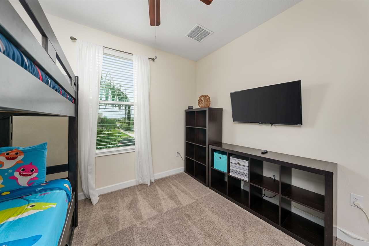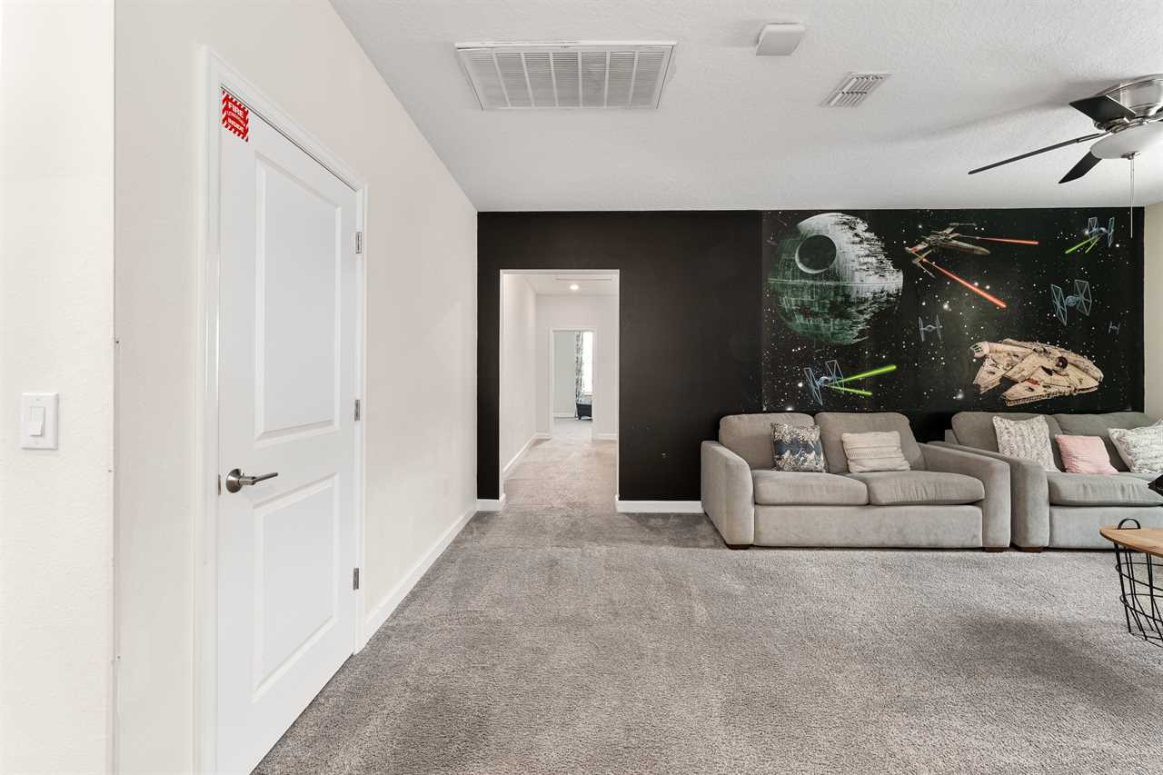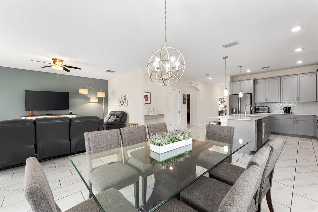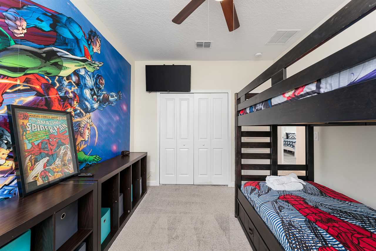 Property Reference: #TR_612BR This beautiful home in The Retreat at Champions Gate is located on a desirable corner lot, offering ample space and privacy. Inside, the open-concept living space is designed for comfort and relaxation. The kitchen features a large island with bar seating for five, making it a perfect spot for casual dining or entertaining. Adjacent, the dining area comfortably seats eight, providing a more formal setting for meals. The living room is furnished with two cozy sofas equipped with recliners, centered around a large wall-mounted smart TV. A ceiling fan adds comfort, creating an inviting space for family and friends to gather. The outdoor area is a private oasis with a screened-in pool and spillover spa, perfect for cooling off or unwinding. The patio includes an outdoor dining table for six and additional seating, making it an ideal setting for alfresco dining or simply enjoying the Florida sunshine. Entertainment options abound in this home, with a games room that features both an air hockey table and foosball, providing fun for guests of all ages. The loft upstairs offers additional living space, complete with two sofas, a kids' seating area, and a large wall-mounted smart TV, all kept cool with a ceiling fan. The home includes six bedrooms, each thoughtfully designed for comfort and style. Downstairs, there is a queen bedroom with a wall-mounted TV and ceiling fan, offering a cozy retreat. Upstairs, the back king master suite features a wall-mounted smart TV and a ceiling fan, along with a private master bath equipped with a double vanity and a spacious shower. The upstairs also features a twin/twin bunk room, complete with a wall-mounted smart TV, and a super hero-themed twin/twin bunk room, which also includes a wall-mounted TV. Conveniently located outside the themed bunk room is a full bath with a tub/shower combo. Additional sleeping arrangements include a queen bedroom with a wall-mounted smart TV and ceiling fan, and another king master suite that boasts a wall-mounted smart TV and a luxurious en-suite bathroom with a double vanity, tub, and shower. This property offers complimentary high-speed wireless internet, ensuring you stay connected throughout your stay. The smoke-free and pet-free environment guarantees a pristine atmosphere for your comfort. Towels and linens are provided, allowing you to travel light and stress-free. The fully equipped kitchen, washer, and dryer add to the convenience, while keyless entry ensures a seamless arrival and departure experience. With its blend of comfort, entertainment, and stylish design, this home at The Retreat at Champions Gate offers a perfect escape for families and groups seeking both relaxation and fun. Property Summary General Complimentary high-speed wireless internet Smoke-free and pet-free for your comfort Towels and linens are provided Fully equipped kitchen Keyless entry Bedroom / Bed Sizes Bedroom 1 - Queen (Downstairs) Bedroom 2 - King (Upstairs) Bedroom 3 - Twin/Twin Bunk (Upstairs) Bedroom 4 - Twin/Twin Bunk (Upstairs) Bedroom 5 - Queen (Upstairs) Bedroom 6 - King (Upstairs) Games Area Air hockey Foosball Pool Area Private screened-in pool Spillover spa Outside furniture Sun loungers Children Equipment Pack n play High chair Stroller Laundry Room Full-size washer and dryer Ironing board & Iron Why book this rental? Professionally managed to offer you a superior, personalized service No hassle with key pick-up! Drive straight to your vacation rental! Detailed guest information guide provided within each property Terms and Conditions Check-in time is 4:00 pm Check-out time is 10:00 am All properties are non-smoking and no pets are allowed An Accidental Damage Protection (ADP) fee will be required to cover any reported accidental damage to this property and its contents There is a one-time departure cleaning fee for all stays Final payment due 45 days prior to your arrival The guest making the reservation must be 25 years of age or older. Bookings made within 30 days of the arrival date must check-in during office hours before the access information is released. The credit/debit card used for payment must be shown along with a valid driving license or passport in the same name as the card. As well as a utility bill with the same address as the card billing address. Pre-Paid cards are not accepted. Vacation rentals may not be used for events or group gatherings that exceed the maximum occupancy. A rental agreement must be signed by the lead guest making the reservation, along with a full list of guest names that will be staying in the property. We use a third party to verify identification and fraud risk, based on the findings we could cancel the reservation. This property does not include a BBQ, however, we do have them available for rental. Pool heat is available and is recommended from the 31st Oct. to the 31st Mar. If you would like the Spillover Spa to be heated you will need to add pool heat to your reservation. Max of 6 cars per address Third party platforms such as Airbnb may not allow optional fees to be displayed in the check-out cart of their website. Optional fees can include items such as early check-in, late check-out, mid stay cleans and pool heat. These items can be added directly with Florida Vacation Homes after the reservation has been made.