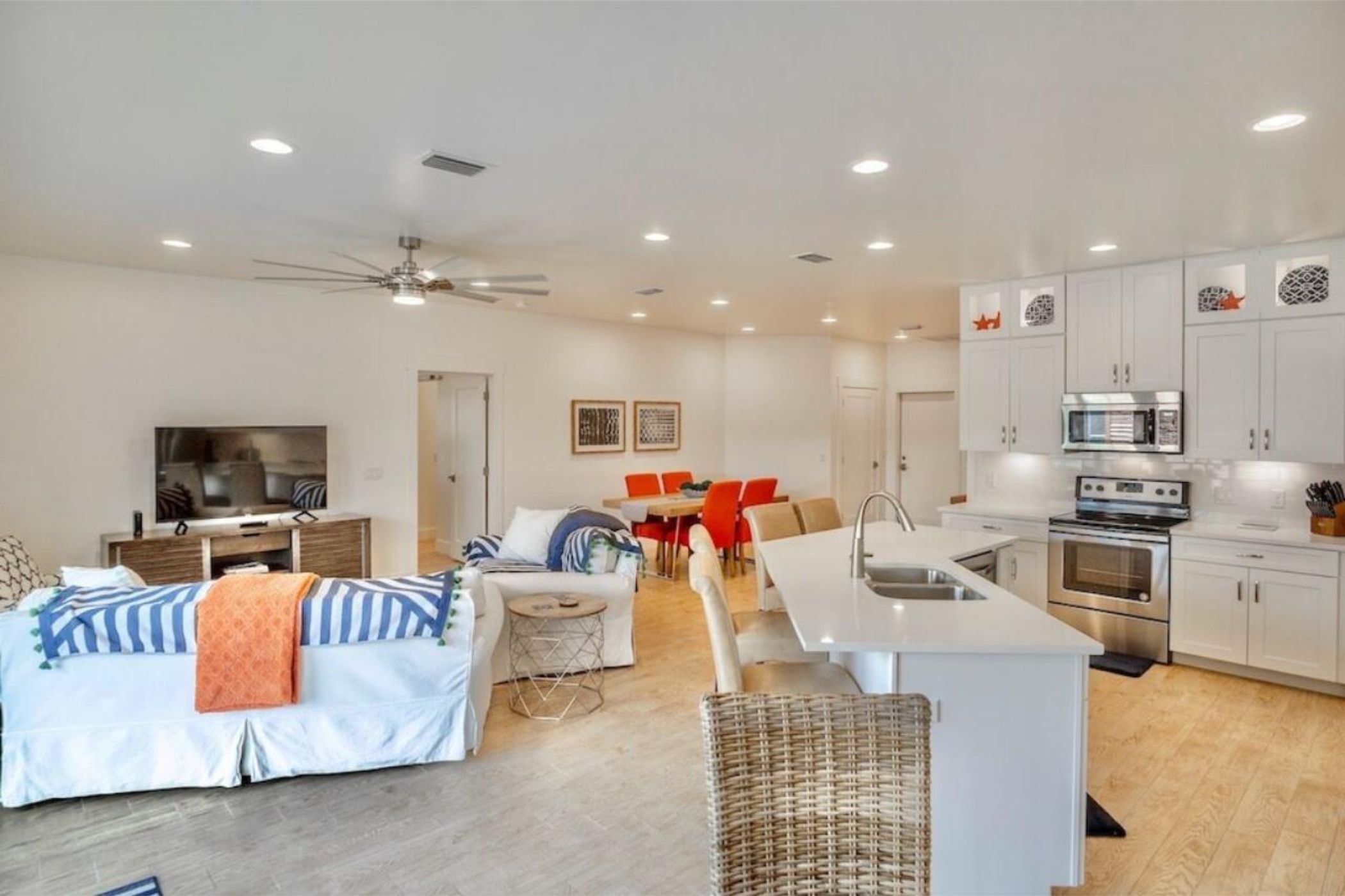 Take a short walk to the beach from this spacious "like new" home. The open living, dining and kitchen areas provide for lots of family time. The split bedroom floorplan offers places for every guest to relax and unwind. The master bedroom is large with a dresser, desk, King bed, walk in closet and ensuite bath. The second bedroom boasts a full bed and twin bed with ceiling fan. The third bedroom has a queen bed and sitting area. Comfortable furniture throughout the home means a relaxing time.