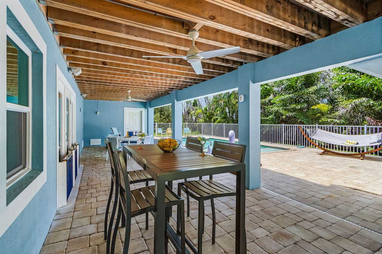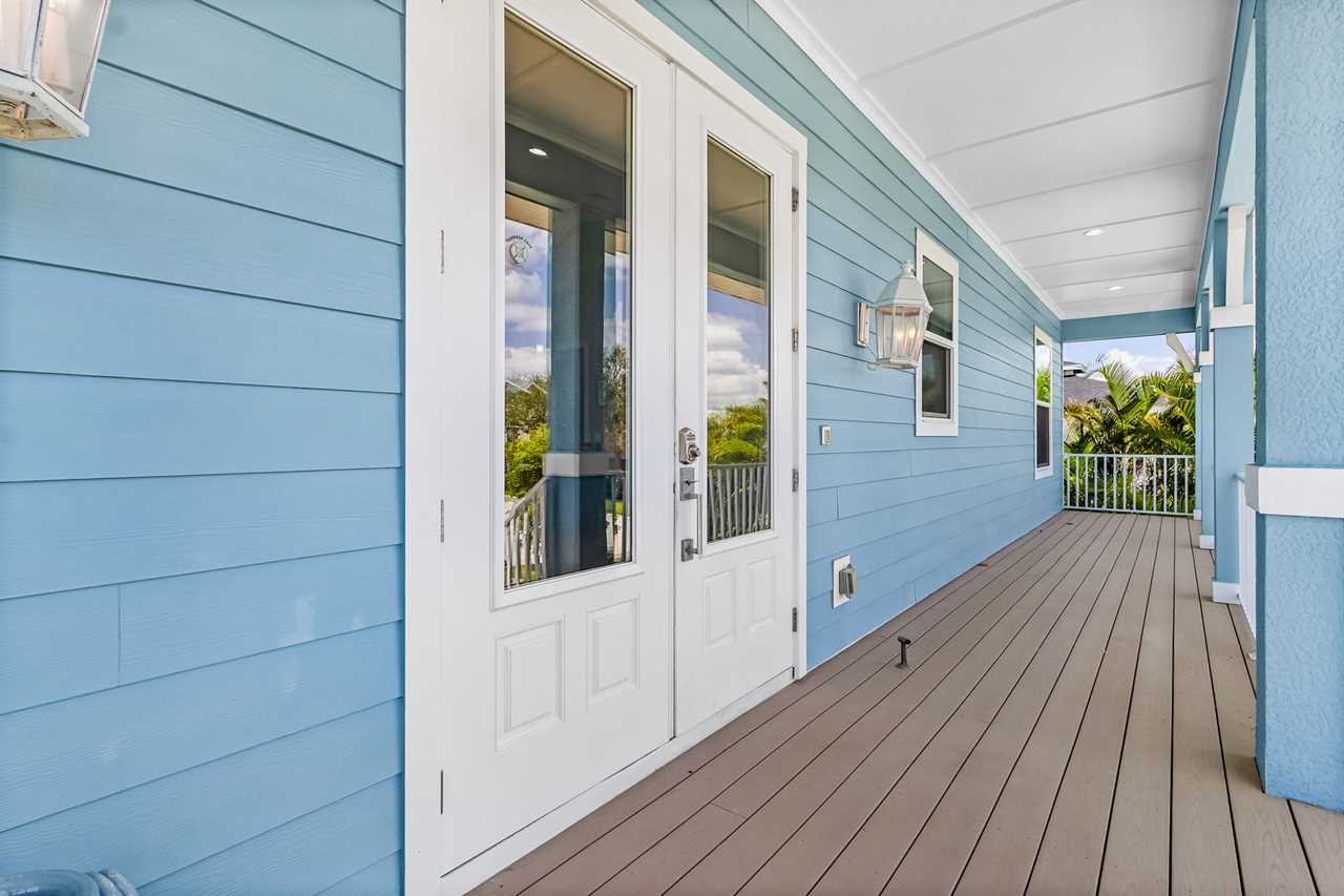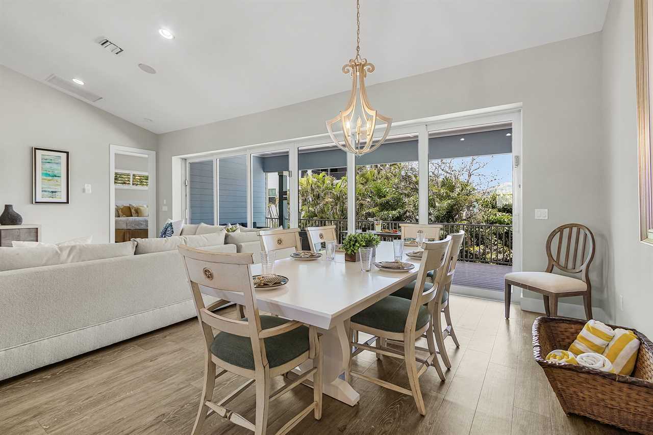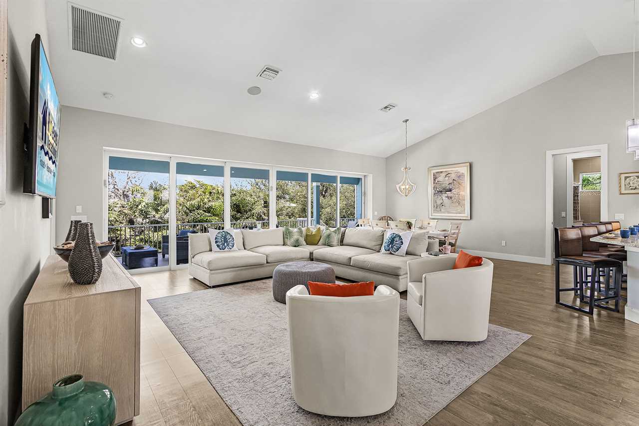 Open Concept Living & Dining: The heart of the home features a spacious kitchen with granite countertops, ample seating, and seamless access to the dining and living areas. A full wall of glass sliders leads to a wrap-around porch, offering stunning tropical views and gentle ocean breezes.