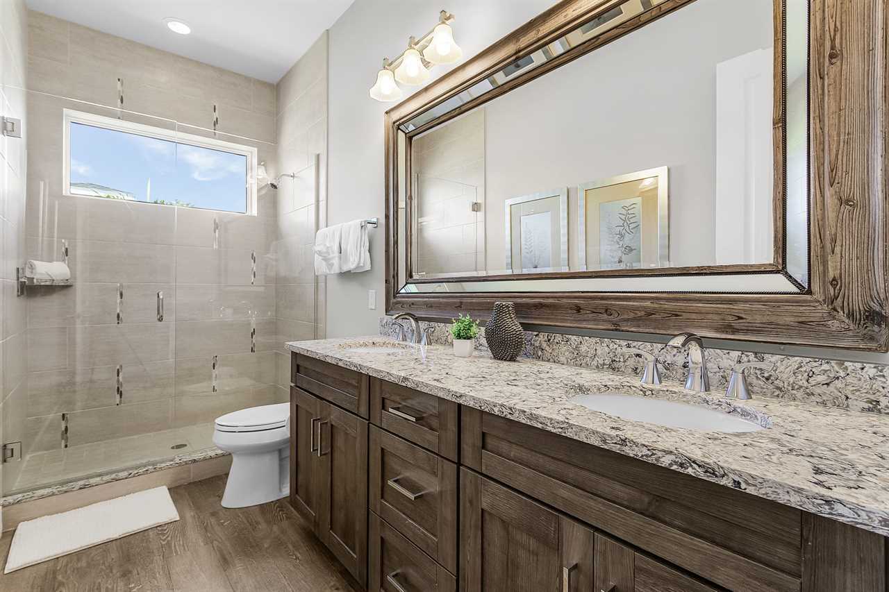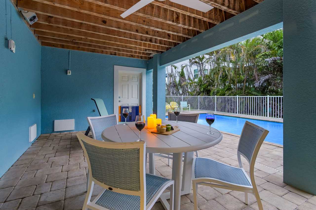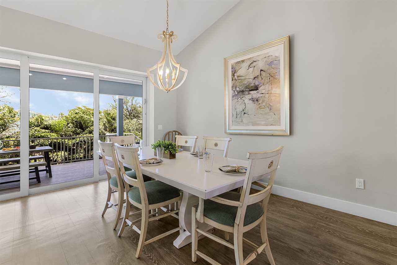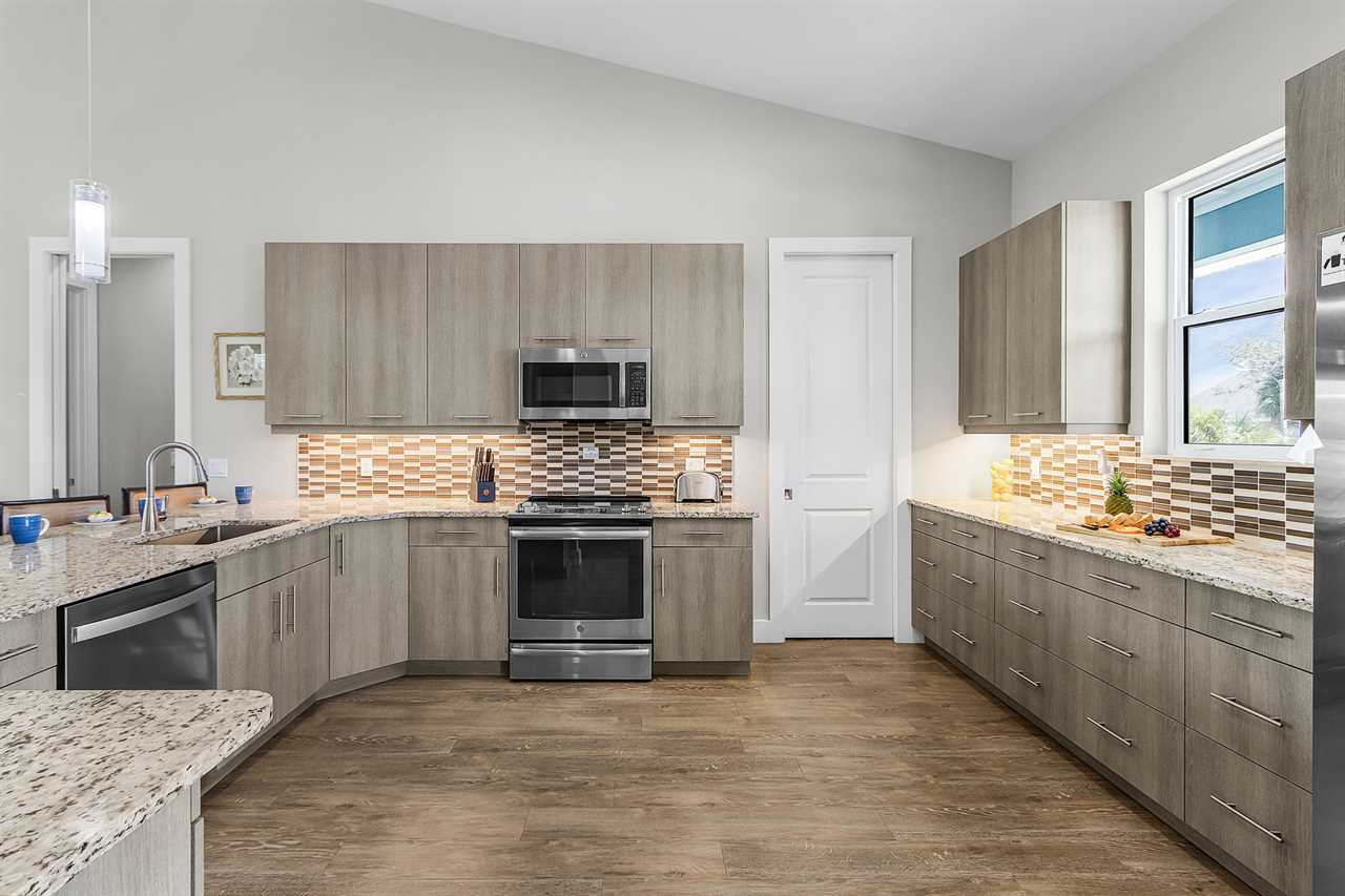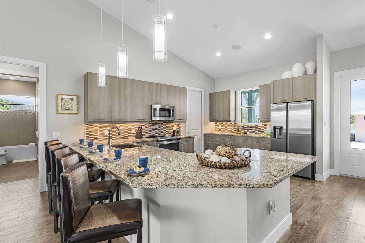 Open Concept Living & Dining: The heart of the home features a spacious kitchen with granite countertops, ample seating, and seamless access to the dining and living areas. A full wall of glass sliders leads to a wrap-around porch, offering stunning tropical views and gentle ocean breezes.
