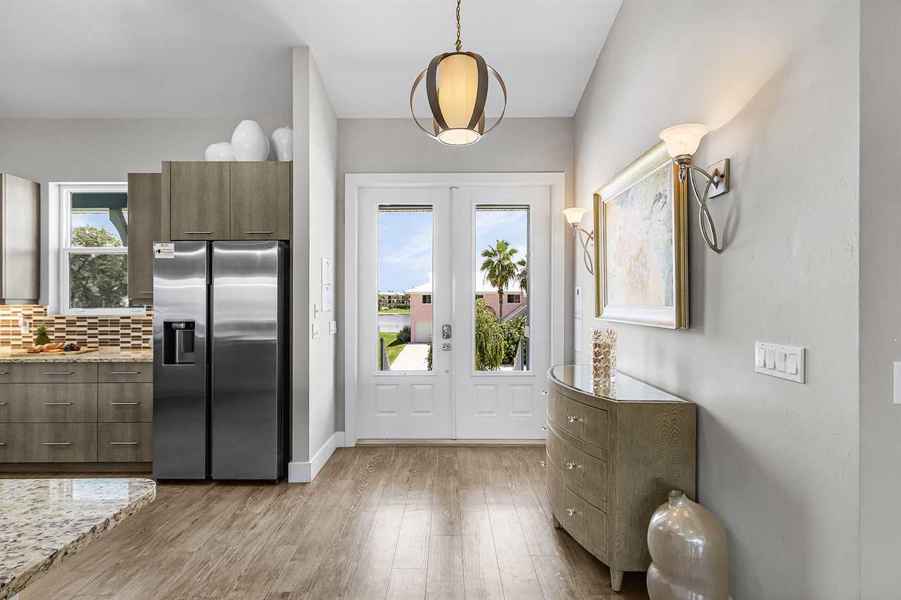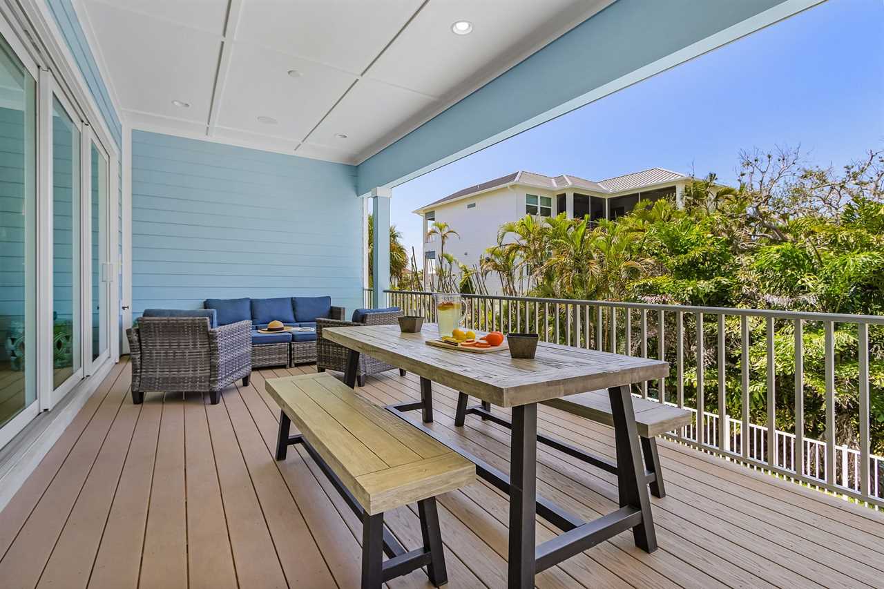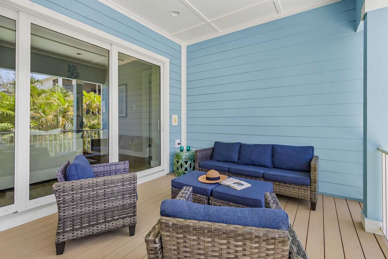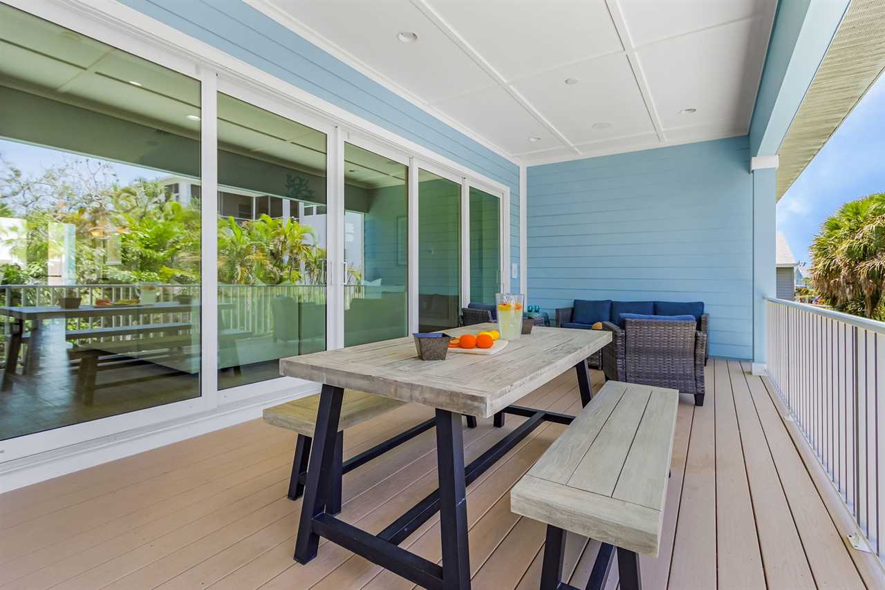 Open Concept Living & Dining: The heart of the home features a spacious kitchen with granite countertops, ample seating, and seamless access to the dining and living areas. A full wall of glass sliders leads to a wrap-around porch, offering stunning tropical views and gentle ocean breezes.