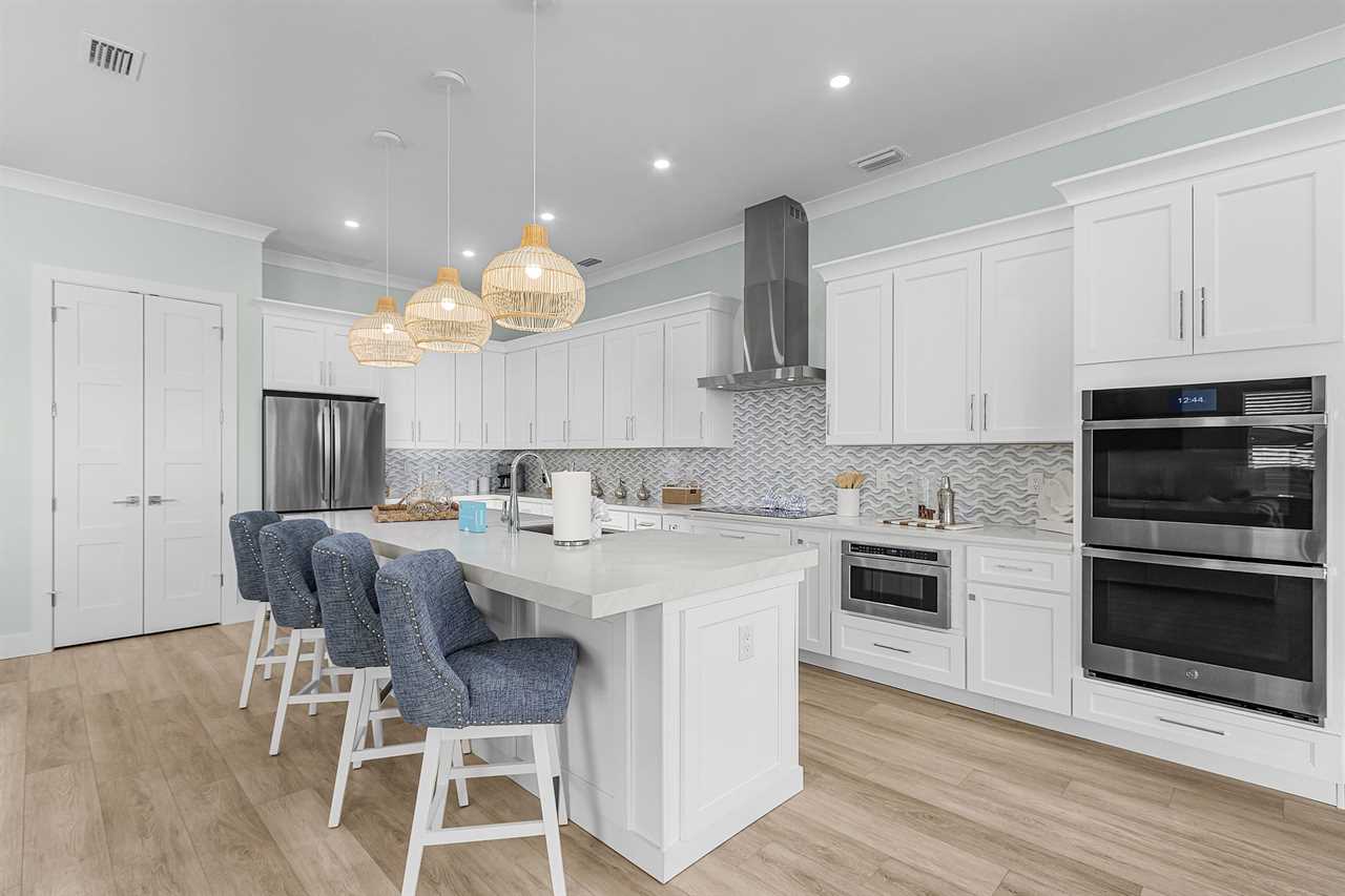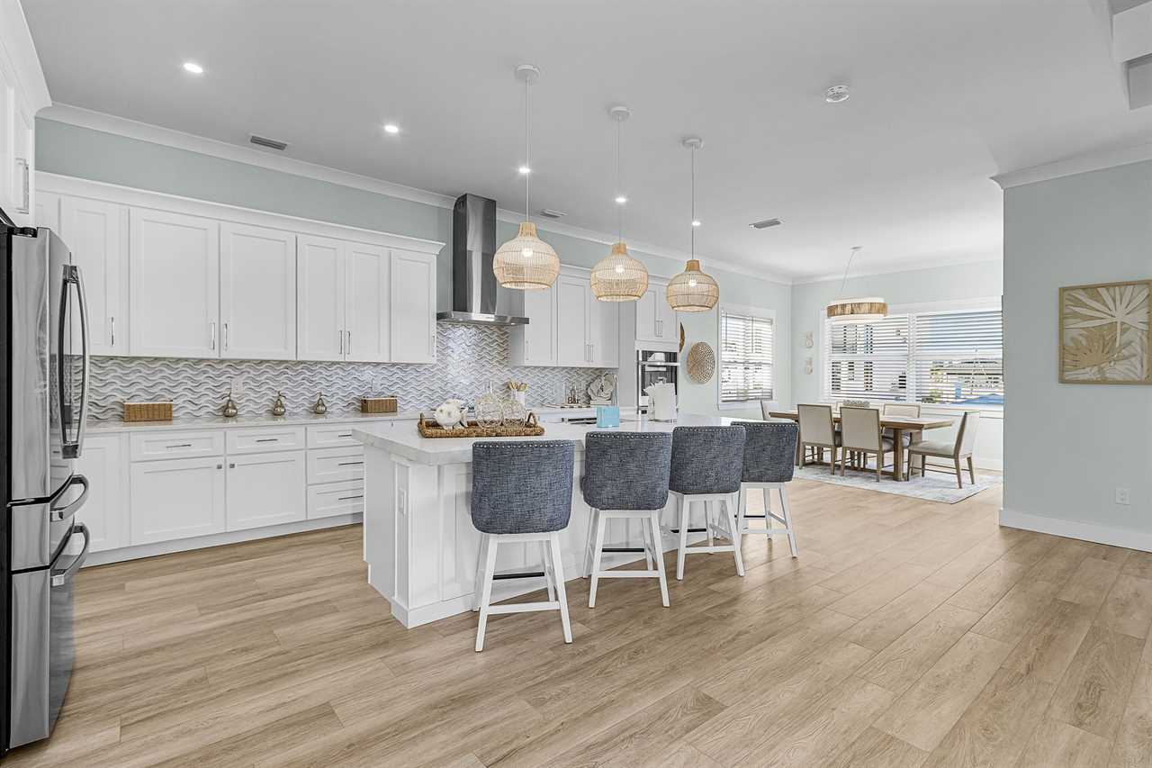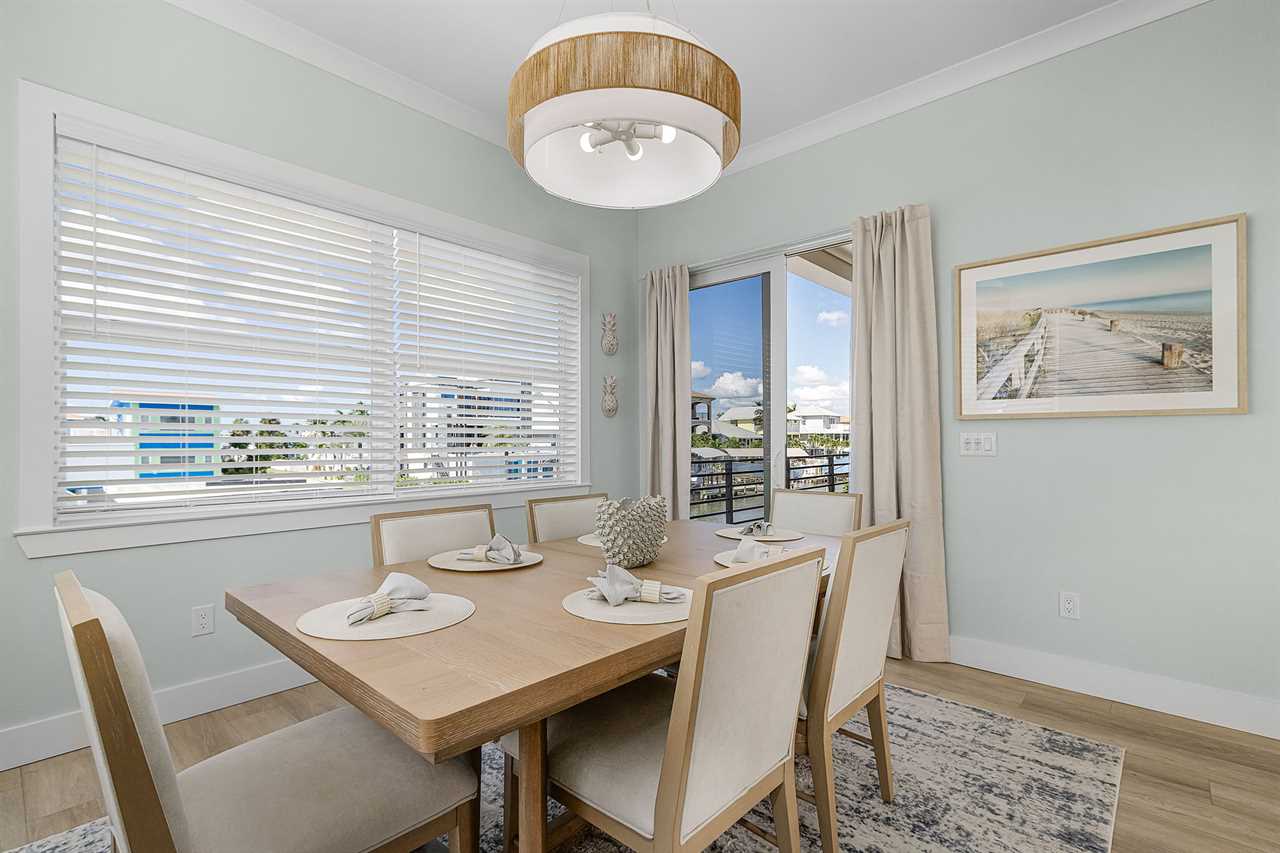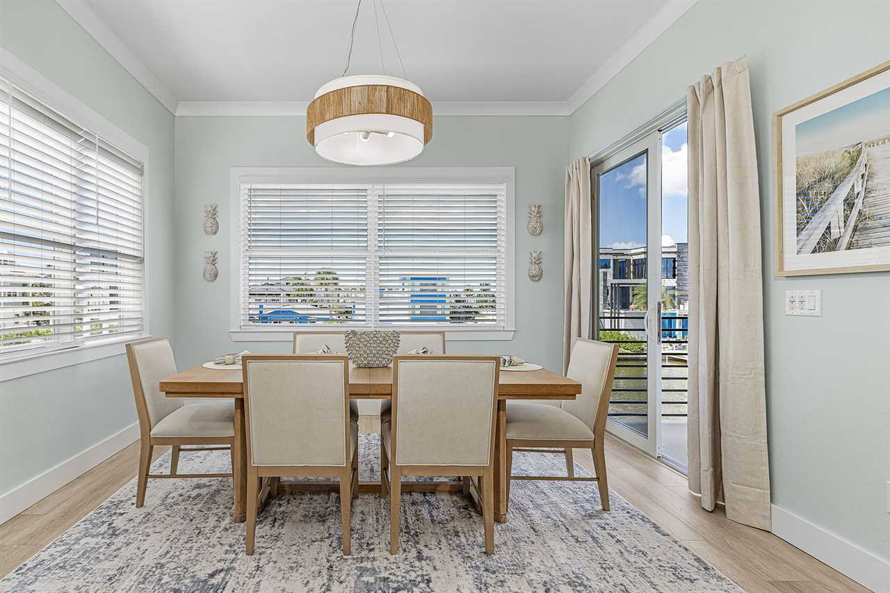 Inside, you'll find an inviting ambiance that blends modern elegance with coastal charm. The property boasts a beautiful canal view, allowing you to unwind while soaking in the serene surroundings. The open-concept living area on the second floor includes a pull-out sleeper sofa, offering extra flexibility for larger groups, while the well-equipped kitchen features a large island, refrigerator, oven, and all the essentials needed to prepare delicious meals. Guests can gather around the dining table or take their meals outdoors to the patio for al fresco dining.