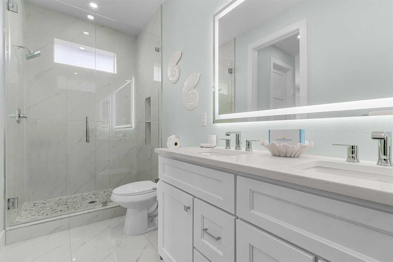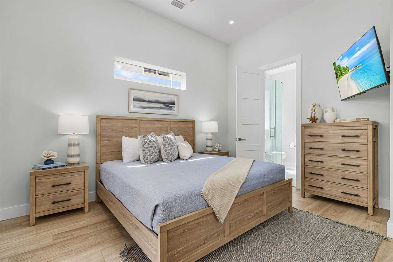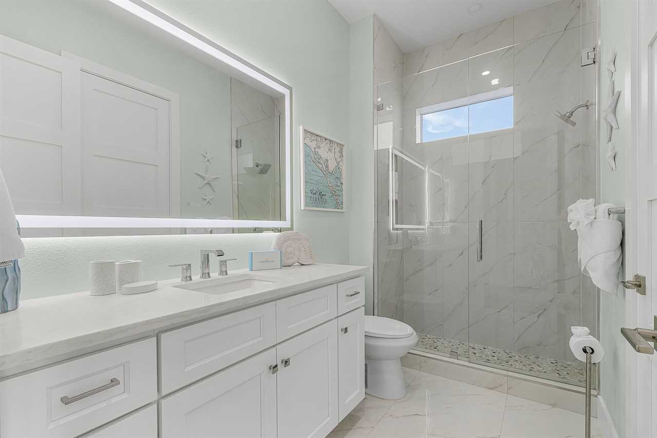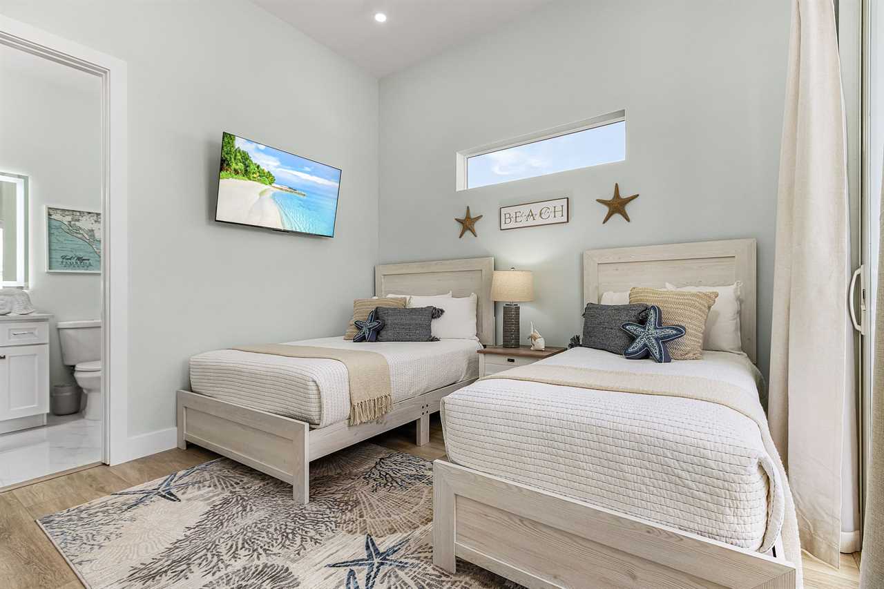 The home's thoughtful layout ensures comfort for everyone. On the second floor, one bedroom offers both a twin and a full bed with an ensuite bathroom featuring a walk-in shower, while another bedroom includes a king bed and ensuite bathroom with a shower/tub combo and dual sink vanity. On the third floor, there are three additional guest bedrooms with king beds—two with ensuite bathrooms that include walk-in showers and one with an ensuite bathroom featuring a shower/tub combo. The third floor also hosts the luxurious primary suite, complete with a king bed, a spa-like bathroom with a soaker tub, and a full walk-in shower room for the ultimate indulgence.