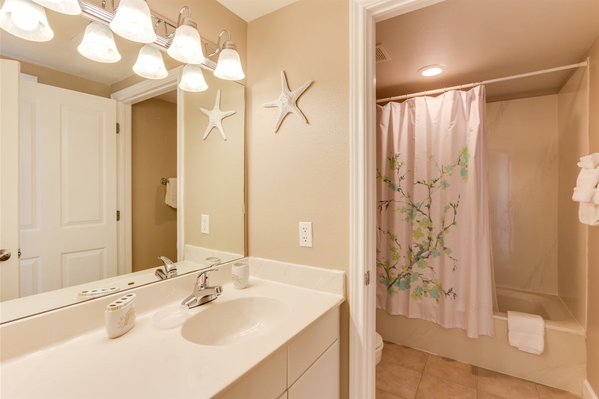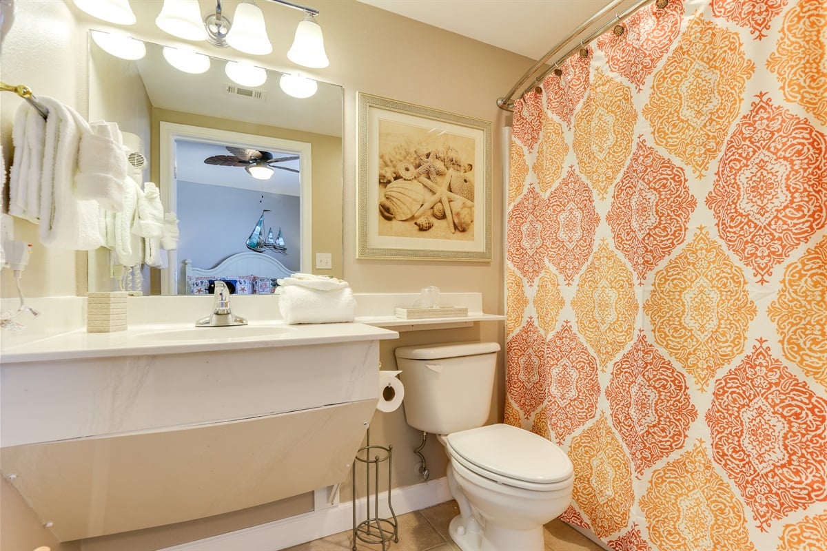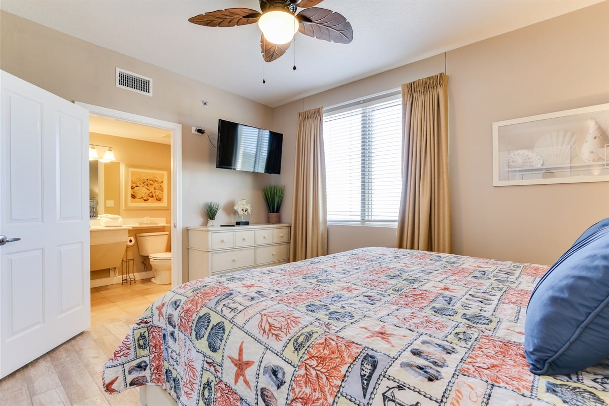 Step inside to find a spacious master bedroom with a king-size bed and a private ensuite bathroom coupled with a window overlooking the Gulf of Mexico. The middle bedroom has 2 comfortable twin beds with a bathroom that is accessible from the bedroom and the dining area. The 3rd bedroom, located near the entry door, has a cozy king-size bed with private bathroom. The living area includes a queen-size sleeper sofa for 2, comfortably accommodating up to 8 guests total.